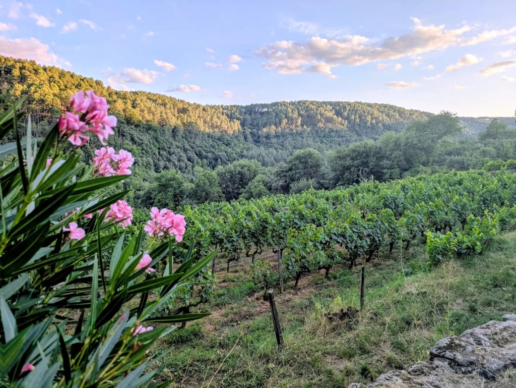 Der Stellplatz war schattig und mit einer schönen Aussicht auf die Weinberge, nah bei den Sanitäranlagen, dem Pool, beim Tischtennis, Boule und dem kleinen Restaurant und trotzdem für sich.