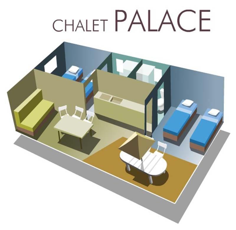 Quiet, shaded, away from the river, air conditioning. Composed of: 1 bedroom with a double bed, 1 bedroom with twin beds, 2 bathrooms (1 in each room) with toilets, convertible sofa bed in the living room, a kitchenette with refrigerator, microwave, 1 garden furniture, covered terrace. Chalets n° 96 to 99 Sheets and pillowcases not provided please bring your own.