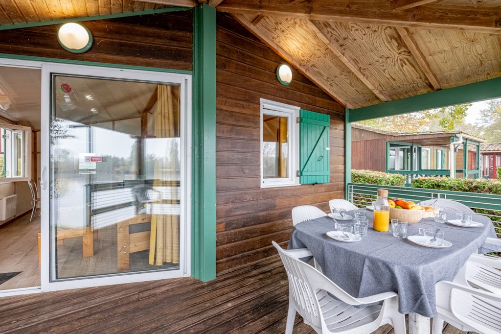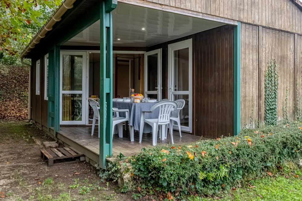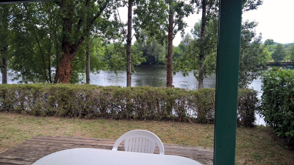 Stunning views of the river, shady, quiet, air conditioned. Composed of: 1 bedroom with a double bed, 1 bedroom with 2 twin beds, 1 kitchenette with fridge, microwave, bathroom and toilet, 1 sitting area with sofa, covered terrace and garden furniture. Chalets numbered 91 to 95 Sheets and pillowcases not provided please bring your own.