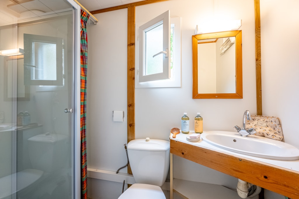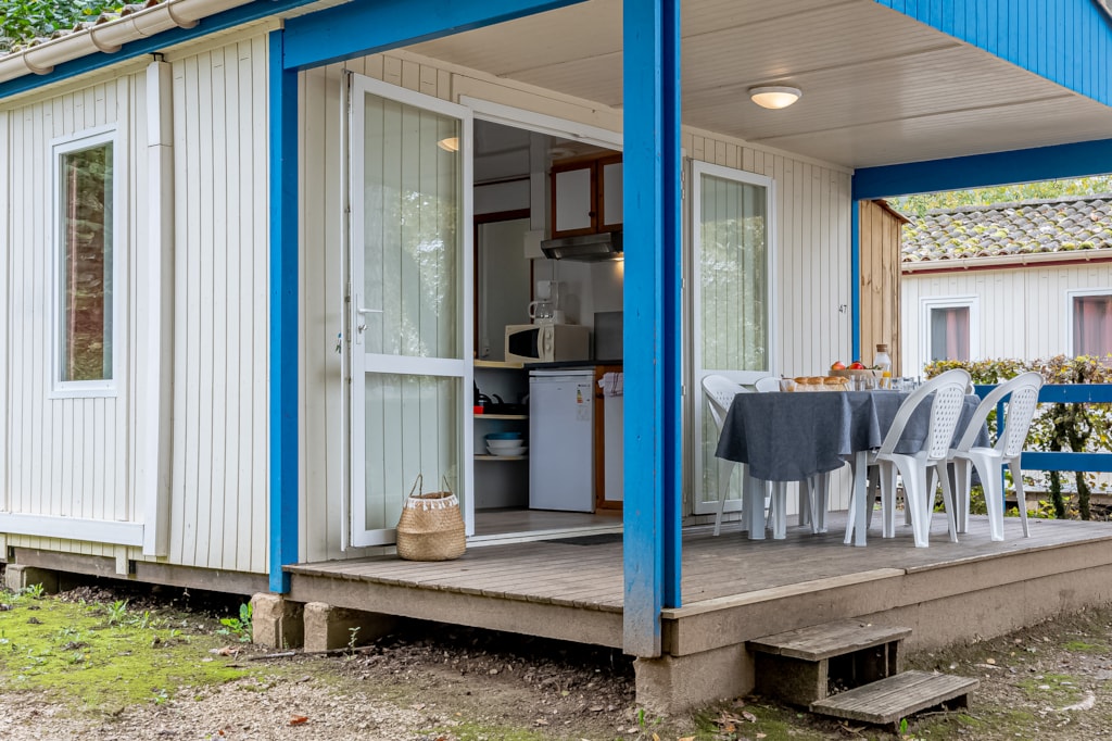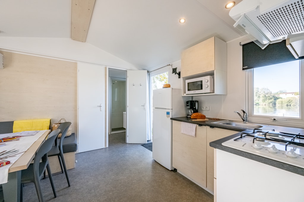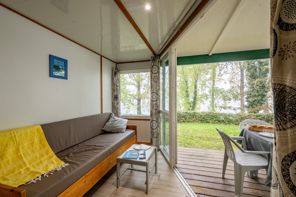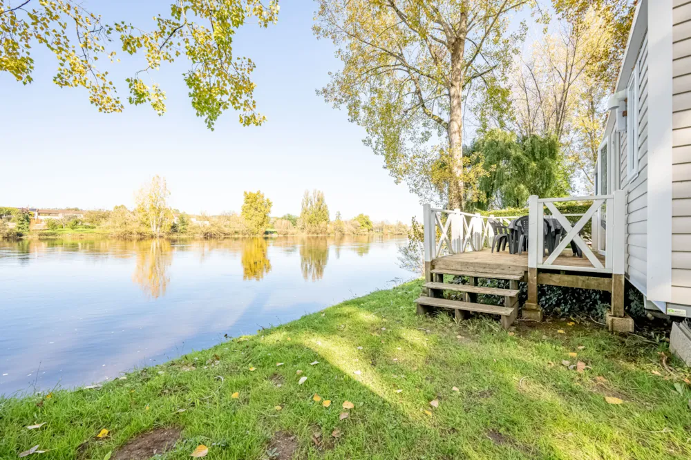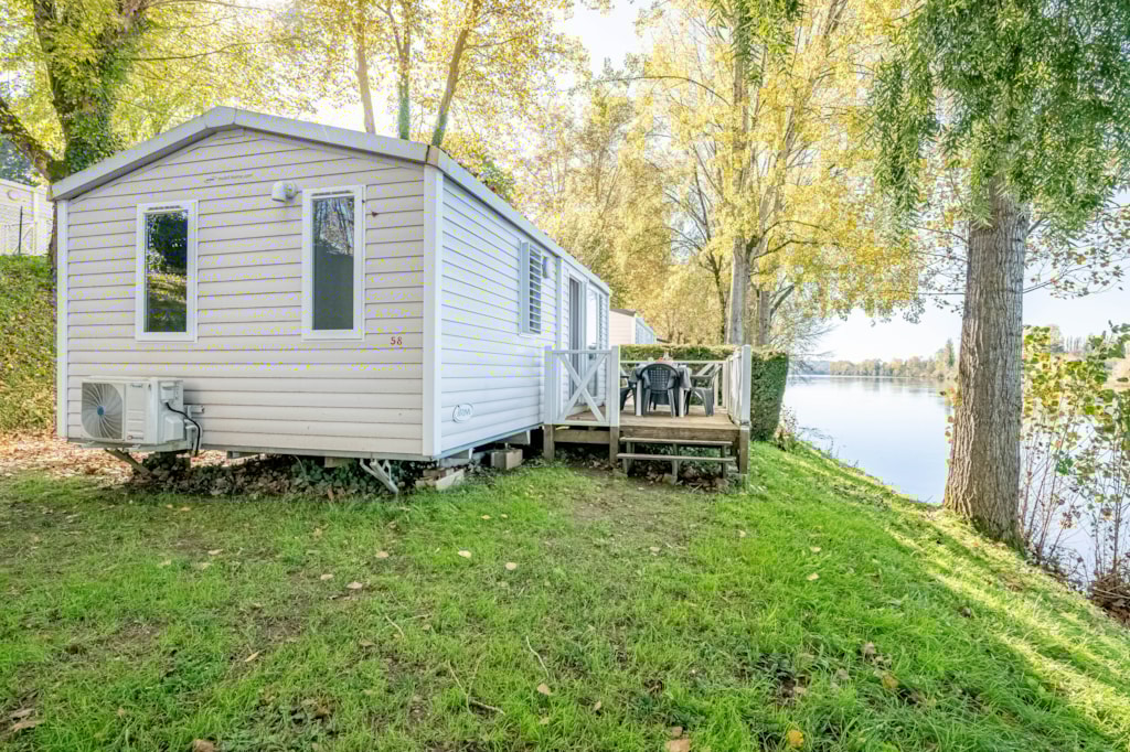 Located by the river. Air-conditioned rental composed of: 1 bedroom with 1 double bed, 2 bedrooms with twin beds. 1 kitchen, microwave, refrigerator, a sitting area with sofa, 1 bathroom (shower and sink), separate toilet and 1 terrace of 12 m² with garden furniture. Mobile home number 3 to 5. Sheets and pillowcases, not provided please bring your own.