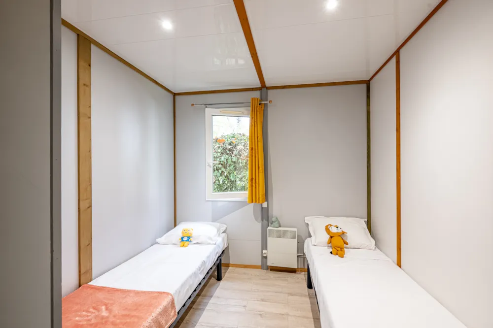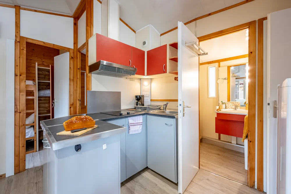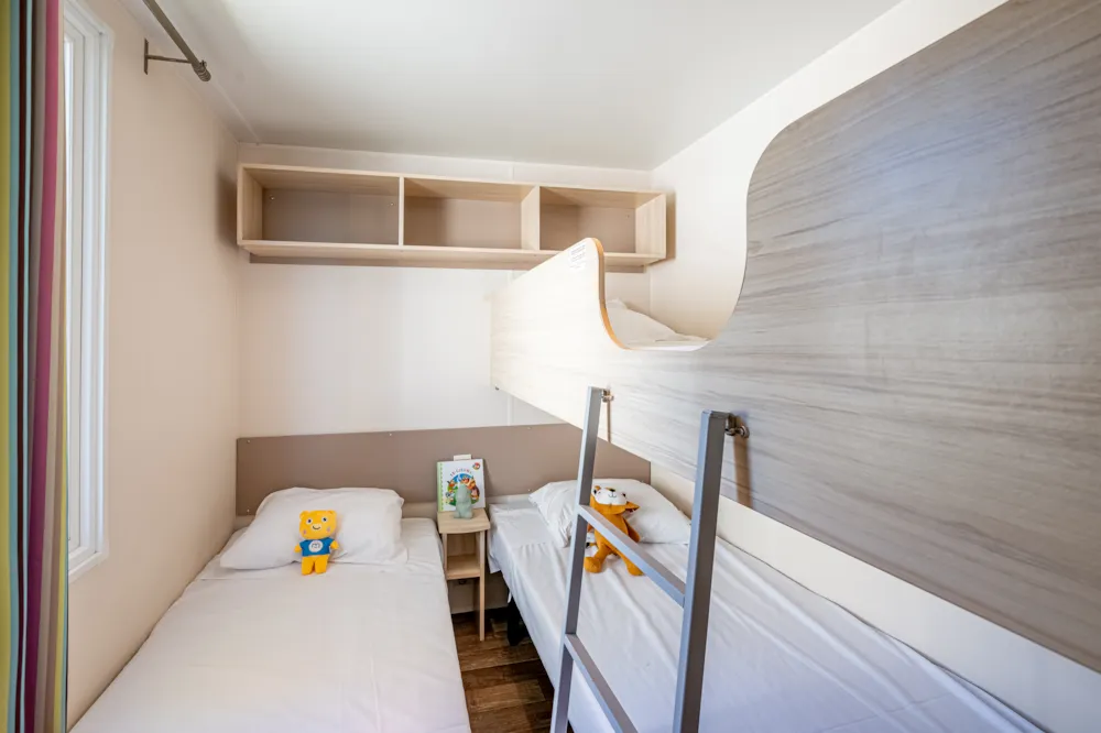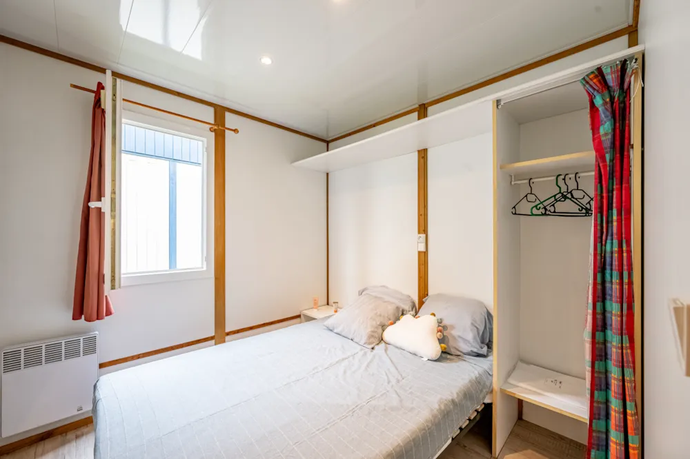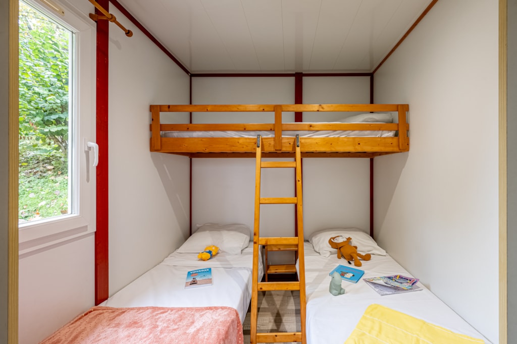 Located by the river. Air-conditioned rental composed of: 1 bedroom with 1 double bed, 1 bedroom with 3 single beds (twin beds + bunk bed), 1 kitchen, microwave, fridge, living area, sitting area with convertible sofa, 1 bathroom (shower and sink), separate WC and 1 terrace of 12 m². Mobil home 0, 1 and 2 on the map sheets and pillowcases not provided please bring your own.