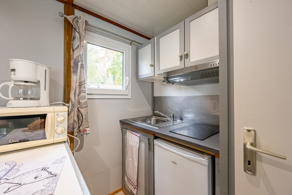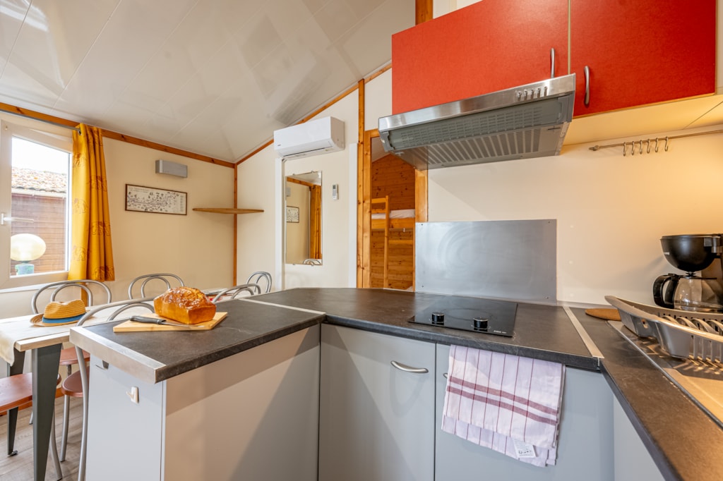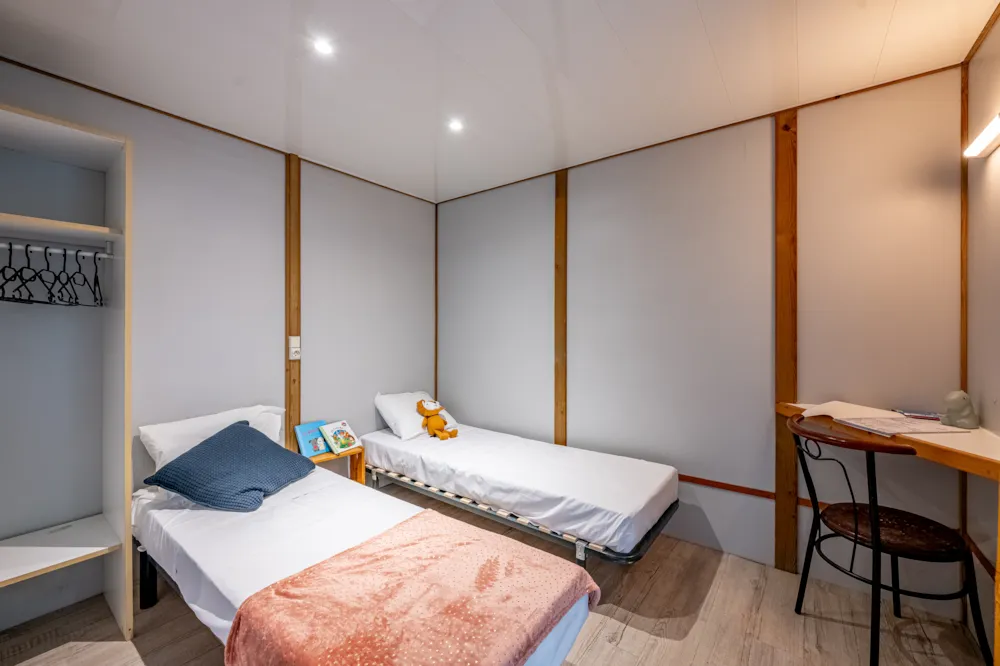 Small cottage located near the activities, shaded, view on the river, air-conditioned. Composed of: 1 bedroom with double bed, 1 bedroom with twin beds + 1 bunk bed (only children in this room), 1 kitchenette with fridge, microwave. Bathroom and toilet, a covered terrace with garden furniture. Chalets n° 45 to 50. sheets and pillowcases not provided please bring your own.