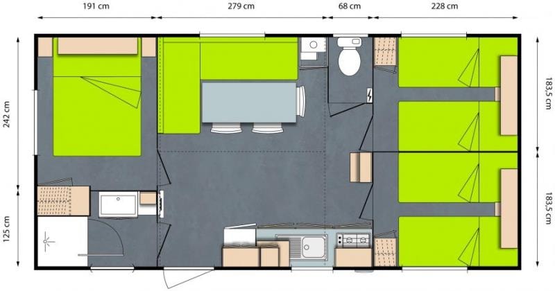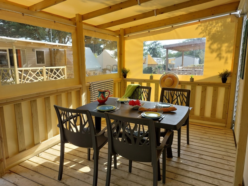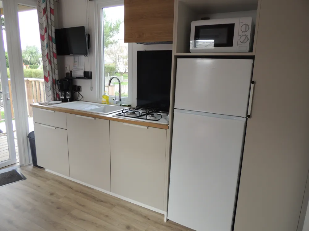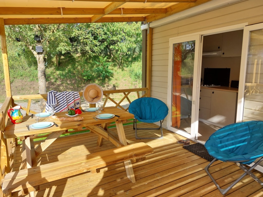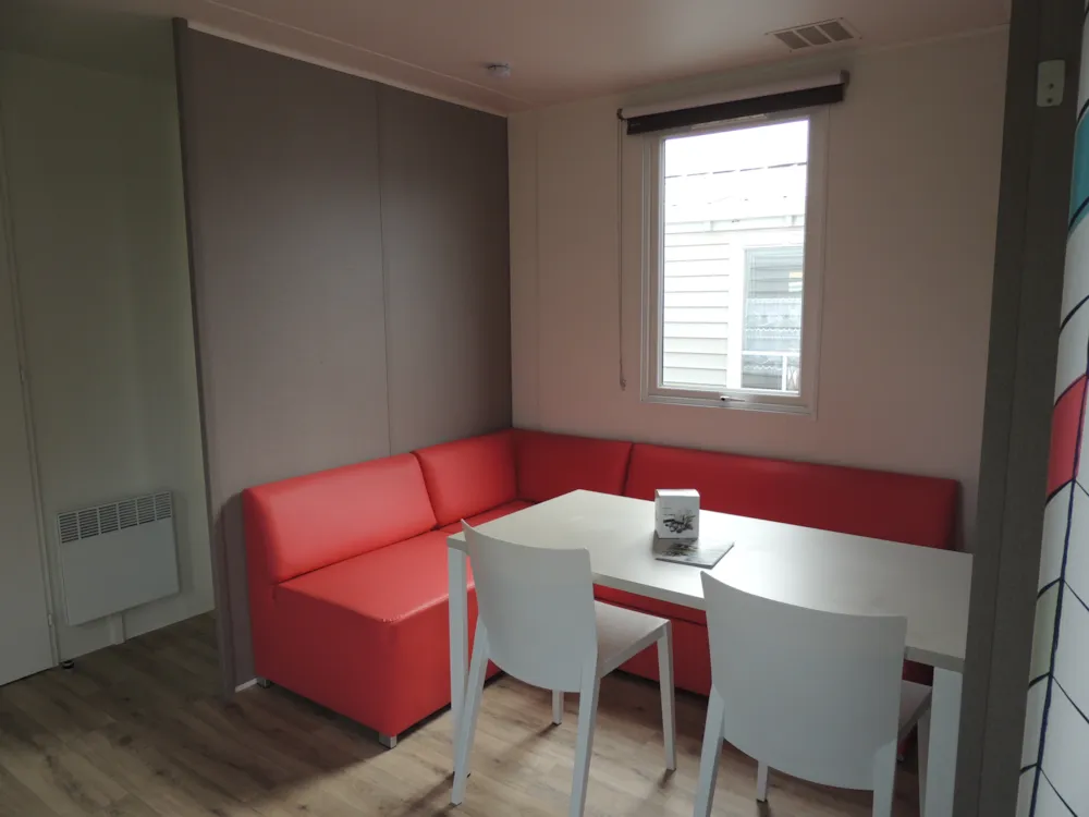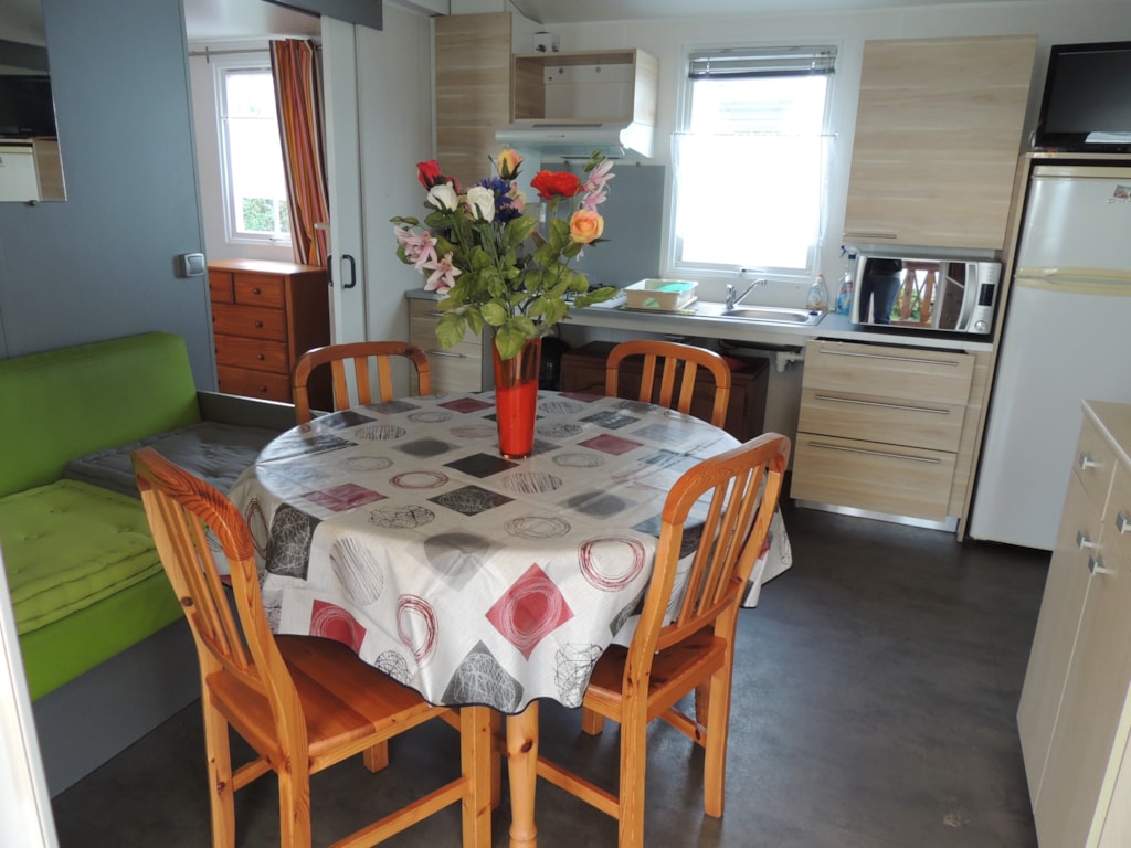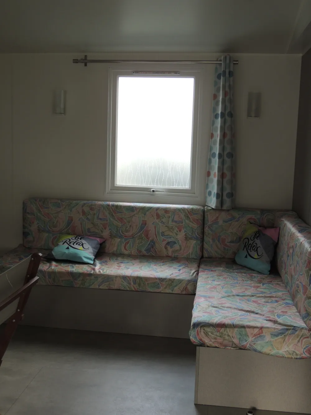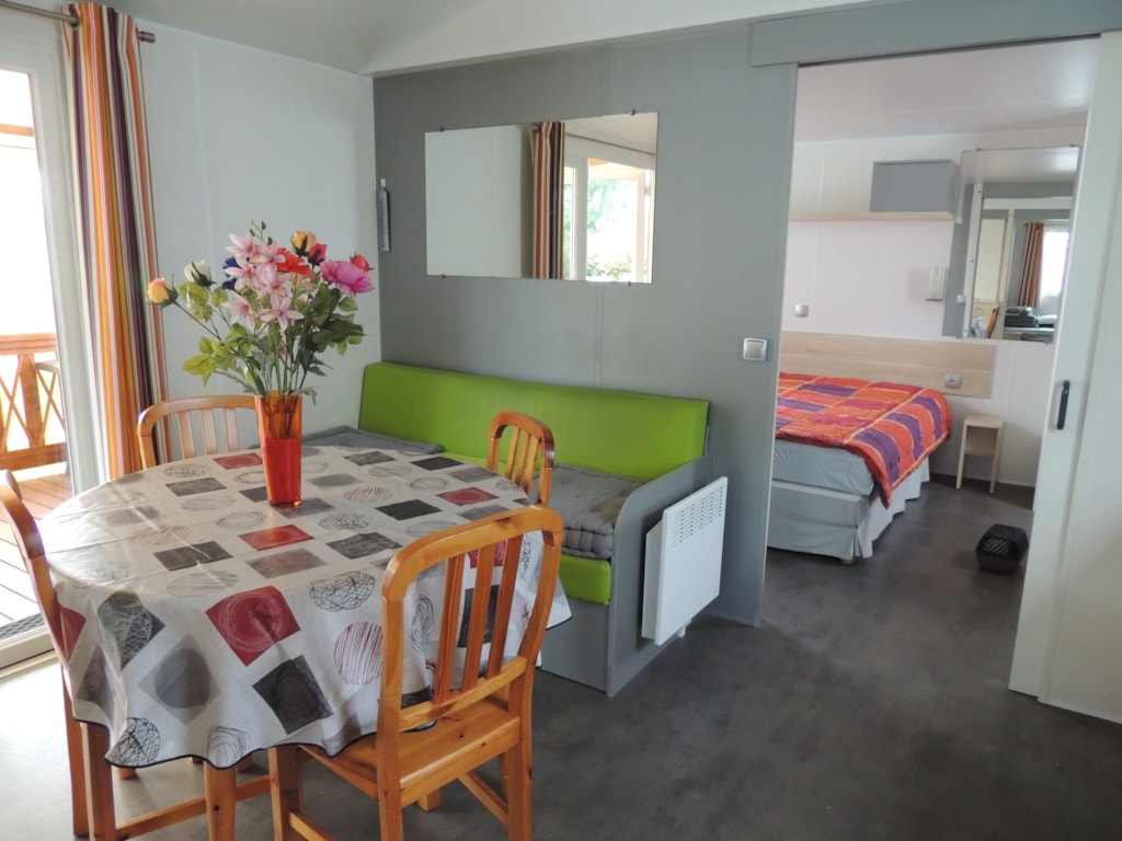 Mobil home spacieux de 26 m2 comprenant 2 chambres pouvant accueillir jusqu'à 4 personnes. Les couchages sont composés d'un lit double et de 2 lits simples. Vous aurez 3 espaces différenciers dans la pièce de vie: 1 coin cuisine, 1 espace salon et 1 espace repas. A l'extérieur vous pourrez apprécier la terrasse couverte lors de vos moments de détente.