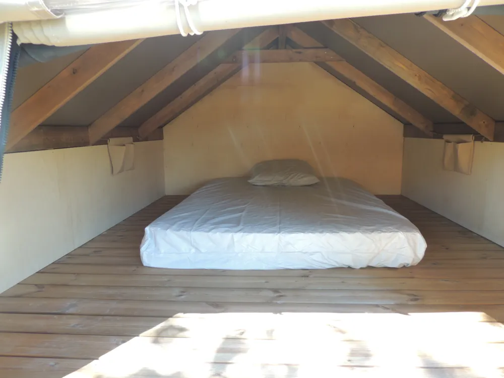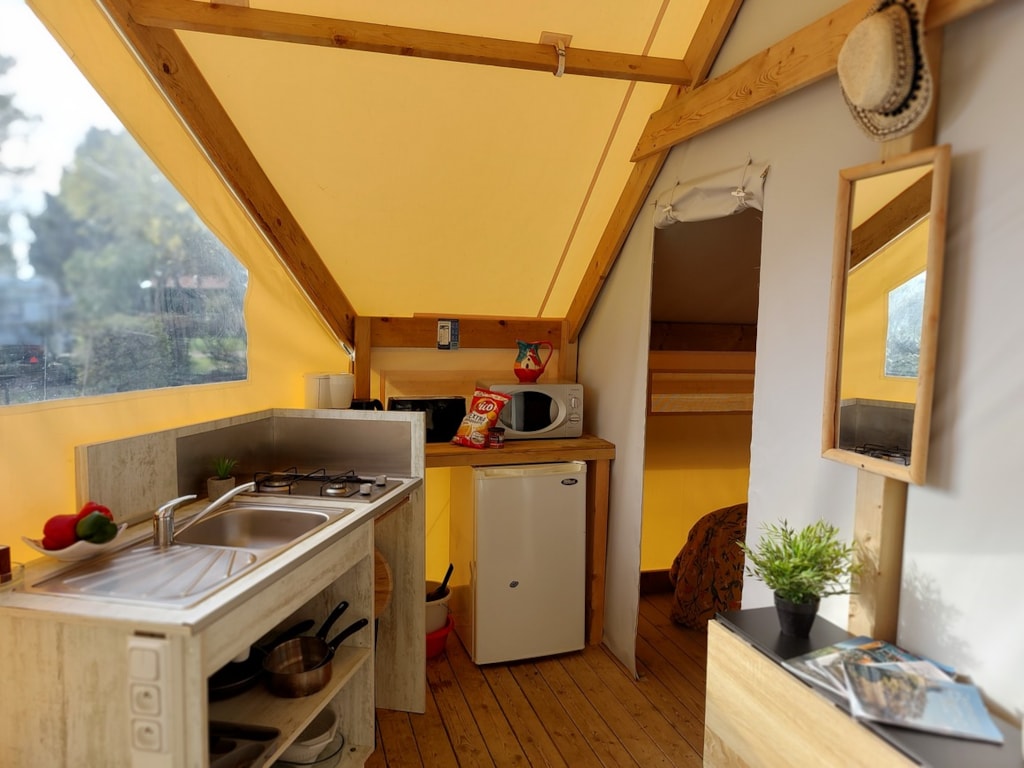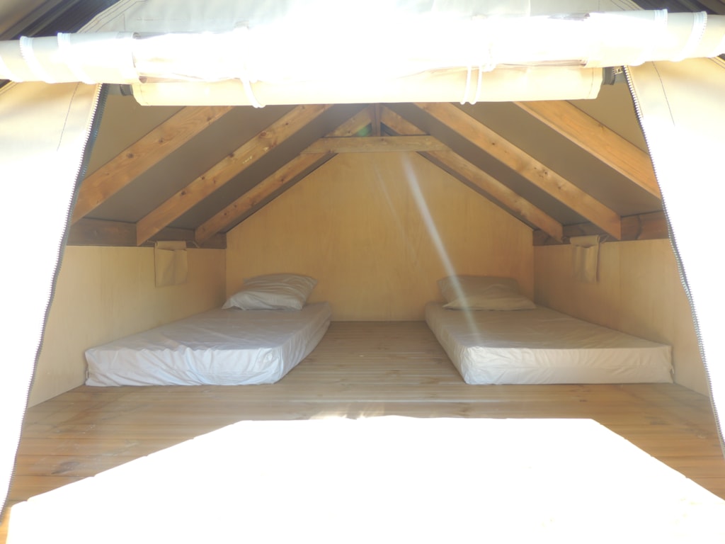 Unterkunft aus Holz und Segeltuch, auf einer vom Boden erhöhten Terrasse platziert, mit Matratze; Kissen und Decken. Dort finden Sie sich unter „Abenteuerbegleitern“ wieder. Sie können auch essen, ohne sich bewegen zu müssen. Bevor Sie losfahren, müssen Sie die Batterien aufladen. Wir bieten Ihnen ein reichhaltiges Frühstück zu einem für Sie passenden Zeitpunkt an. Wir bieten auch ein Frühstückspaket mit Heißgetränk, Gebäck, Brot, Butter, Marmelade und Orangensaft an. Am Abend Ihrer Ankunft können Sie in den Optionen auch ein warmes Verpflegungspaket mit Pizza, Croque Monsieur/Salat oder Burger/Pommes und einem Getränk Ihrer Wahl sowie für Kinder Nuggets oder Schinken/Pommes, 1 Kugel Eis und a buchen Trinken Sie Vittelsirup