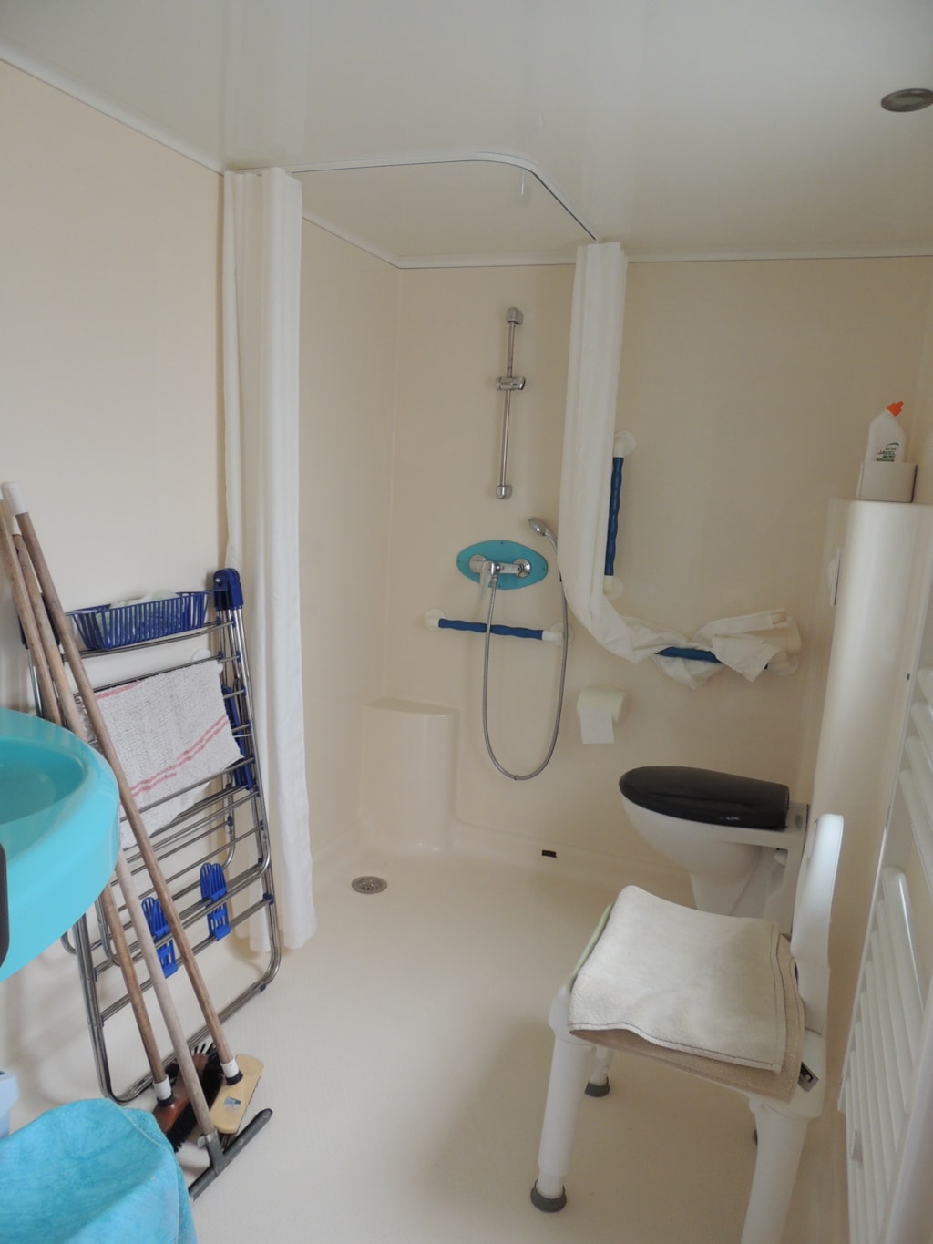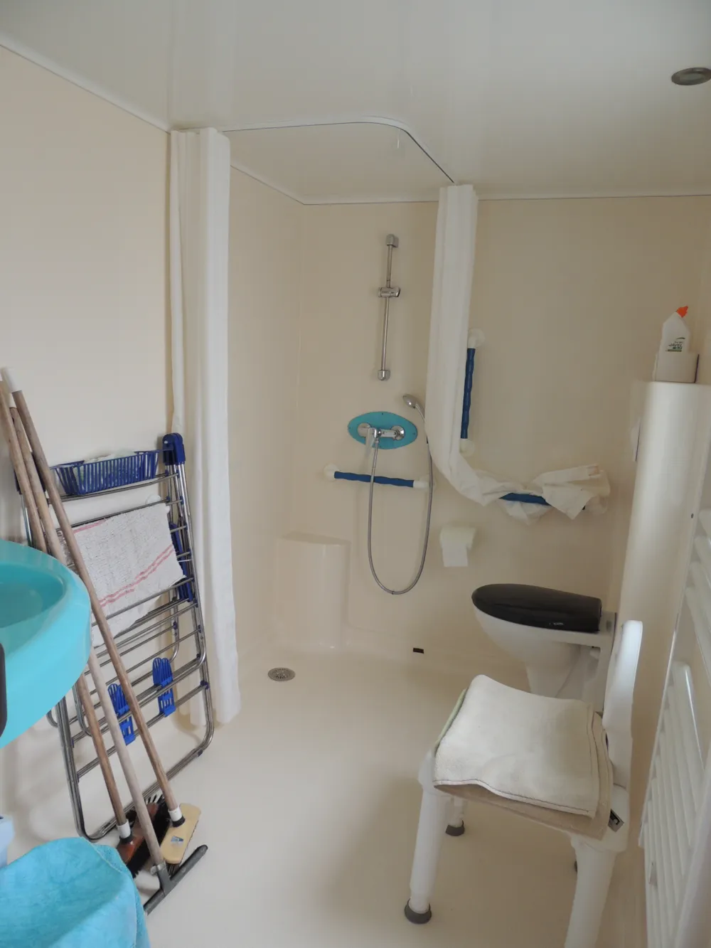 mobile home accessible aux personnes à mobilité réduite, composée de 2 chambres, salle de bain avec douche à l'italienne, tout équipé, d'une surface d'environ 34M2. Une grande terrasse couverte est accessible par la rampe d'accès.