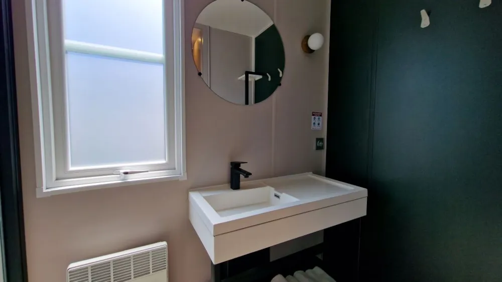 Etwas mehr Ausstattung (Regale) im Sanitärhaus.