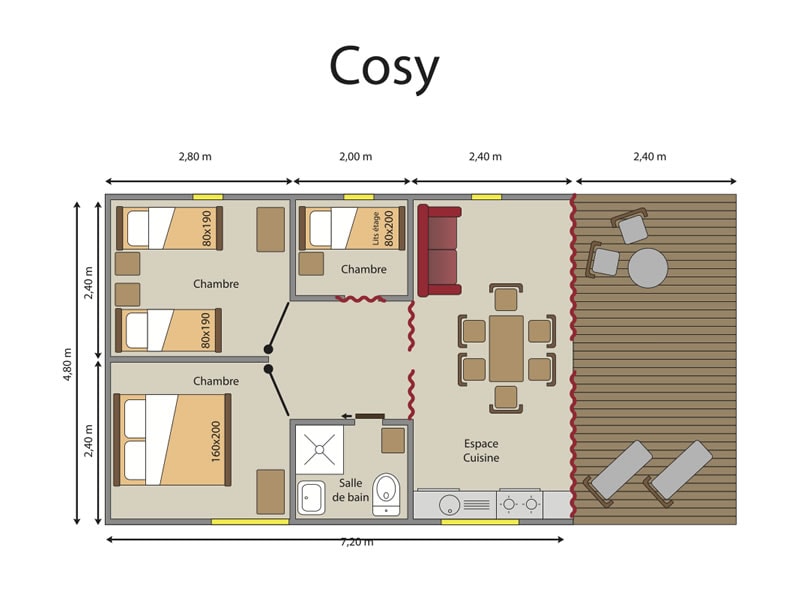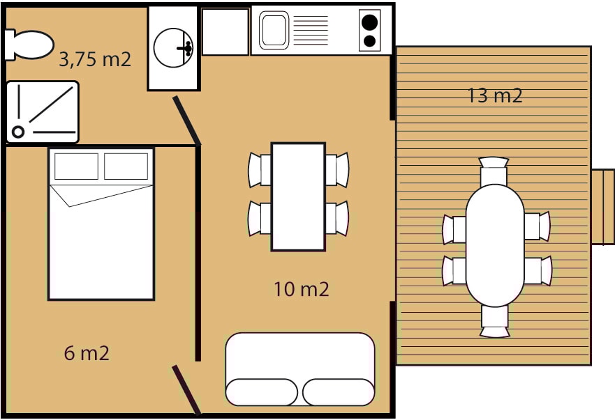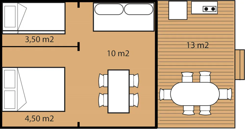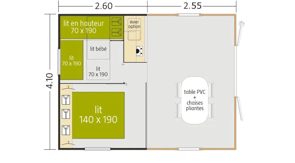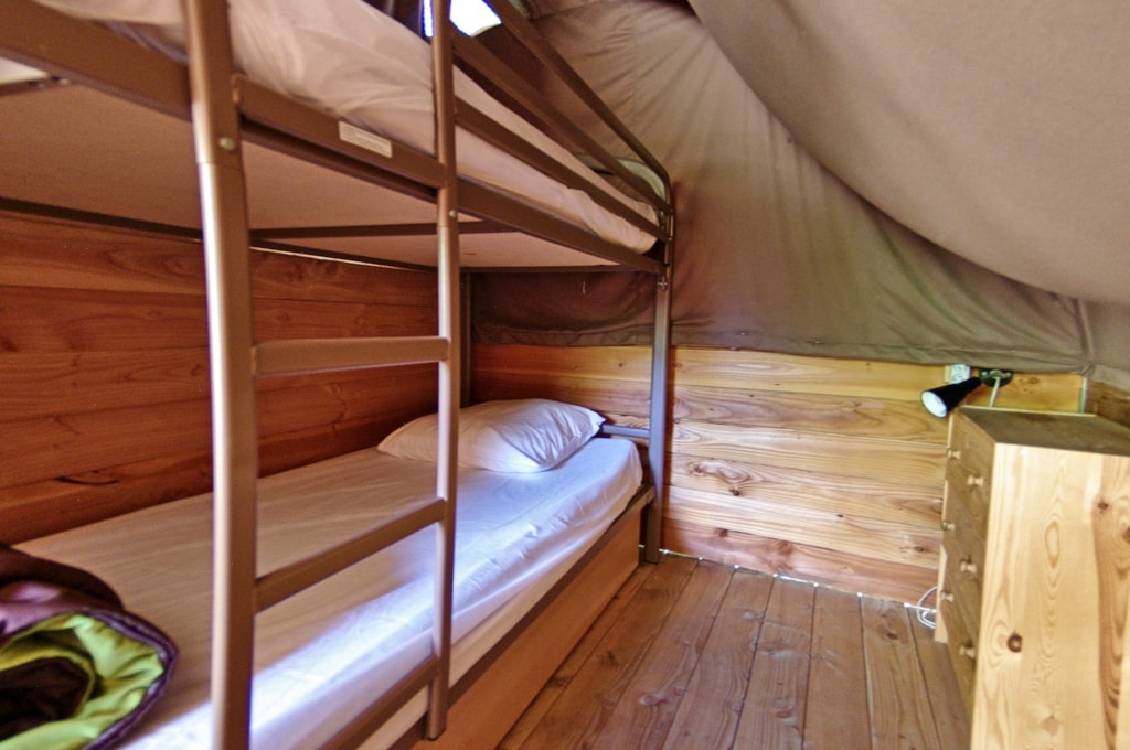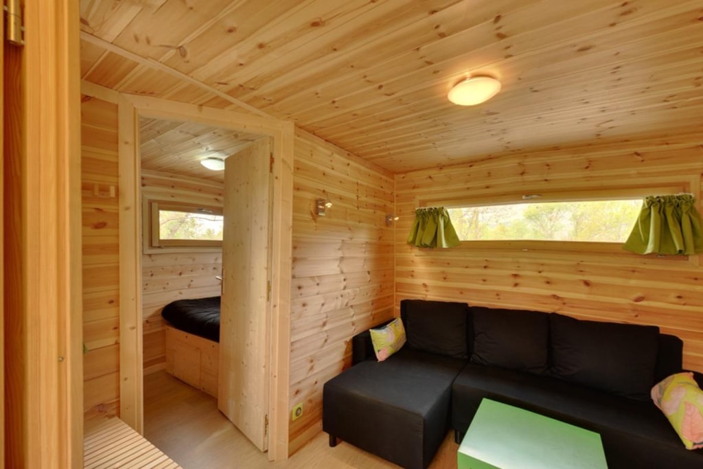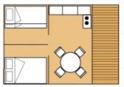 Les Tithomes c'est le camping malin et fonctionnel. Avec 2 chambres et une pièce à vivre, vous trouverez l'essentiel pouor passer des vacances à prix doux. Elles offrent une literie en dur ainsi qu'un espace cuisine (frigo, plaques de cuisson, four micro-ondes) tout en recréant une atmosphère simple et proche de la nature. Vous trouverez un petit séjour avec coin cuisine ainsi qu'une belle terrasse en bois. Les Tithomes sont équipés de 5 couchages maximum et sont sans sanitaire.