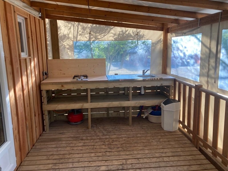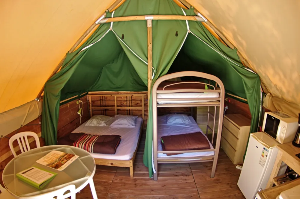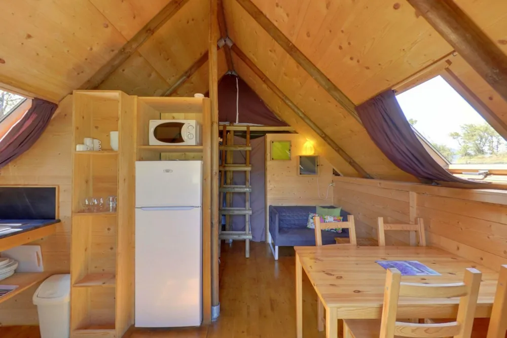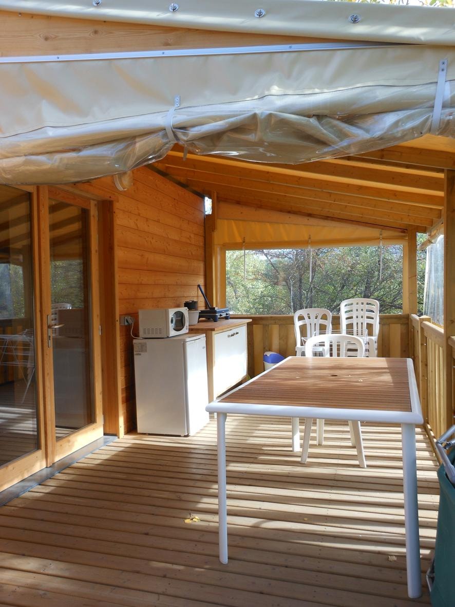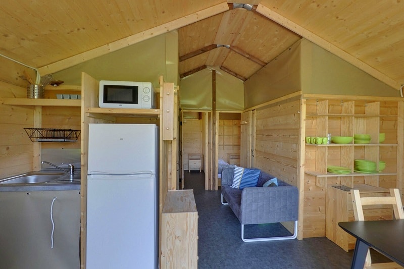 Produit novateur et écologique, nos tentes semi-rigides sont un excellent compromis entre le chalet tout équipé et la tente traditionnelle. Elles offrent un certain confort tout en recréant l’atmosphère simple et proche de la nature du camping. Ces tentes proposent un petit séjour avec coin cuisine ainsi qu’un belle terrasse en bois.