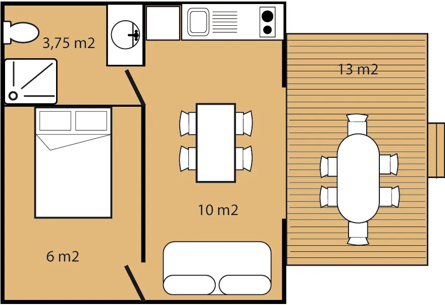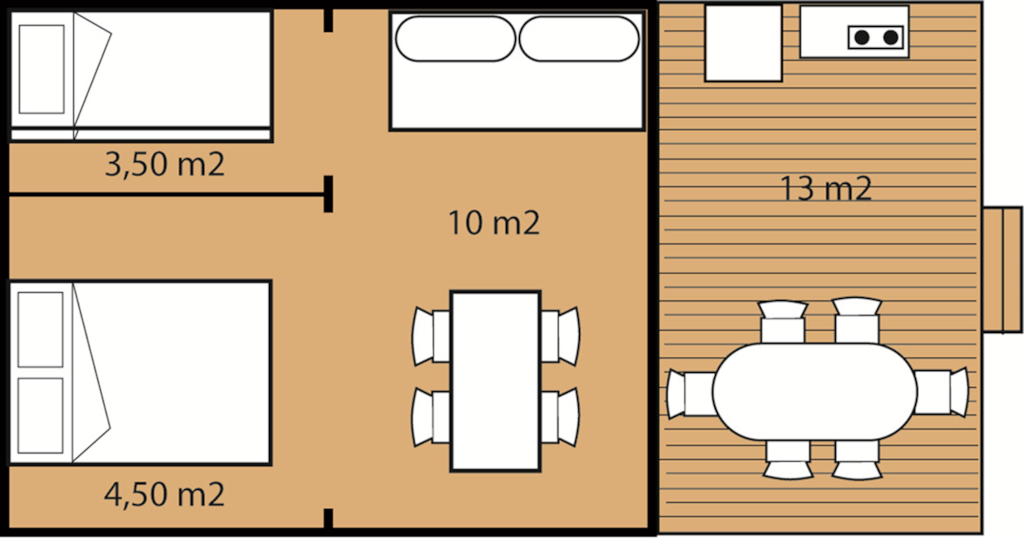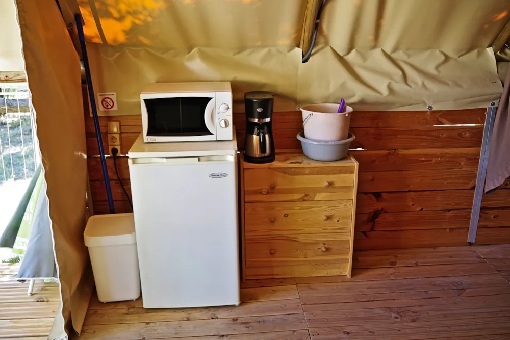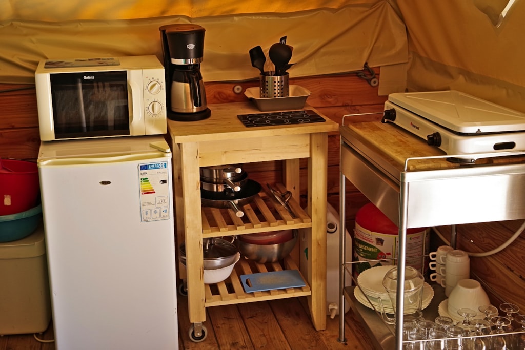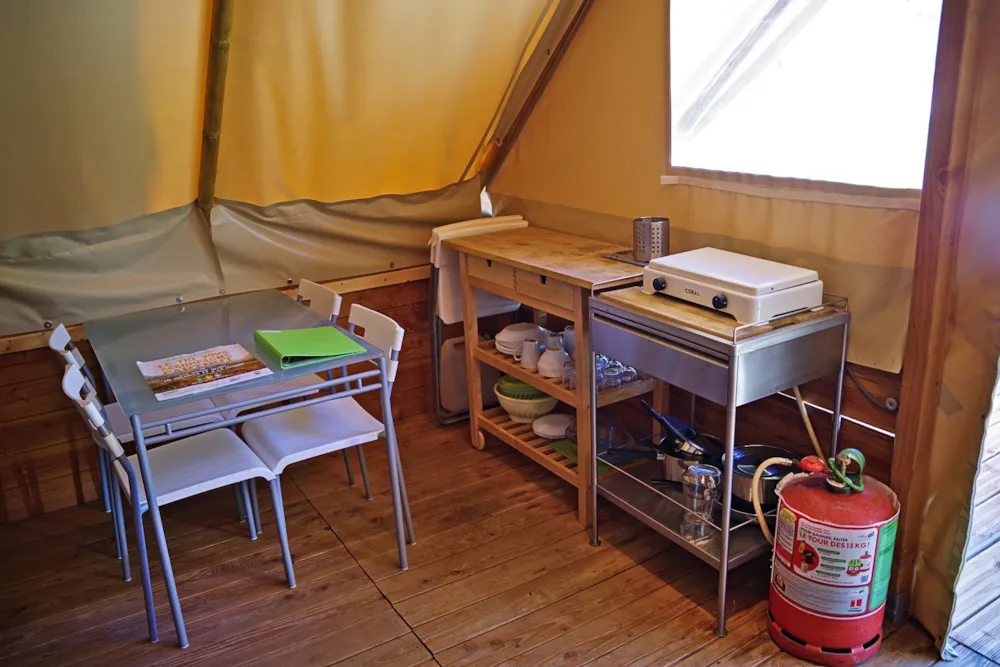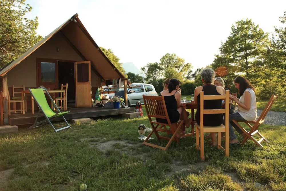Produit novateur et écologique, nos tentes semi-rigides sont un excellent compromis entre le chalet tout équipé et la tente traditionnelle. Elles offrent un certain confort tout en recréant l’atmosphère simple et proche de la nature du camping. Ces tentes proposent un petit séjour avec coin cuisine ainsi qu’un belle terrasse en bois.