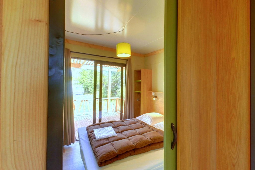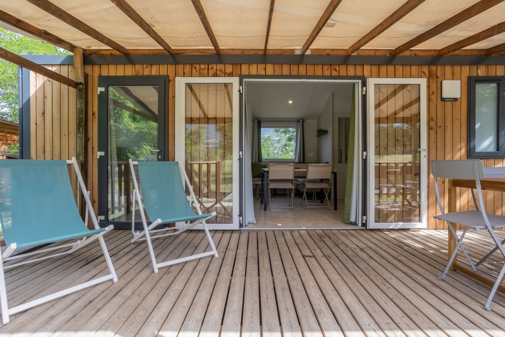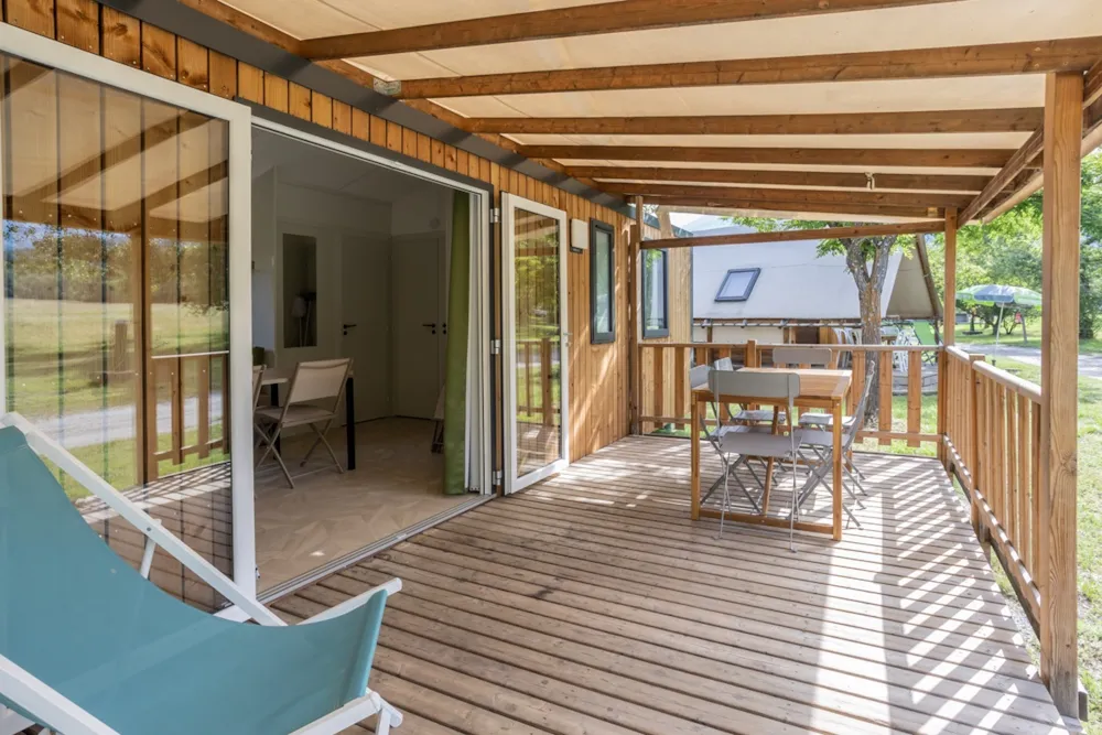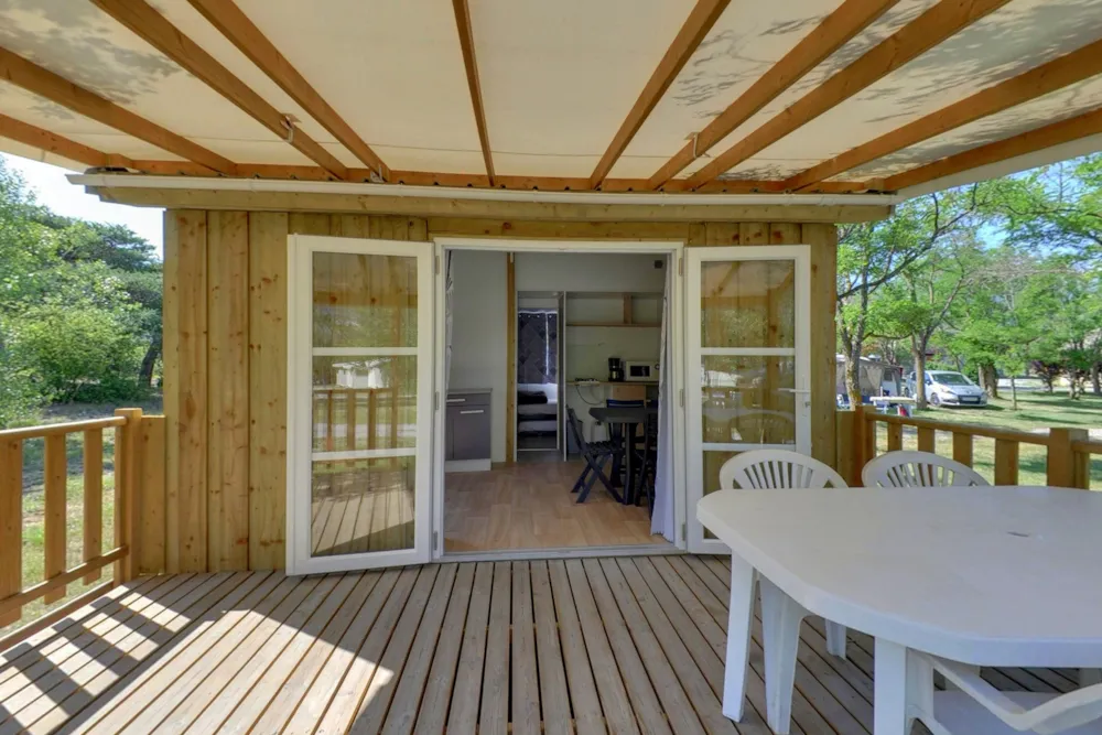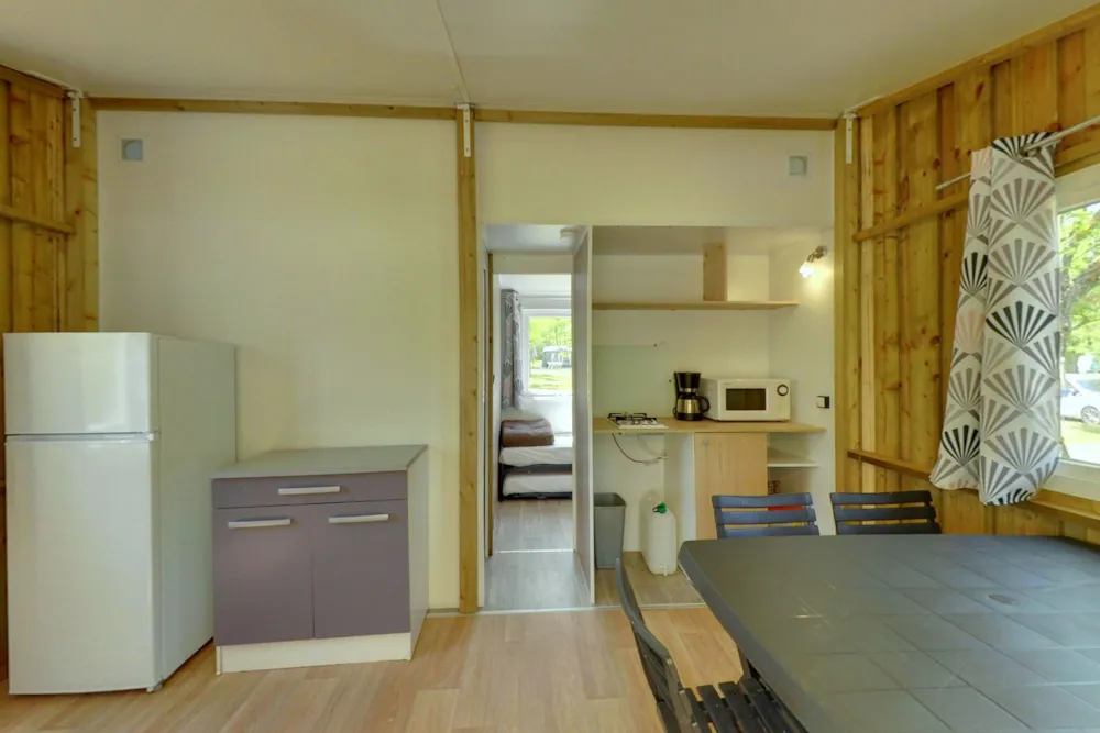 Donner une deuxième vie à nos Mobile-homes, telle a été notre volonté sur la création de ces 2 Mobilodges ! Avec pour mot d'ordre le recyclage, ces hébergements sont nés de nos anciens Mobile-homes. Nous en avons conservé le chassis et la structure en y apportant une belle isolation dans des matériaux nobles pour votre plus grand confort thermique et acoustique. Un joli bardage en bois, s'intégrant parfaitement dans le paysage a été apposé. Disposant de beaux espaces de rangement, cet hébergement est idéal pour les couples ou petite famille. Avec sa cuisine située sur la terrasse couverte, profitez pleinement de l'esprit camping tout en bénéficiant d'un confort optimal.