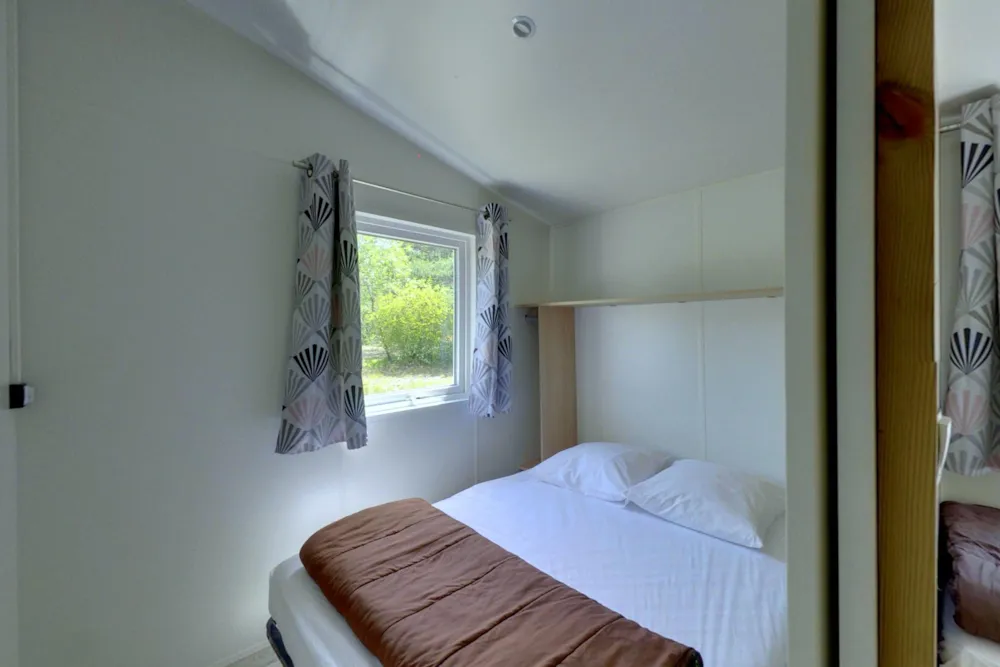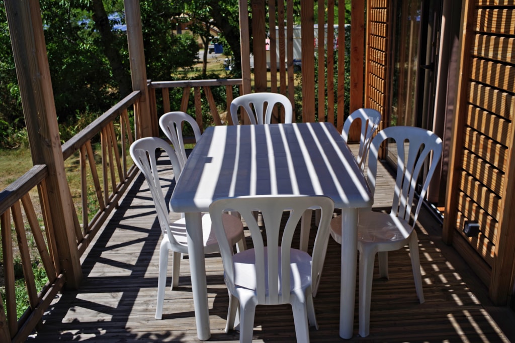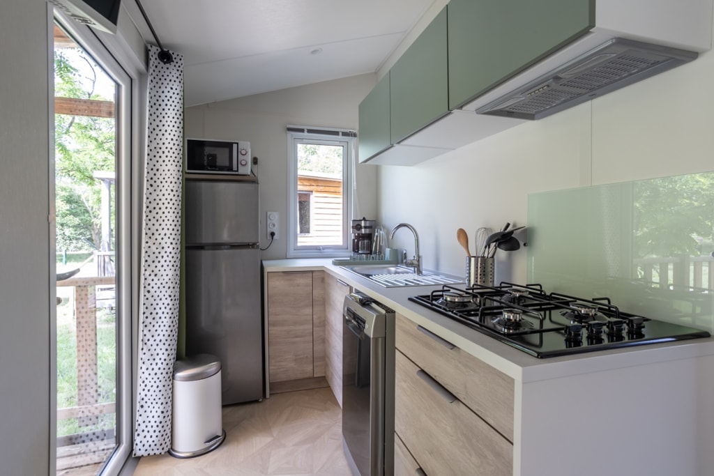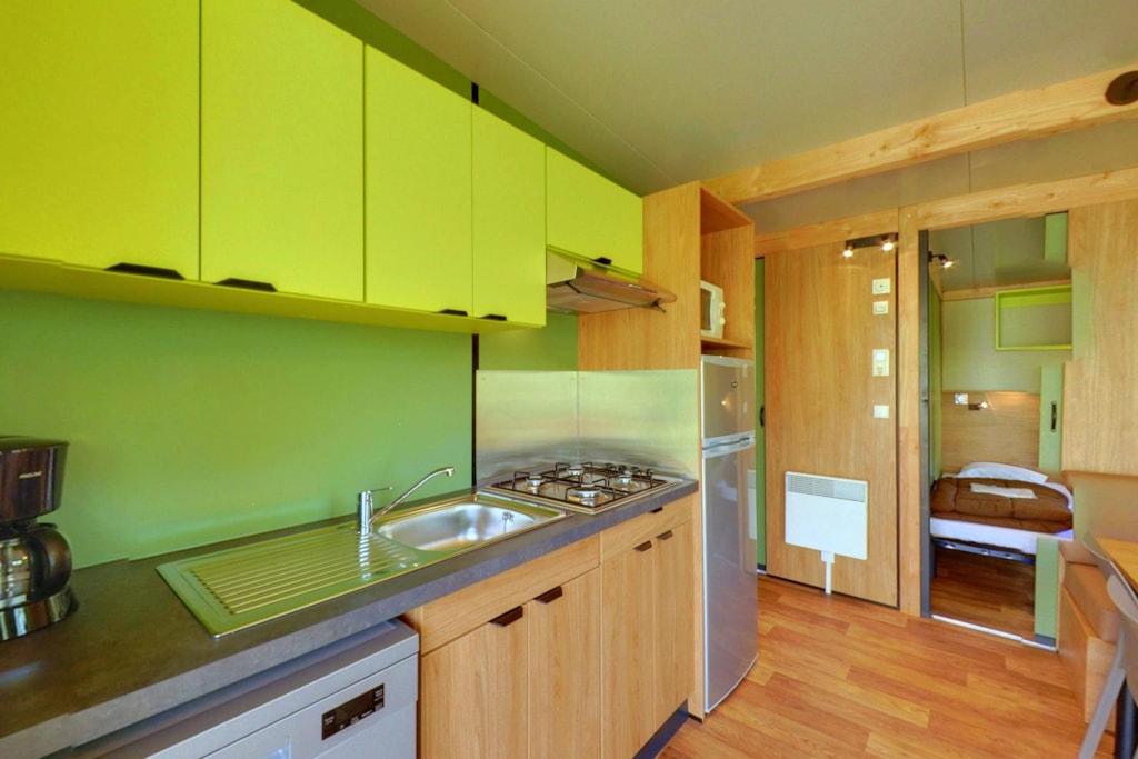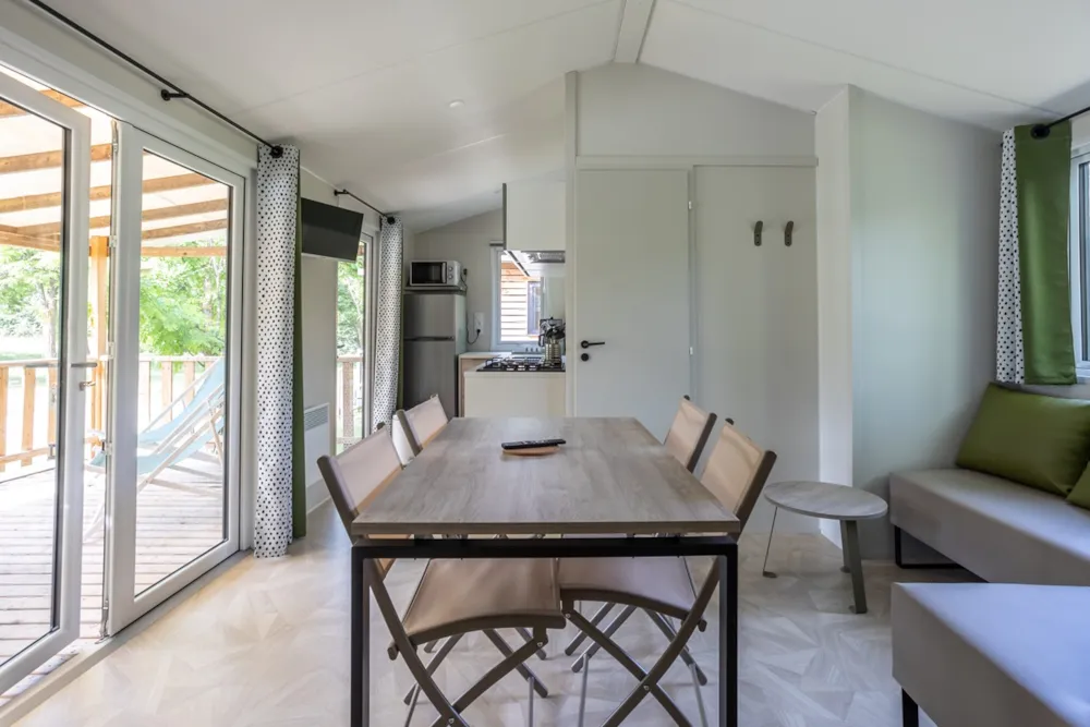 Donner une deuxième vie à nos Mobile-homes, telle a été notre volonté sur la création de ces 2 Mobilodges ! Avec pour mot d'ordre le recyclage, ces hébergements sont nés de nos anciens Mobile-homes. Nous en avons conservé le chassis et la structure en y apportant une belle isolation dans des matériaux nobles pour votre plus grand confort thermique et acoustique. Un joli bardage en bois, s'intégrant parfaitement dans le paysage a été apposé. Disposant de beaux espaces de rangement, cet hébergement est idéal pour les couples ou petite famille. Avec sa cuisine située sur la terrasse couverte, profitez pleinement de l'esprit camping tout en bénéficiant d'un confort optimal.