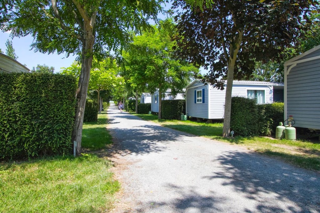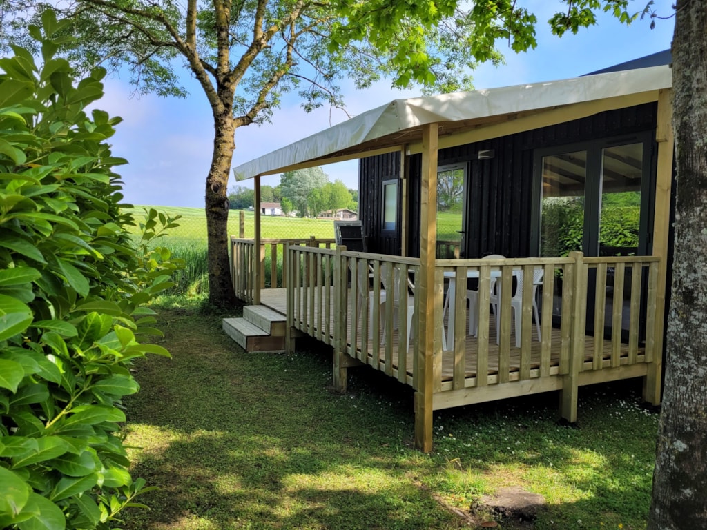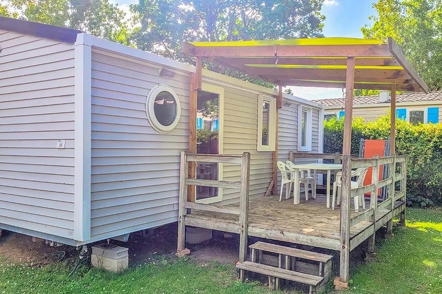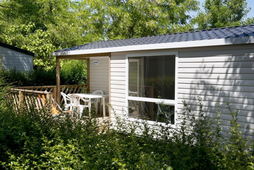 Das Mobilheim PALMY, 24,5 m² mit vollständig überdachter Terrasse, 2 Schlafzimmer, 4 Schlafplätze, empfängt Sie umweltfreundlich und mit ausgewählten Ausstattungsmerkmalen.