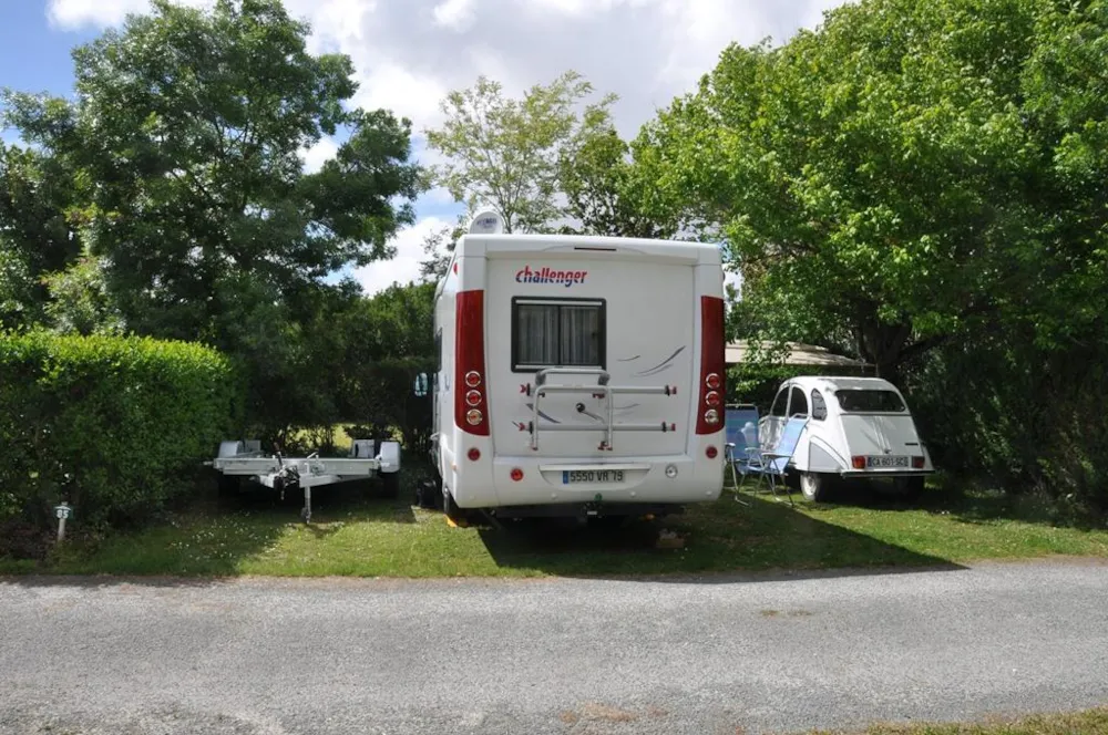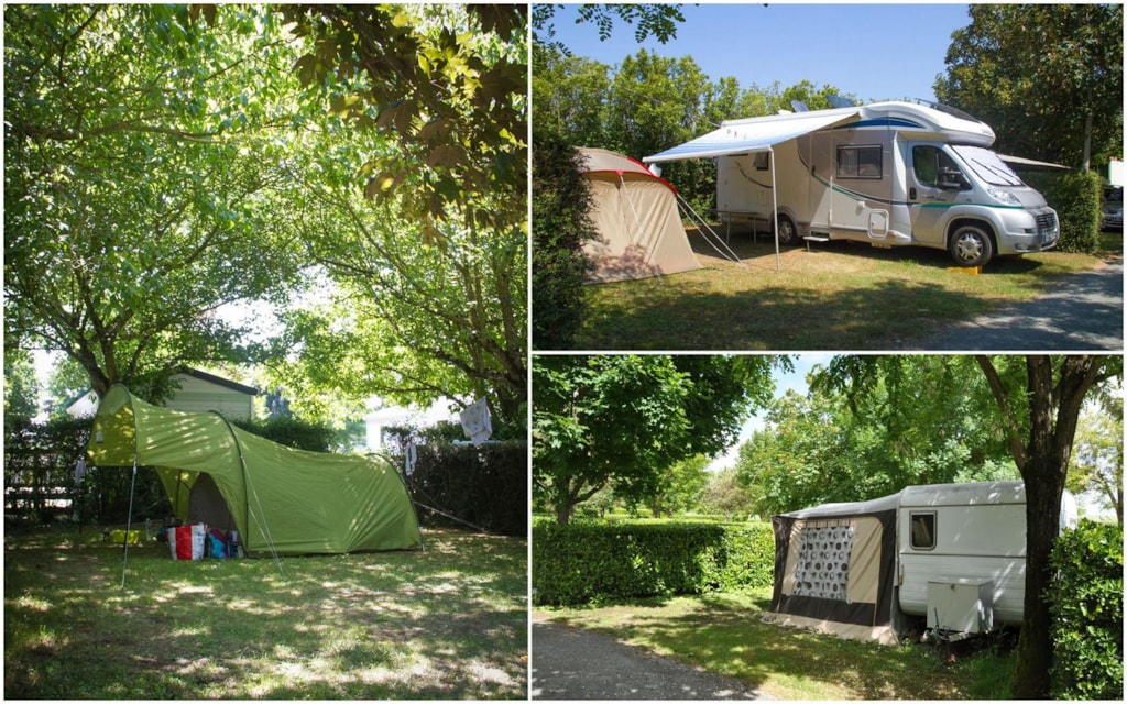 Emplacements pour tente, caravane ou camping-car, d’une superficie de 90 m² environ sur sol herbeux. Semi-ombragé et délimité par des haies. Raccordement électrique 16 Ampères (prise française ou européenne, prévoir un adaptateur). Location de frigo table-top disponible. Branchement TV pour recevoir toutes les chaines HD françaises de la TNT (câble fourni, amenez juste votre TV standard avec démodulateur TNTHD). Fontaine d'eau potable et barbecues collectifs à charbon à disposition à proximité (interdits sur les emplacements). Location de Micro-ondes, Plancha à Gaz ou Barbecue à Gaz possible. Animaux bienvenus (maximum 2, avec supplément).