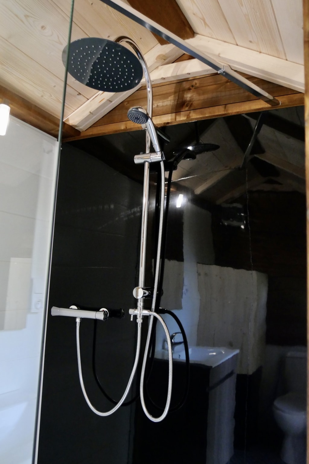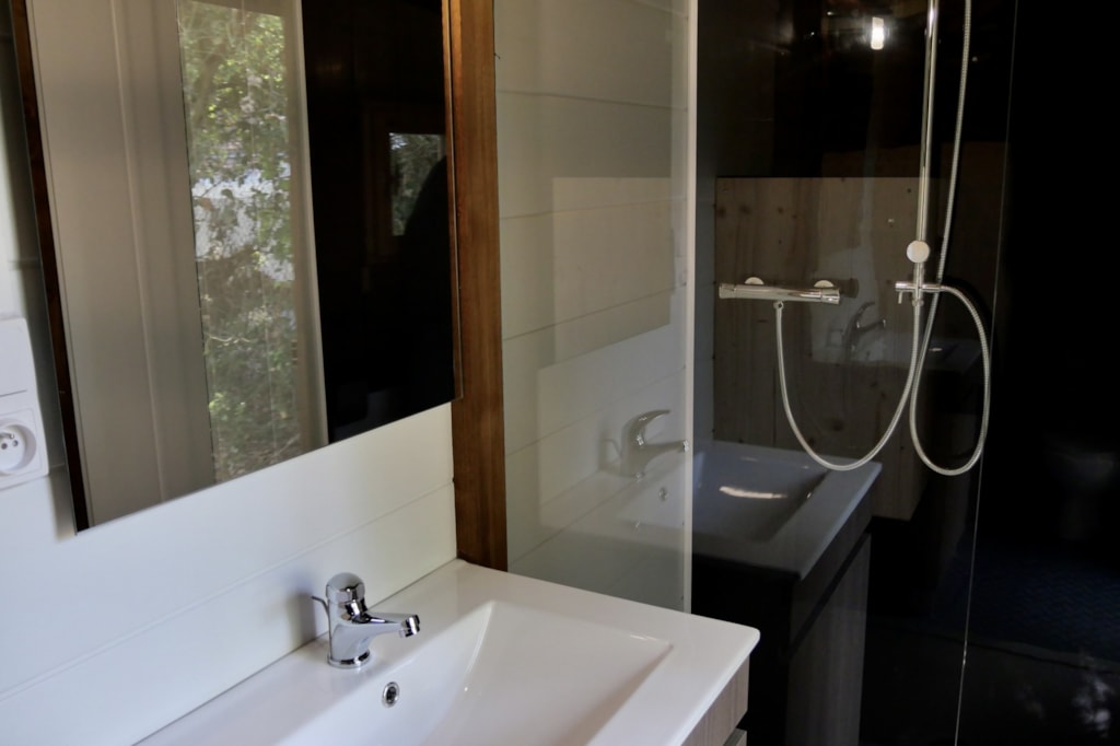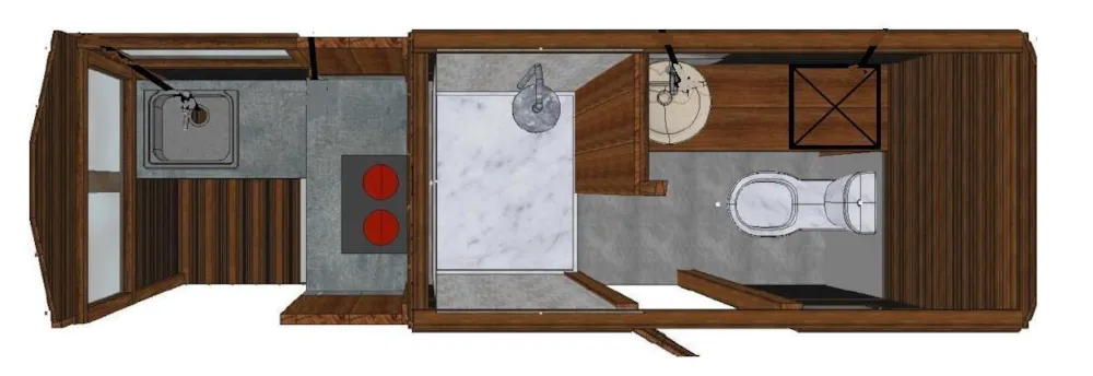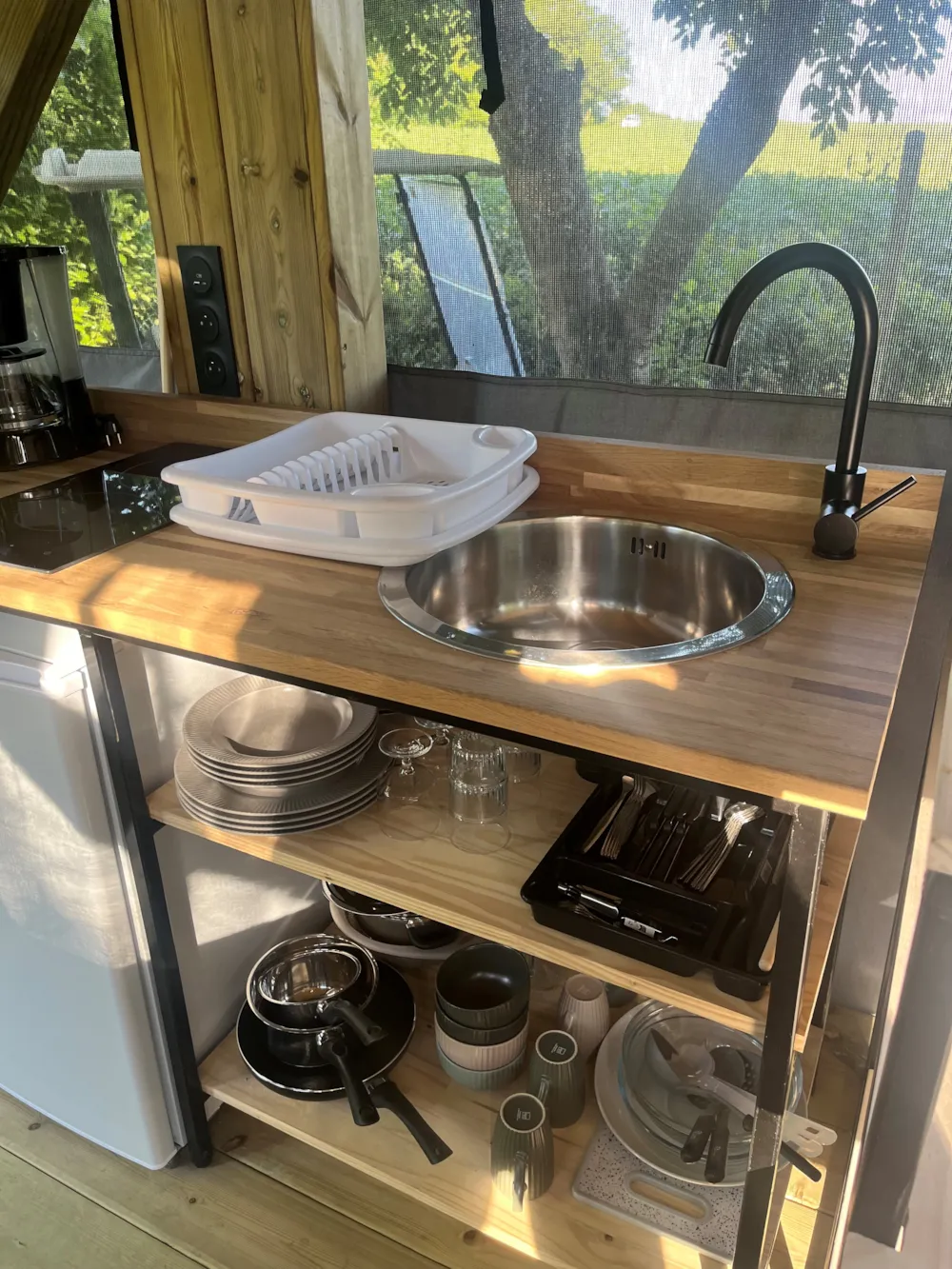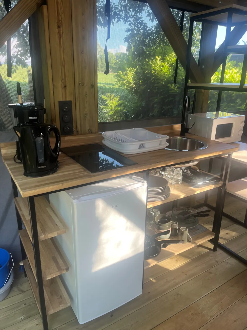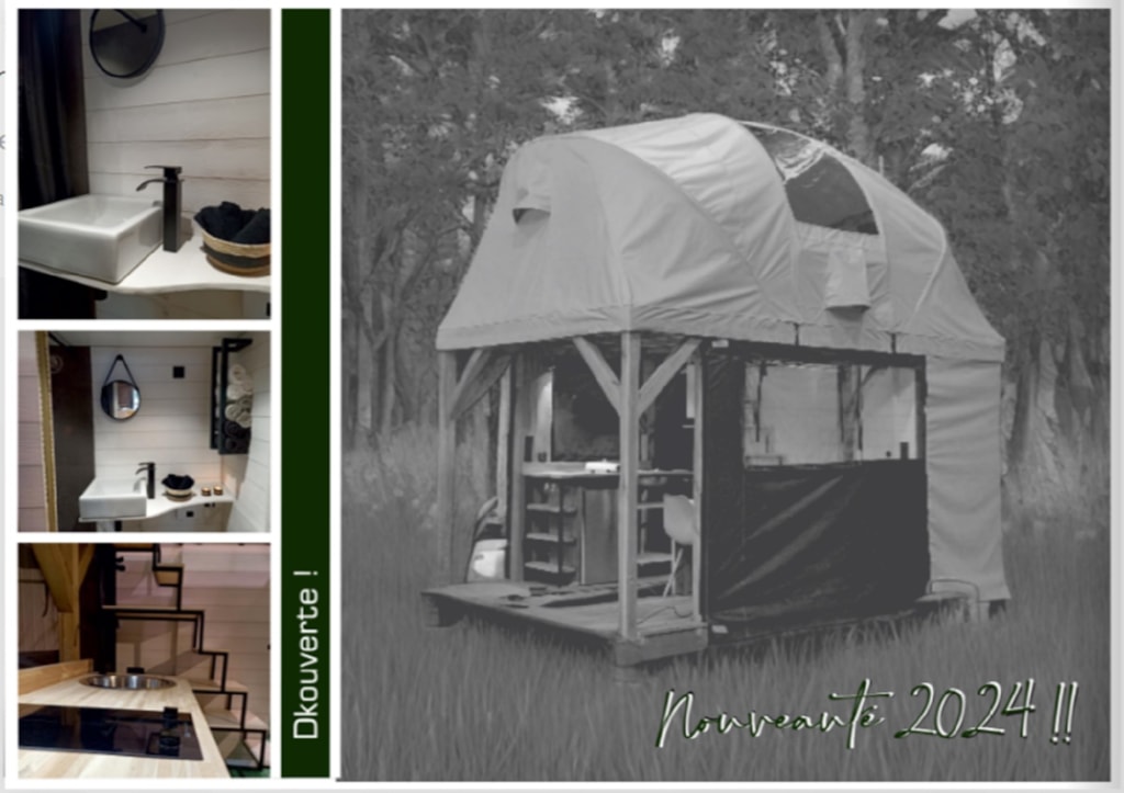 Ideal for campers looking for more comfort, the Freecamp, with its simple, aesthetic and resolutely natural design, offers you a double function: 1 sheltered kitchen with a preparation area including a 2 gas stove and refrigerator and 1 private bathroom with shower, washbasin and WC.