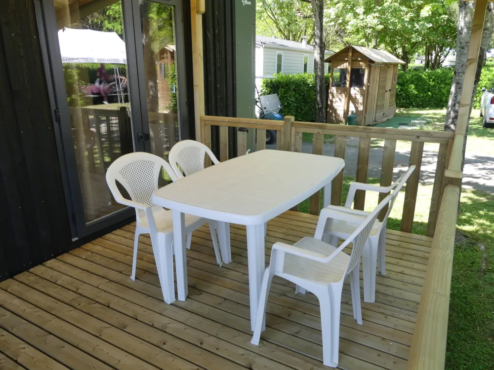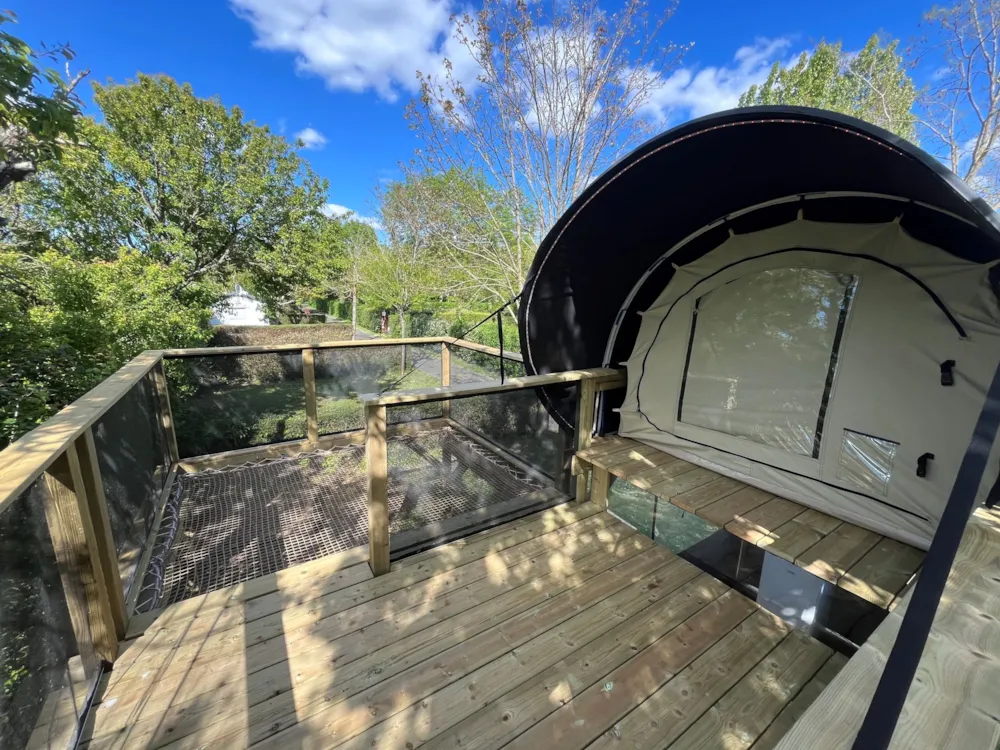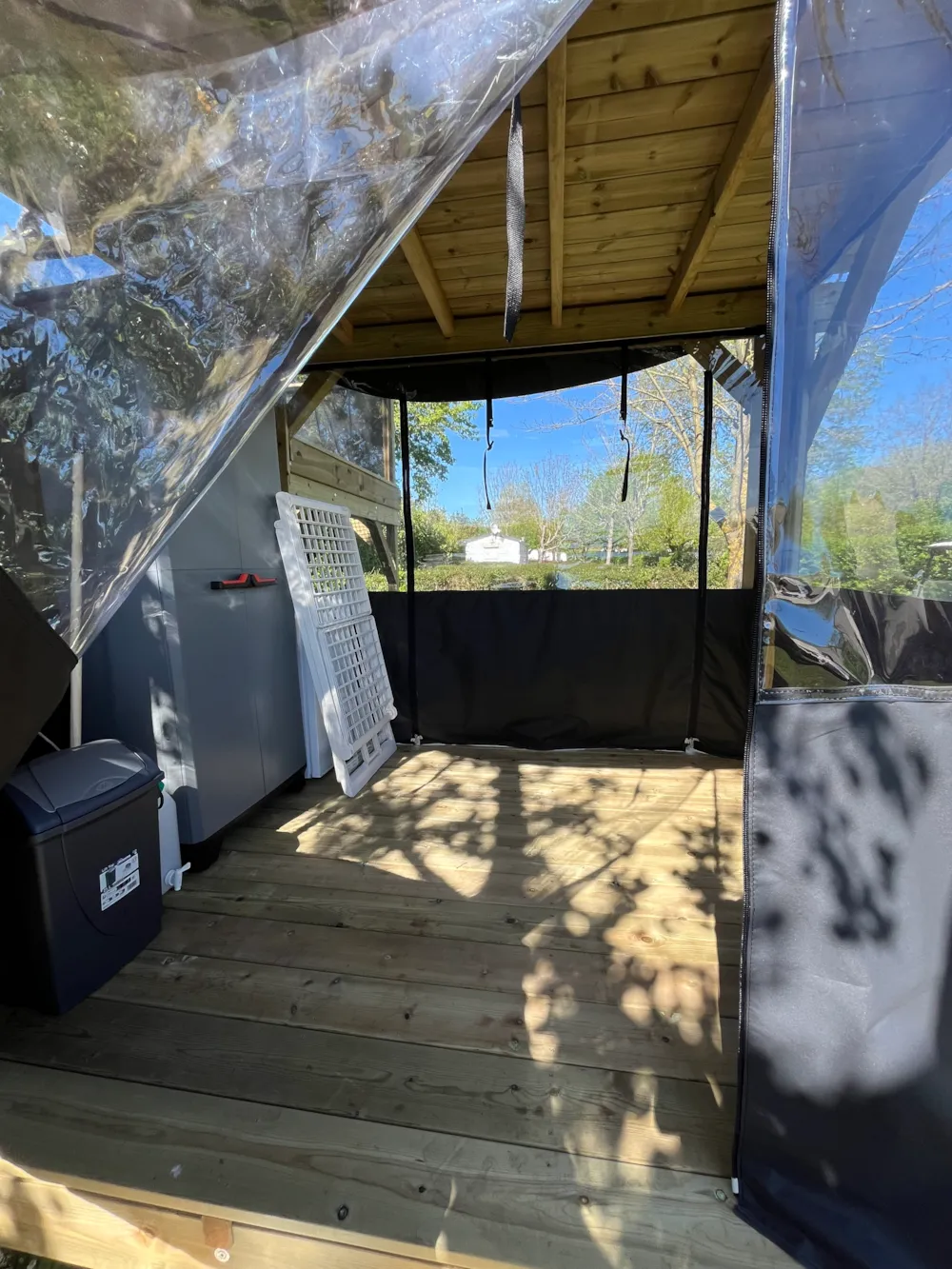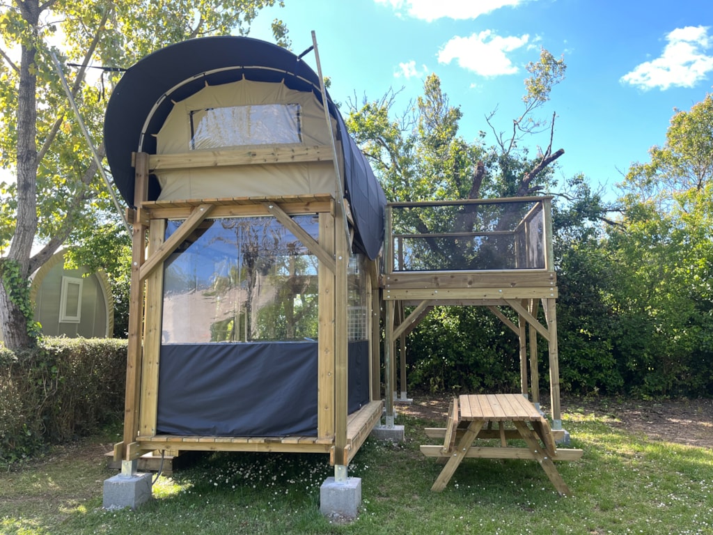 Eine Holzterrasse auf Stelzen ermöglicht es Ihnen, die frische Luft und die Aussicht von oben zu genießen und die Sonne während Ihres gesamten Aufenthalts zu genießen.