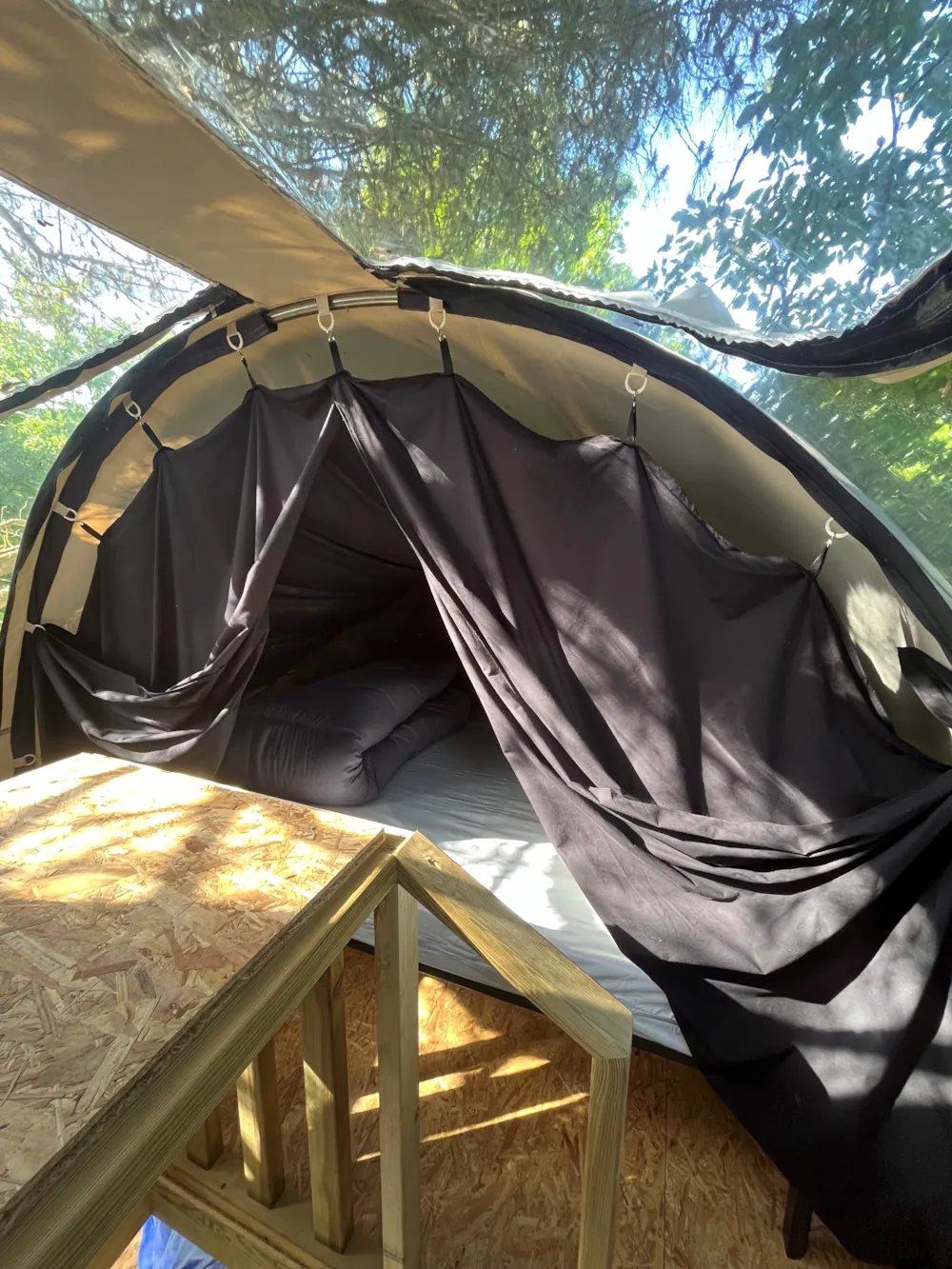 - Ein Zelt mit einem Doppelbett (140x190), 2 Taschenleerer auf jeder Seite des Bettes.