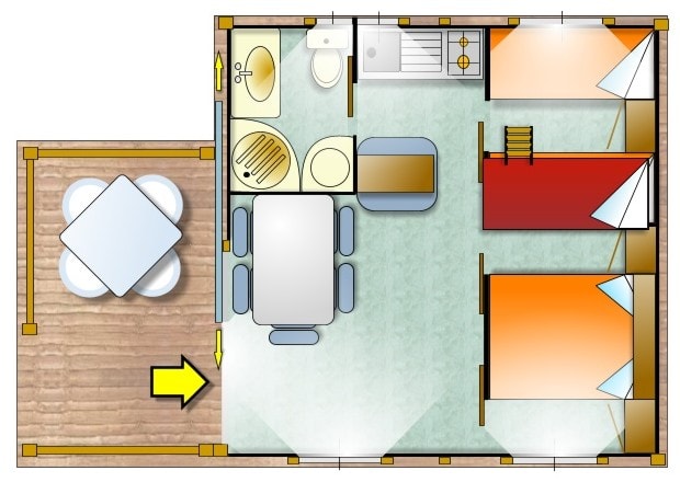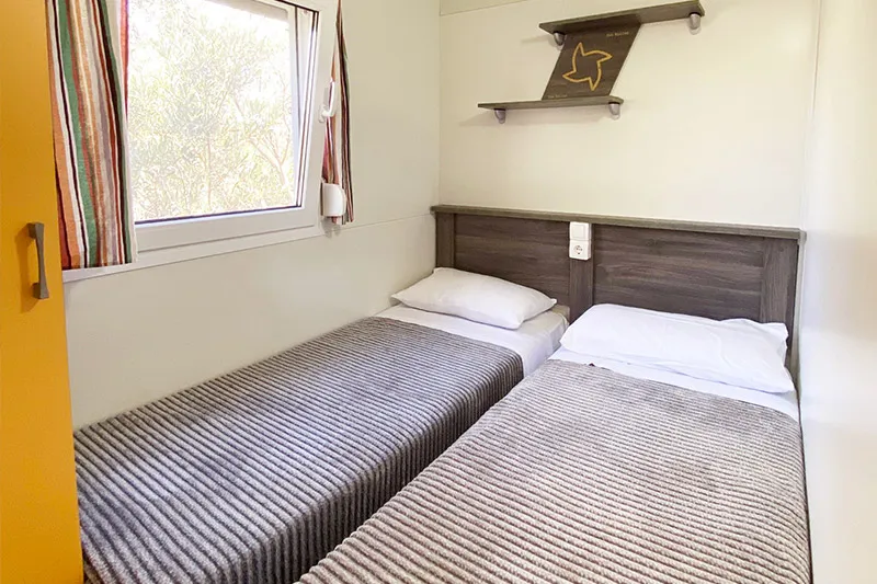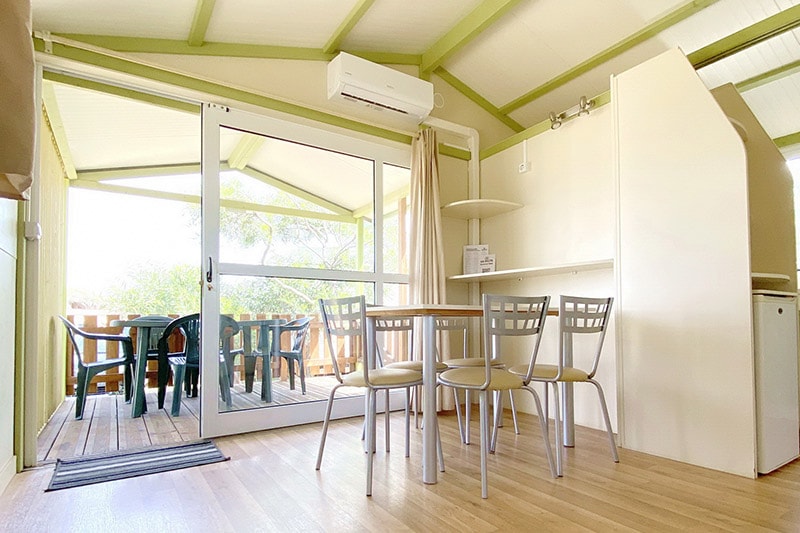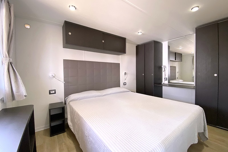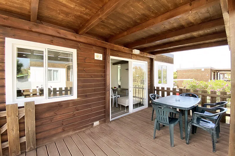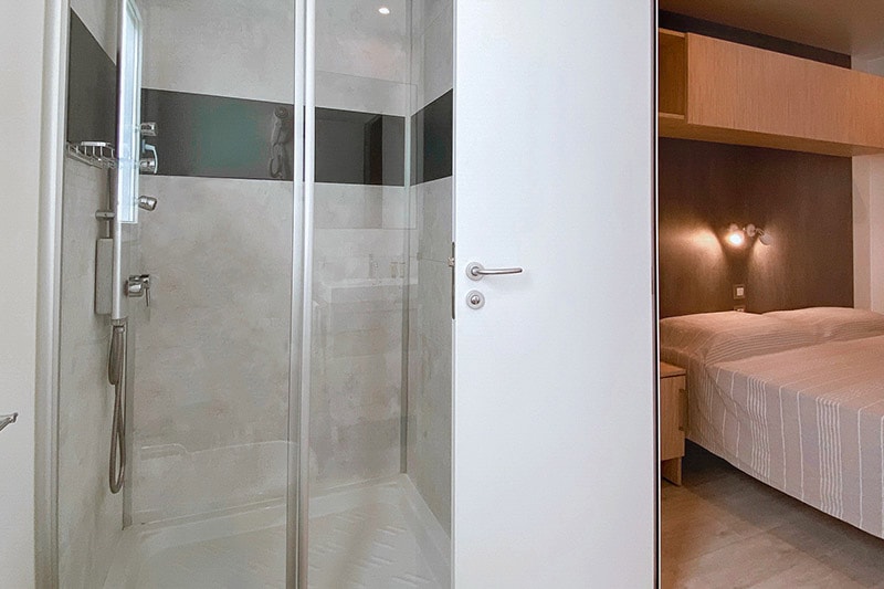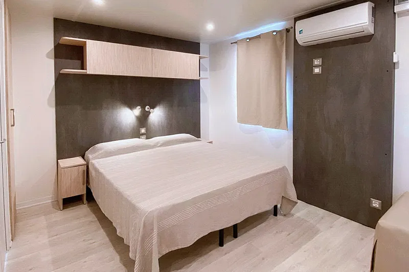 Mini Suites are the ideal solution for couples but also for friends who do not want to give up all the comforts even on holiday. Internal surface of 16.50sq.m. A bedroom with a double bed that, if necessary, can become 2 single beds, a single bed pouf, equipped corner for breakfast with a 140lt refrigerator. Large bright bathroom with hairdryer and a large shower that ensures comfort above the standards. Veranda outdoor area with table and chairs The accommodation is air-conditioned and has mosquito nets.