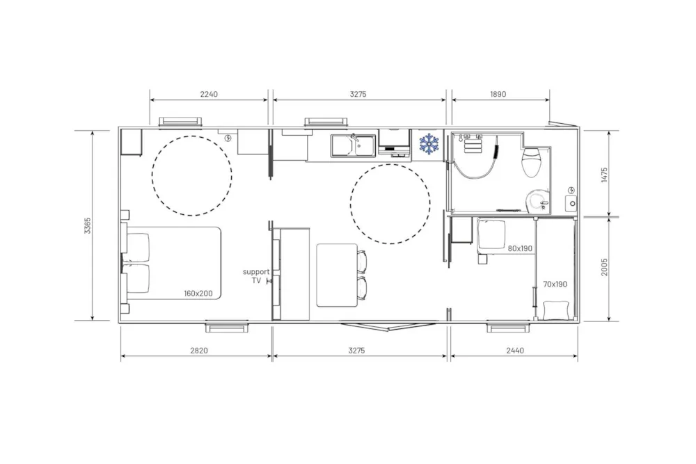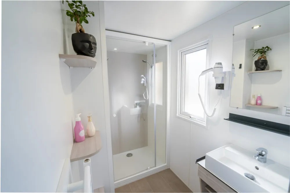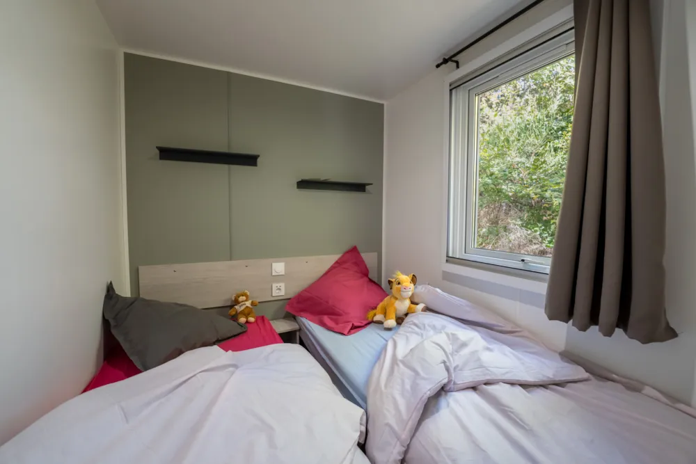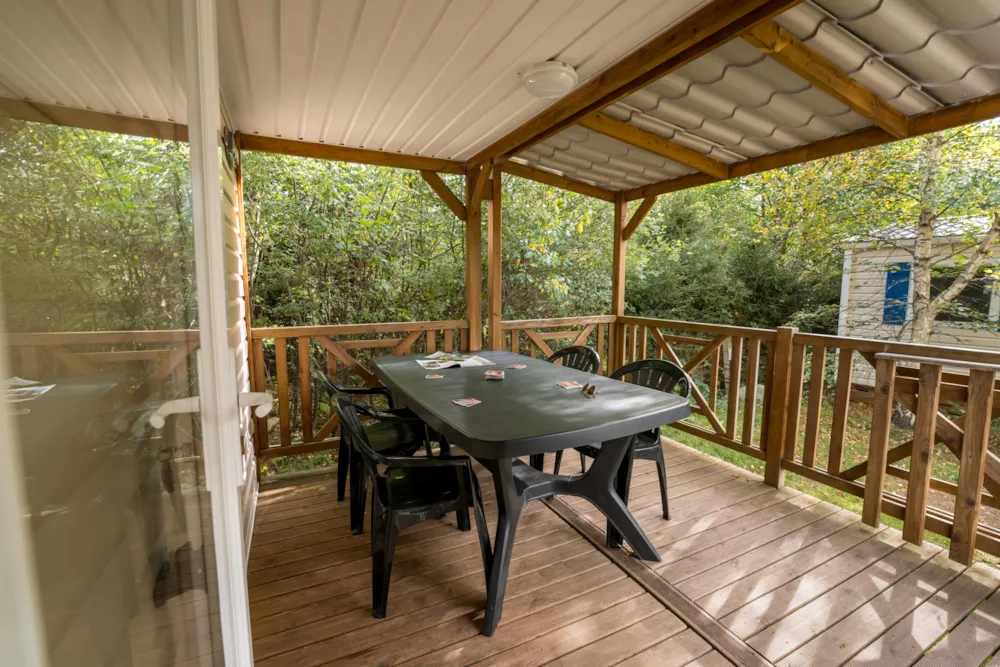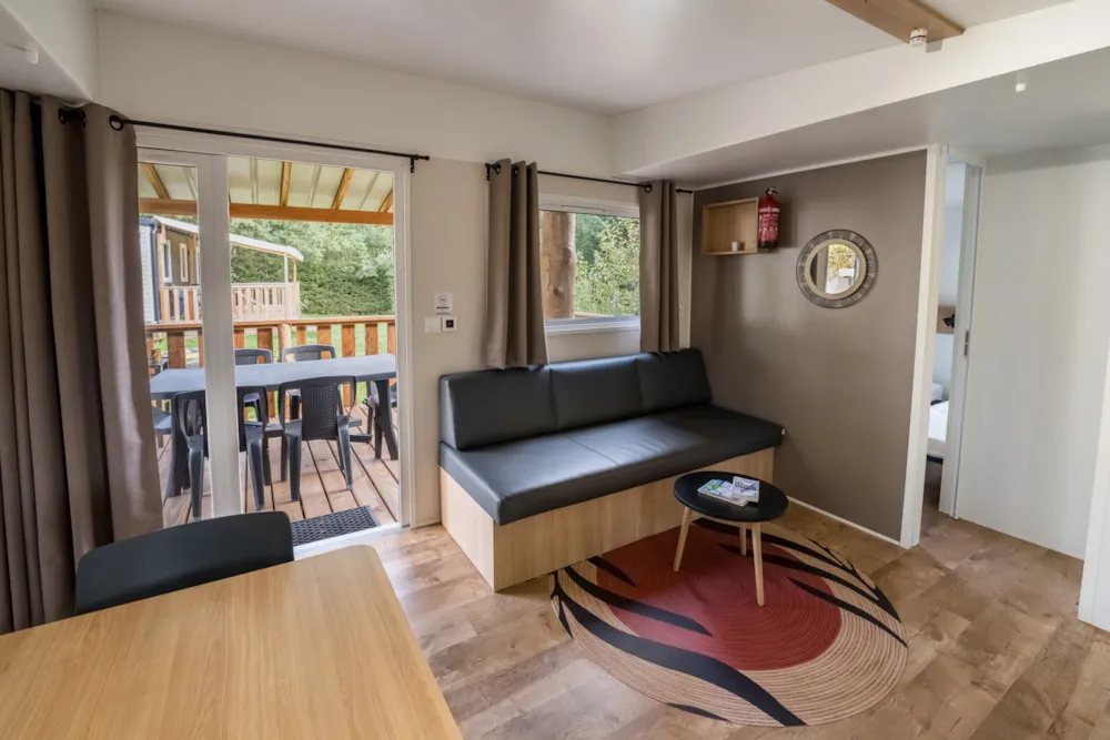 Das geräumige und moderne Mobilheim Premium Sérénité bietet allen Komfort für einen gelungenen Familienurlaub in den Vogesen. Dank seines großen Wohnbereichs und seiner halbüberdachten Terrasse können Sie Ihren Aufenthalt bei jedem Wetter in vollen Zügen genießen.