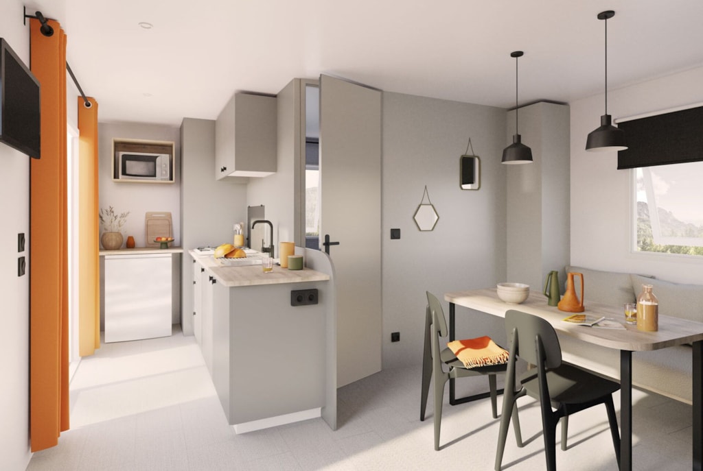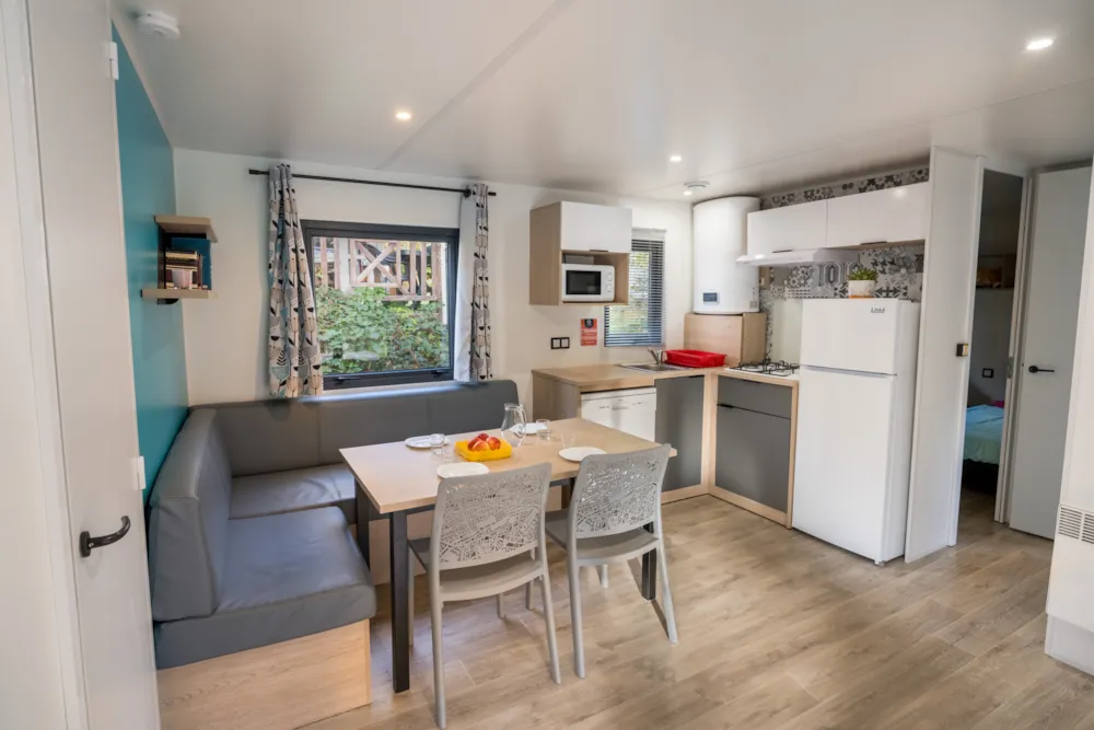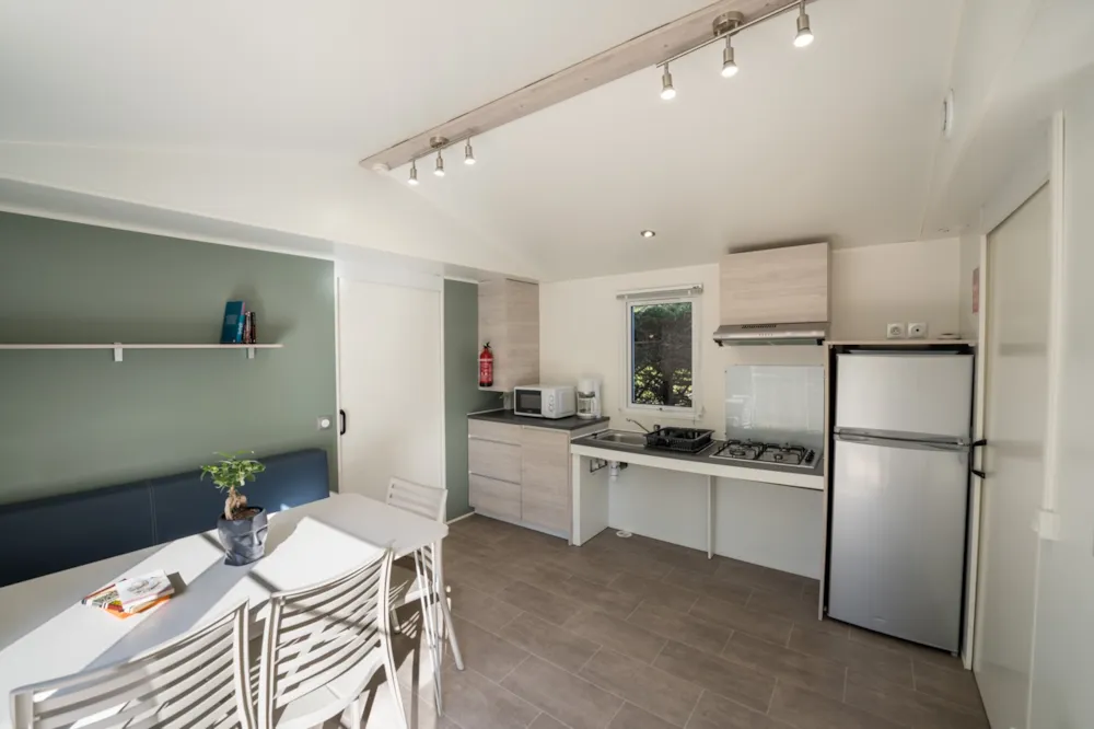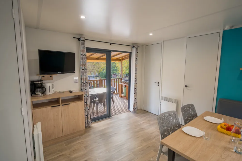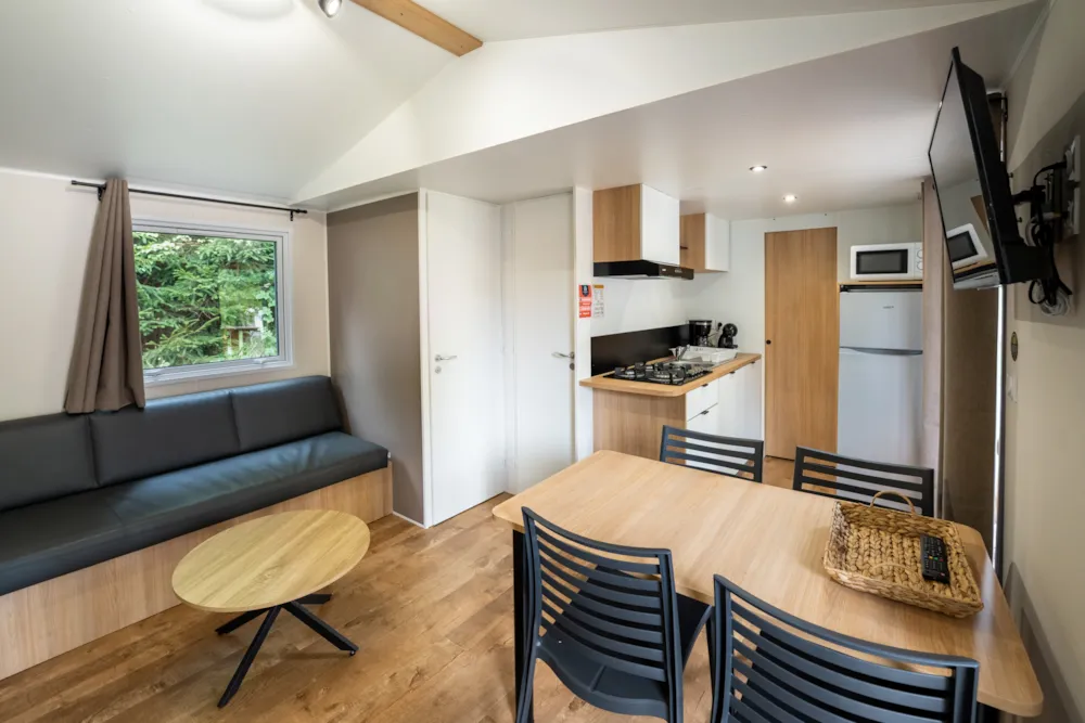 Dieses moderne und helle Mobilheim bietet allen Komfort für einen Aufenthalt mit der Familie oder Freunden in einer natürlichen und ruhigen Umgebung.