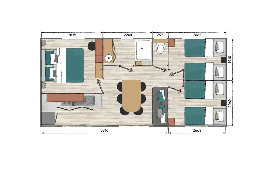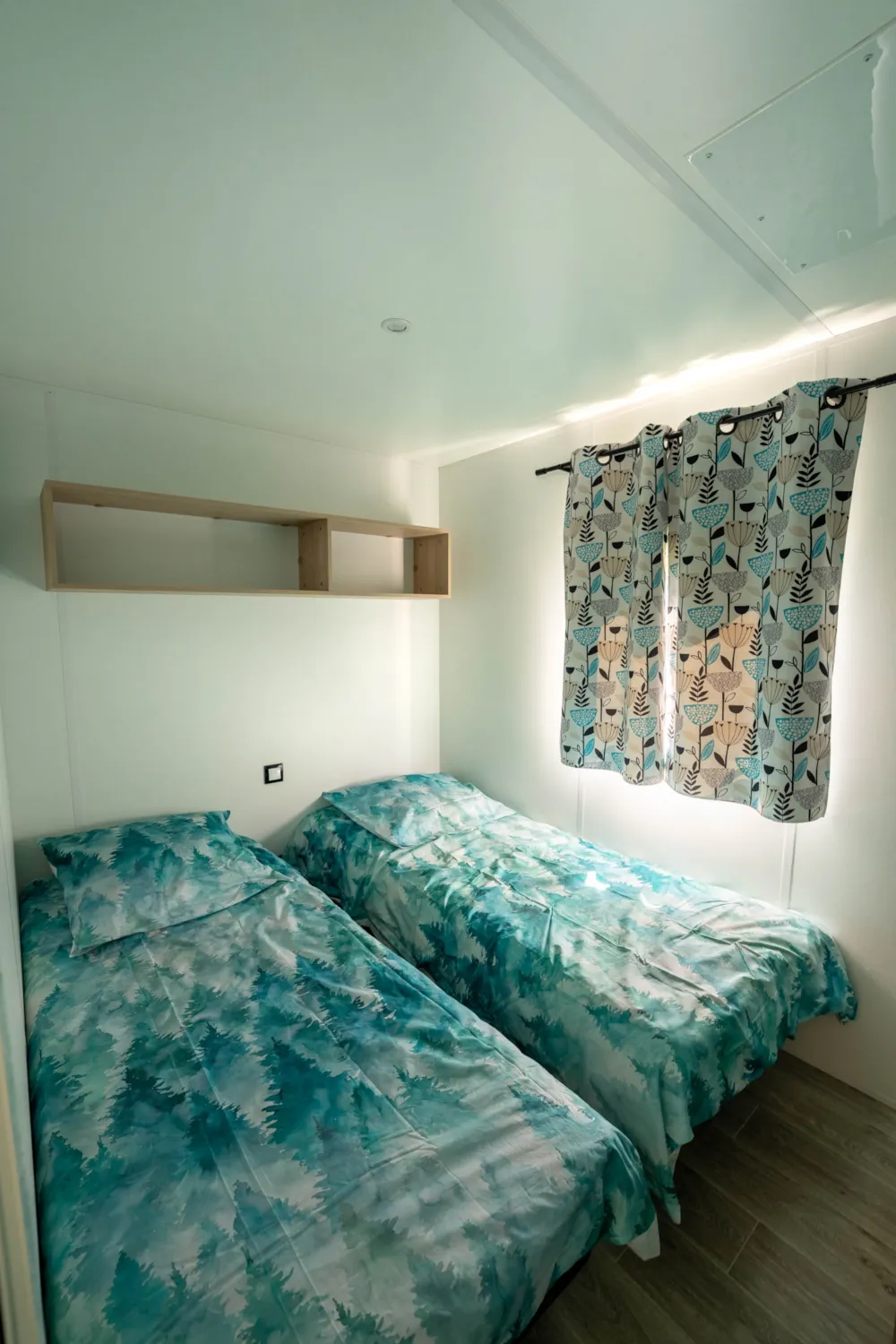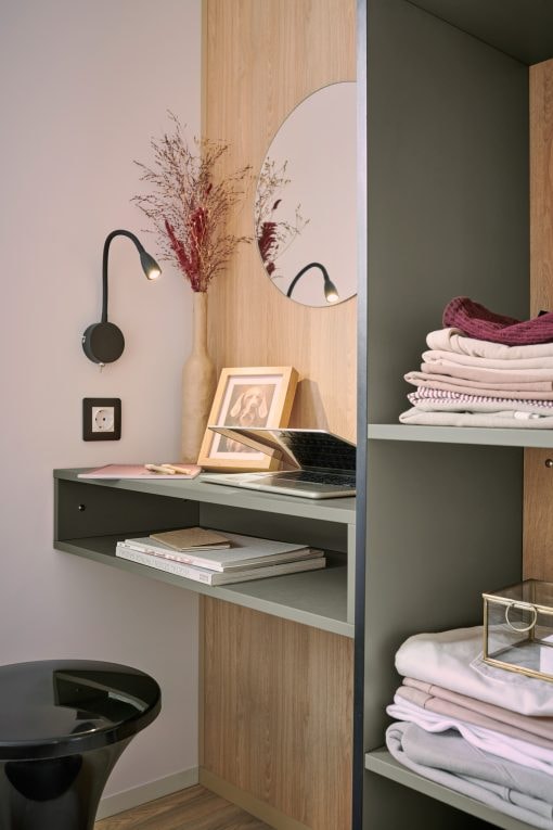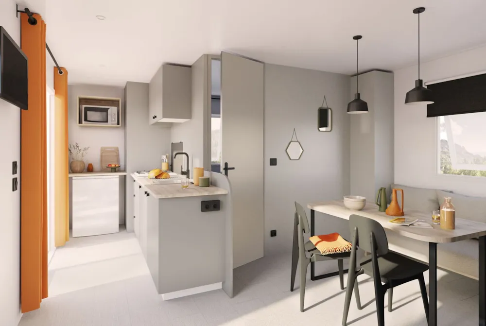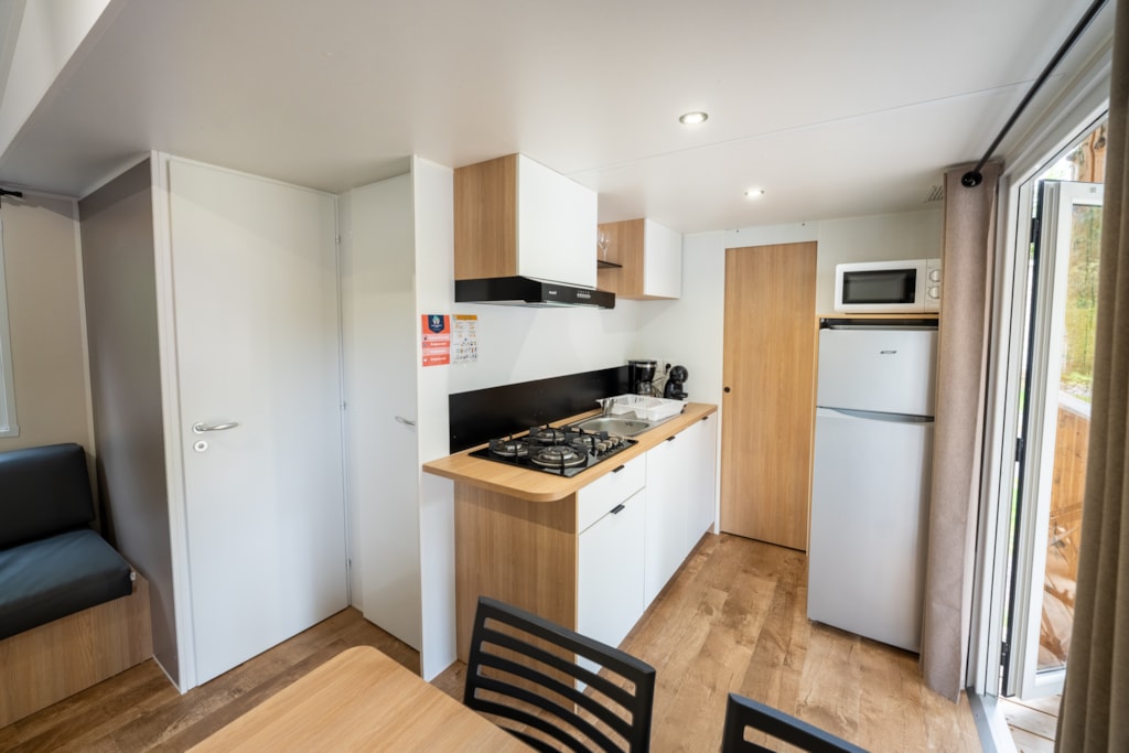 Dieses moderne und helle Mobilheim bietet allen Komfort für einen Aufenthalt mit der Familie oder Freunden in einer natürlichen und ruhigen Umgebung.