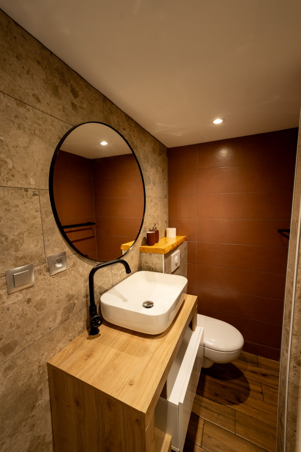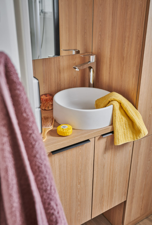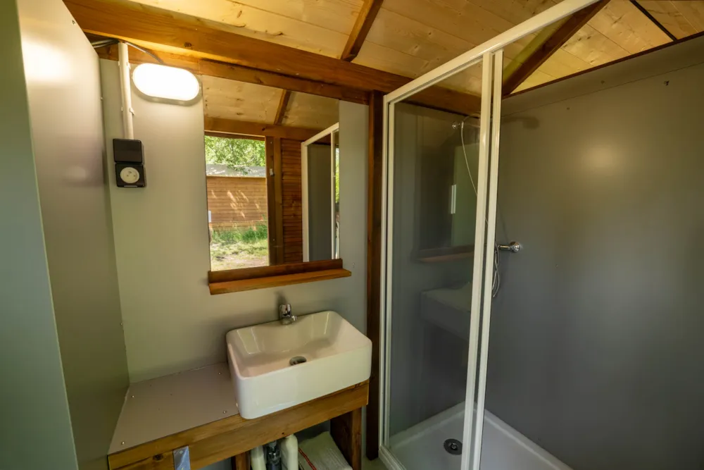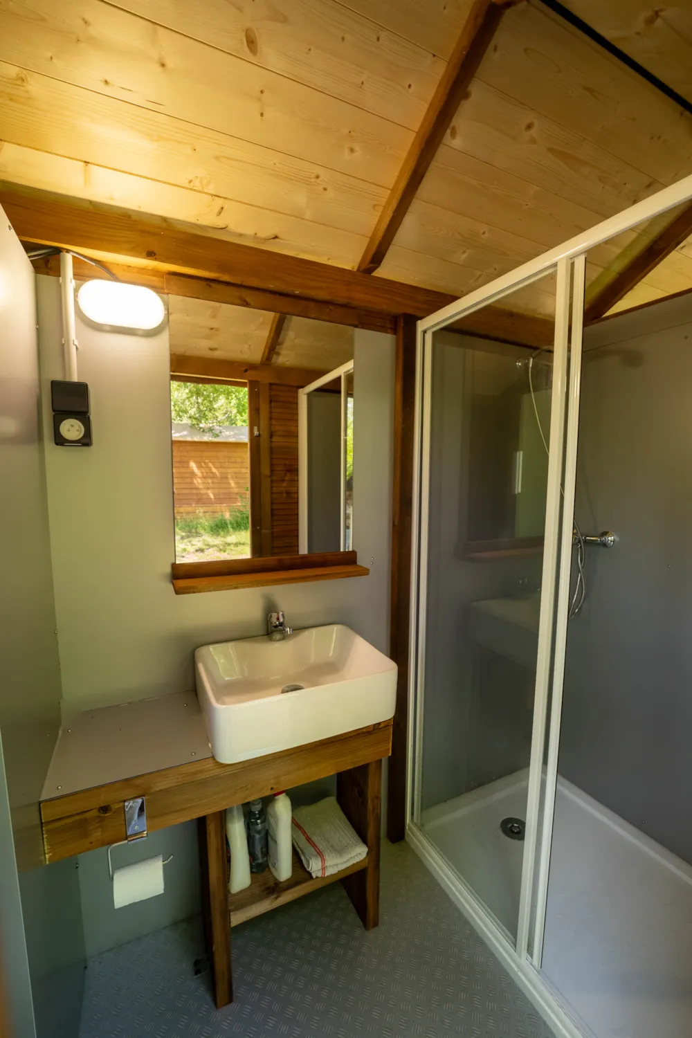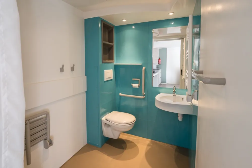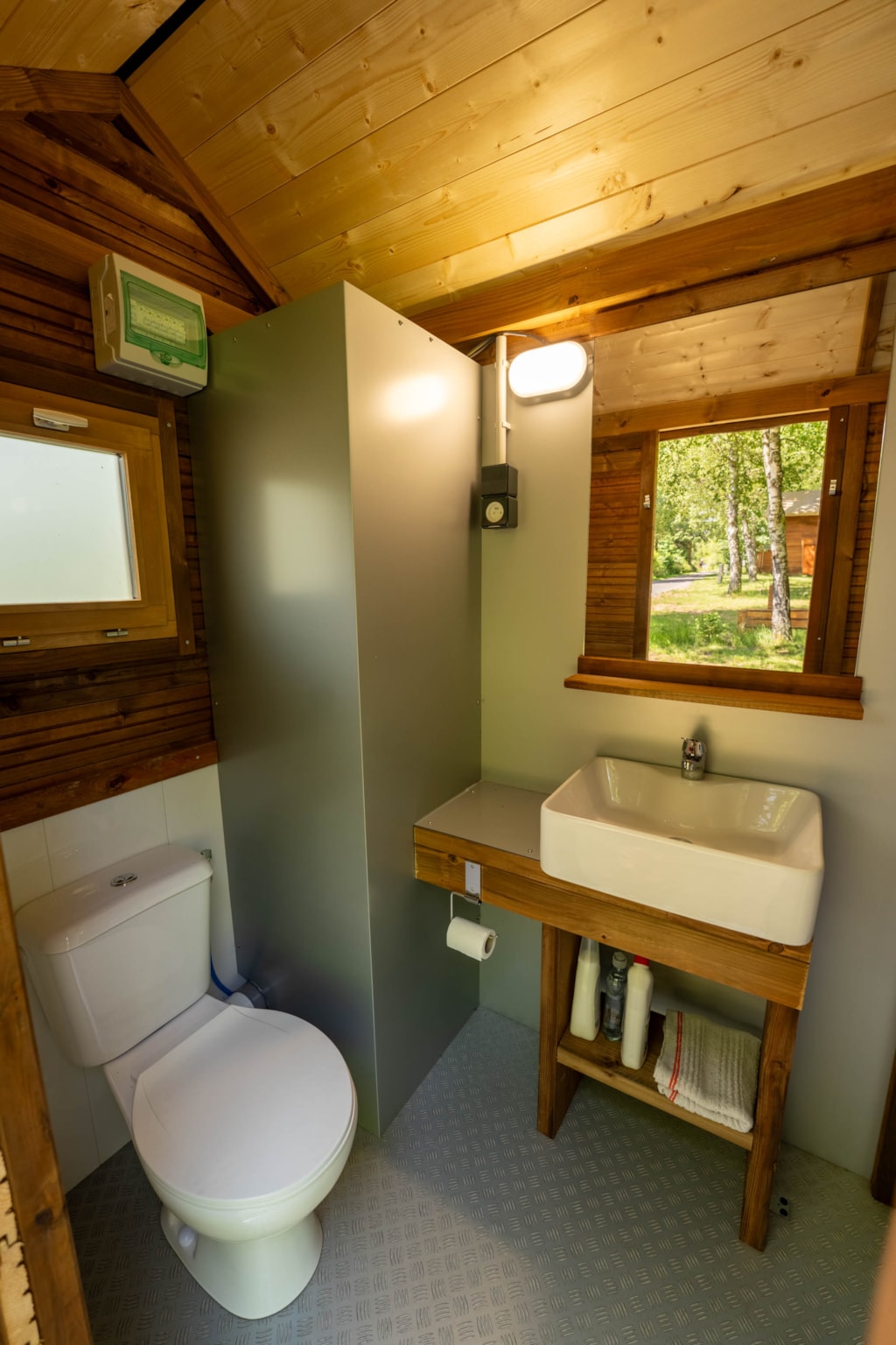 Komplett ausgestattetes Badezimmer: Waschbecken, Dusche und WC, bequem vom Innenraum zugänglich
