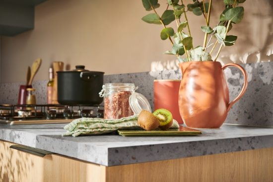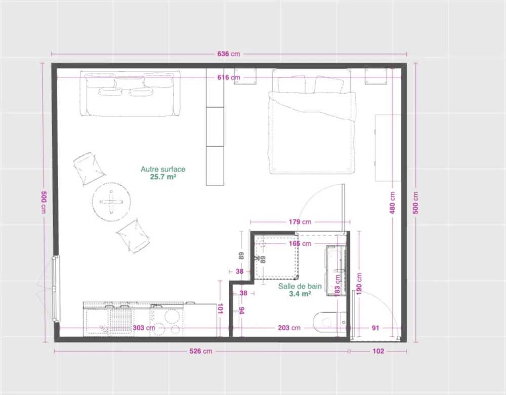 Voll ausgestattete Küche: Stauraum, Induktionskochfeld und Kühlschrank (Tischmodell)