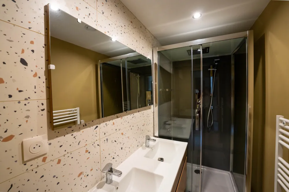 • Badezimmer mit Dusche, Waschbecken, Handtuchtrockner und Haartrockner