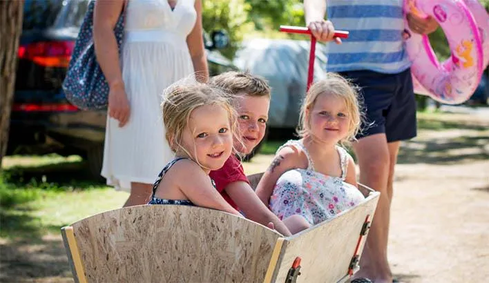 Stellplätze auf Grasflächen und/oder Sandflächen bis zu 80 m² groß, mit Strom 10 Ampere, Wasseranschluss und -abfluss, kostenloses WLAN.