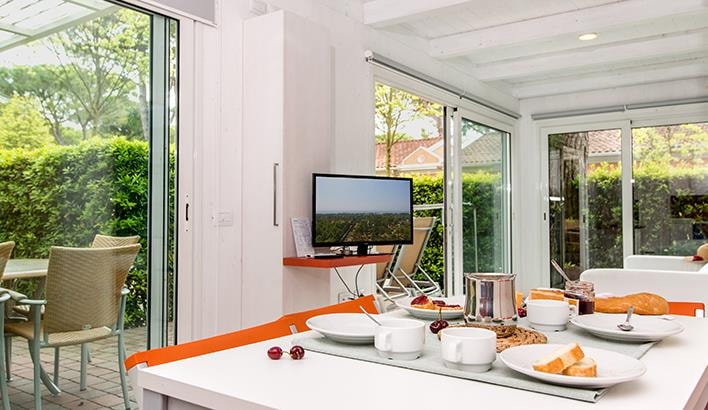 Schöne Veranda, eingebettet in eine tolle und ruhige Parkanlage. Gut ausgestattete Küche.