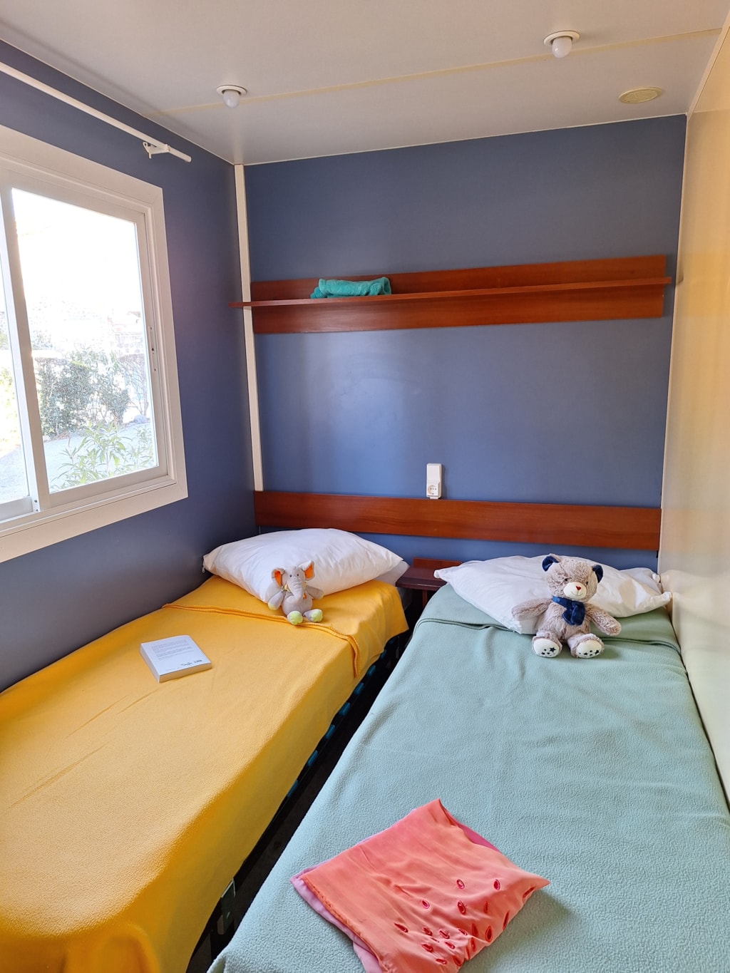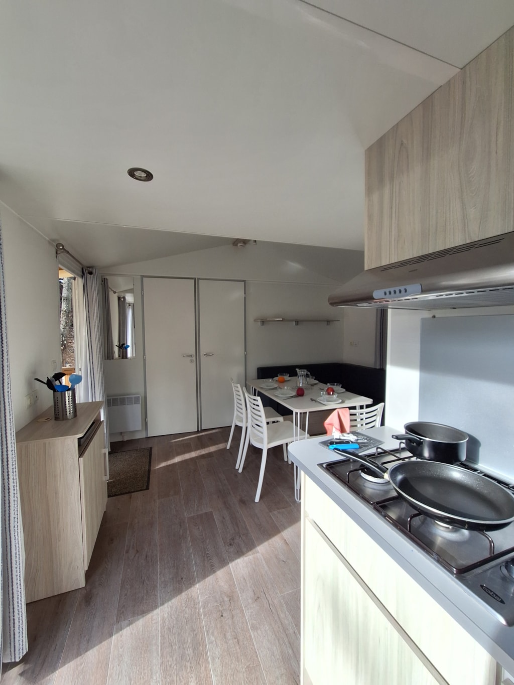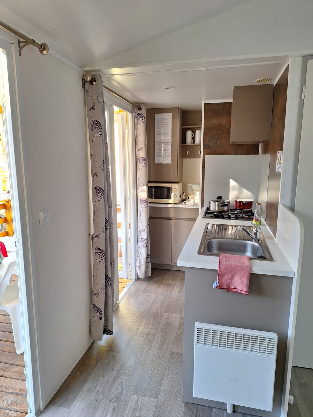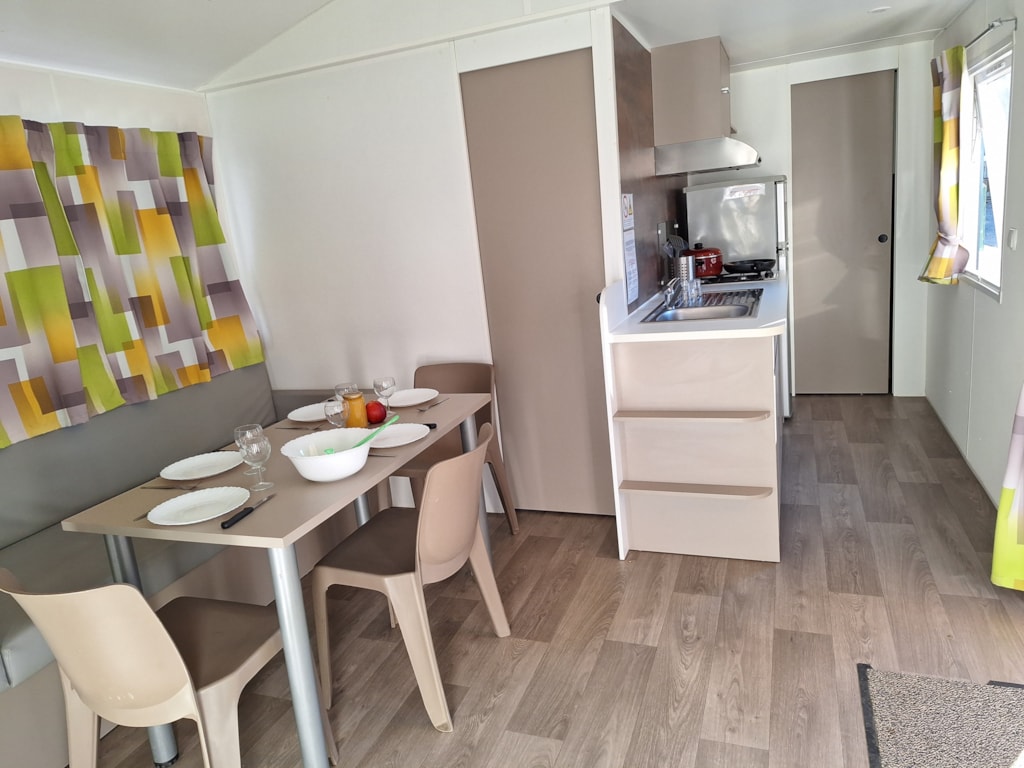 mobil-home avec 2 chambres dont une avec 3 lits coin cuisine