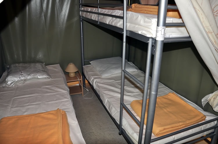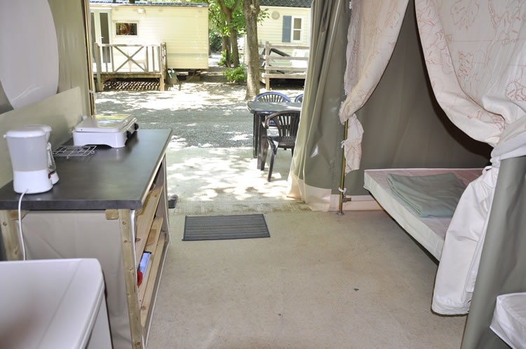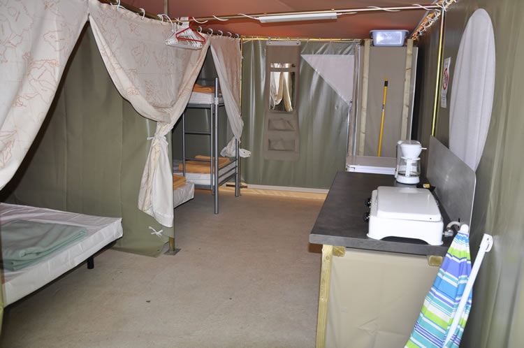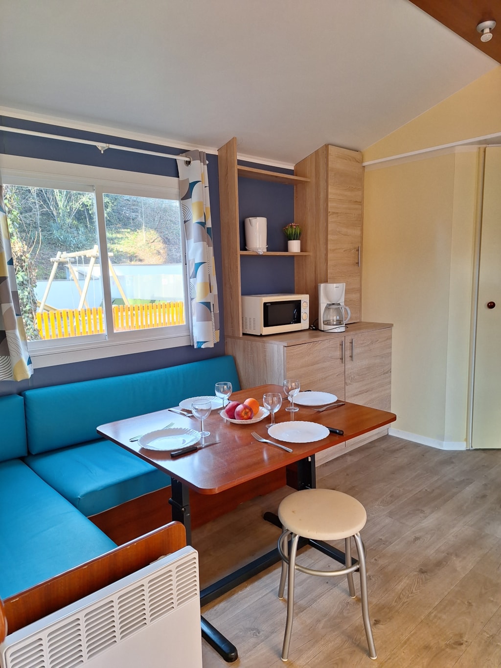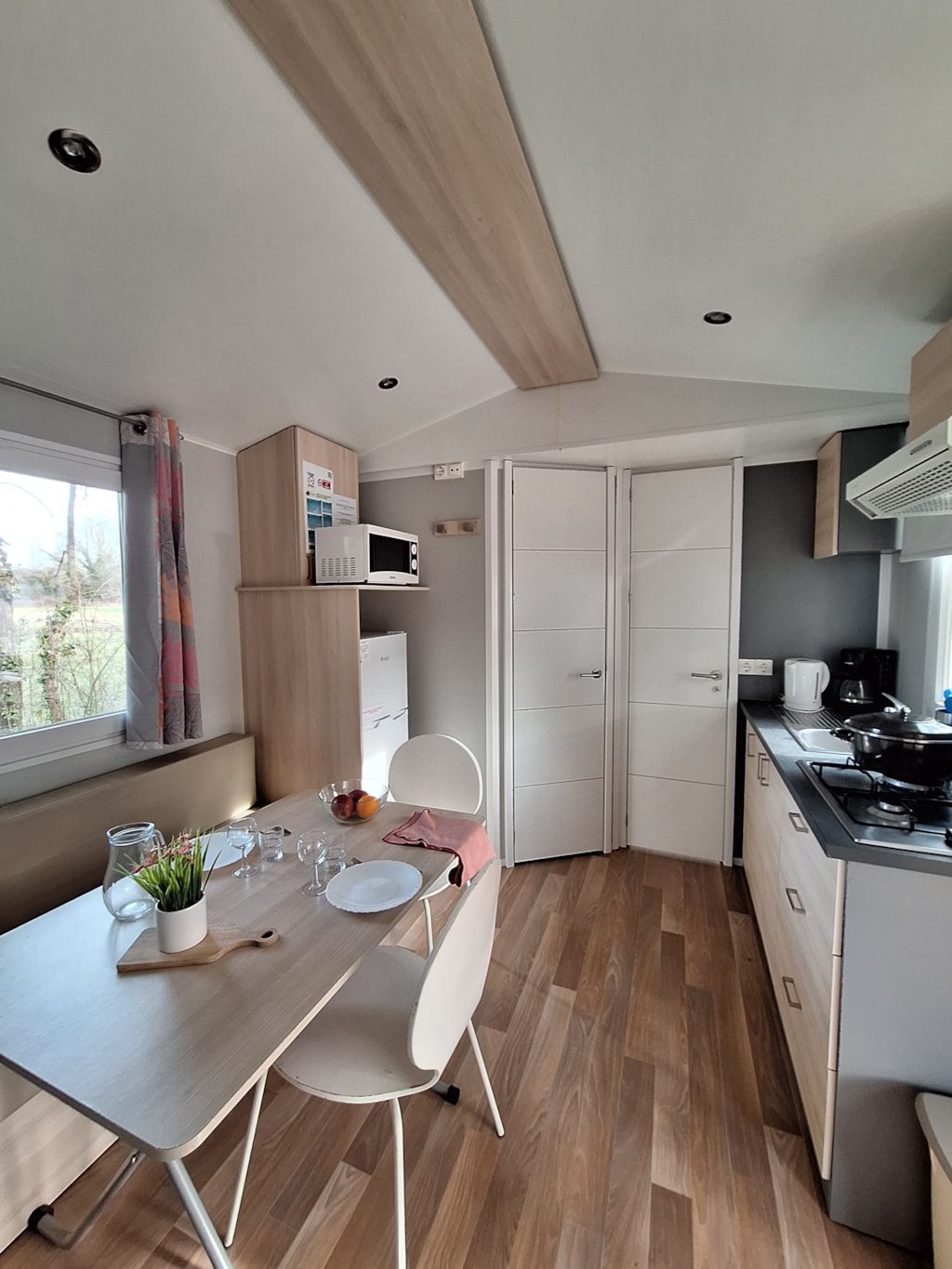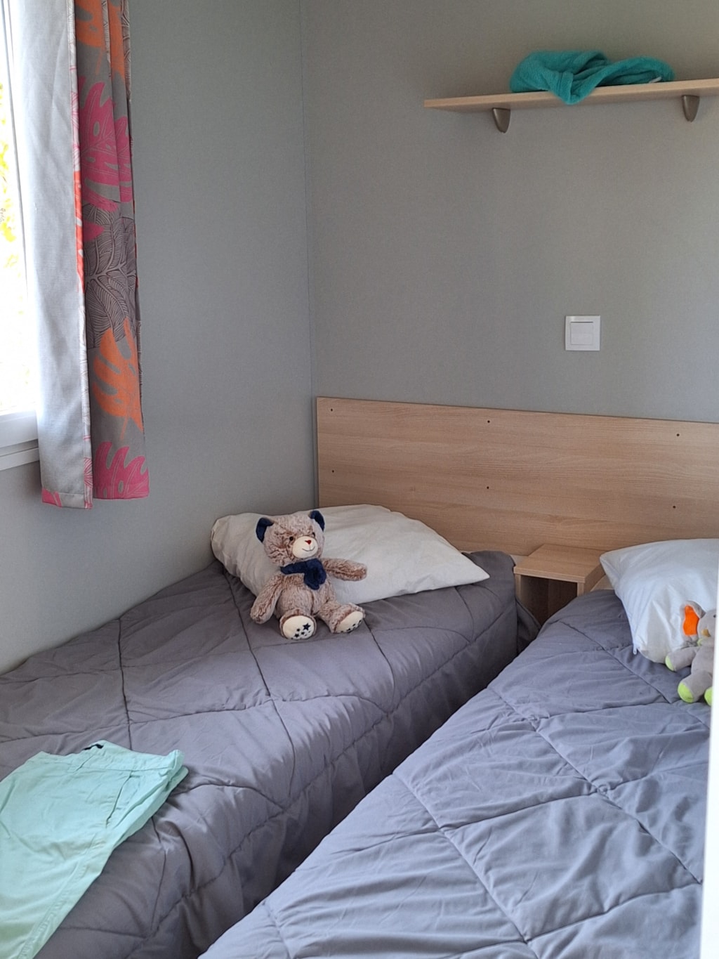 mobil-home avec 2 chambres dont une avec 3 lits coin cuisine