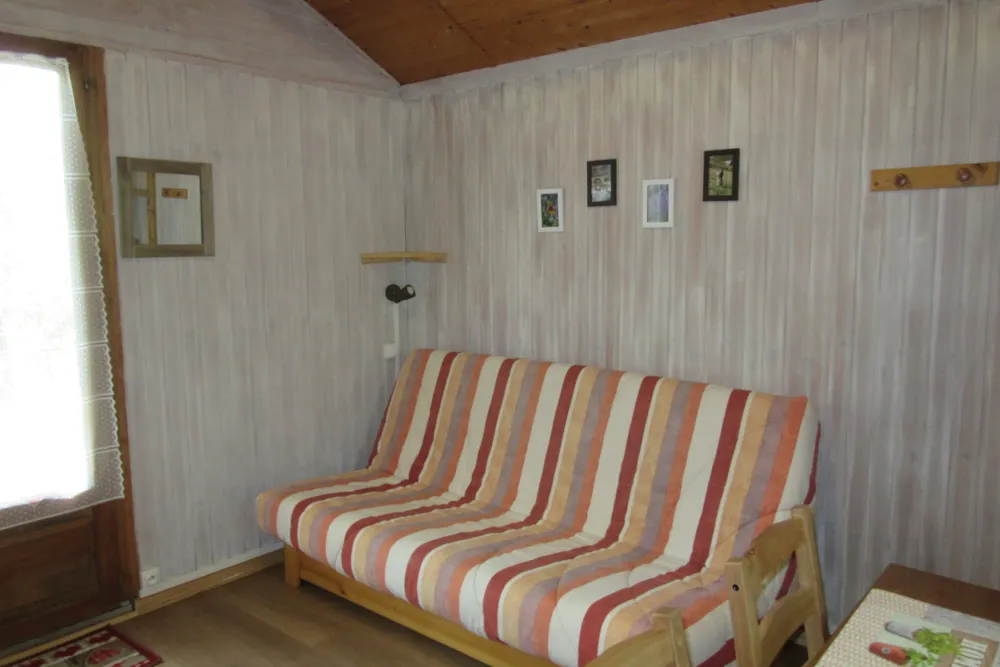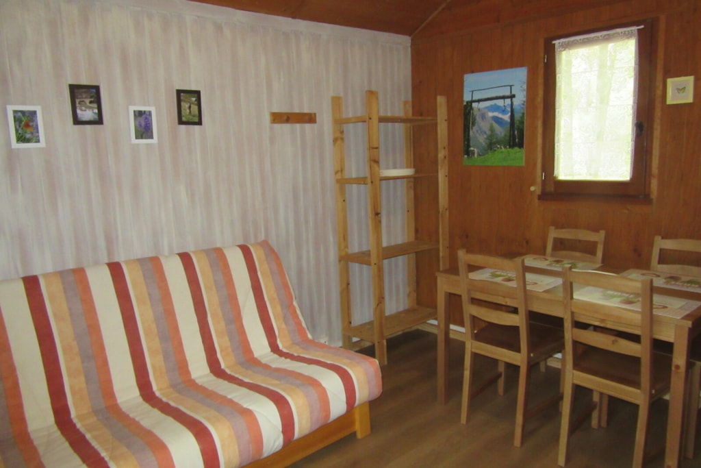 · Einen Wohnbereich mit einem Schlafsofa (2 Schlafplätze) (+ Etagenbett für 2 Personen in der Naturhütte für 4 Personen)
