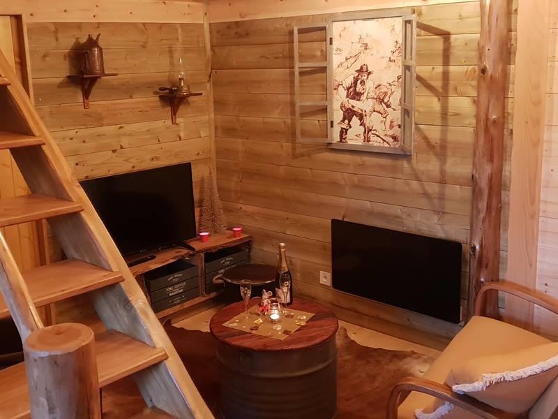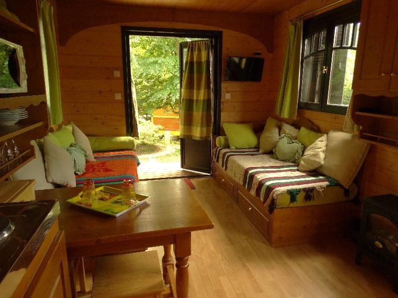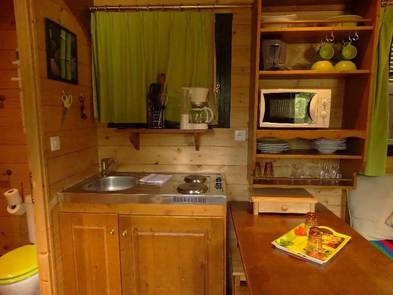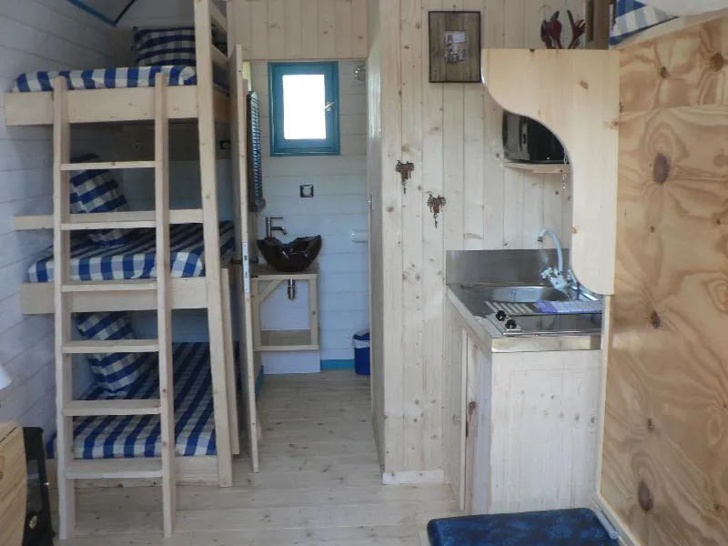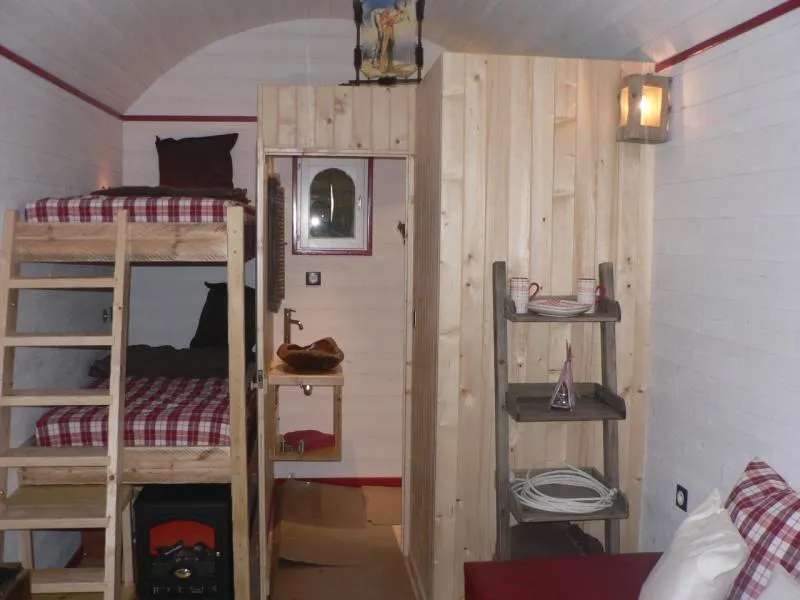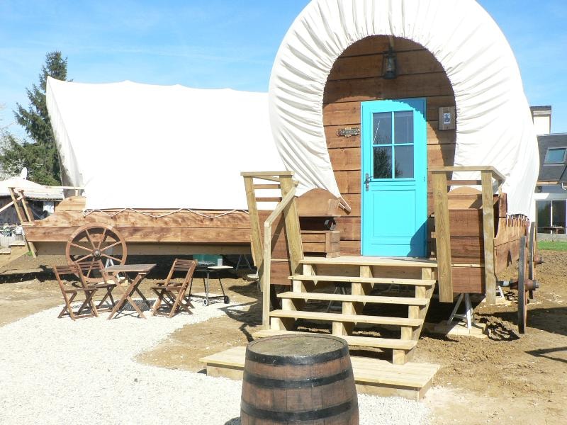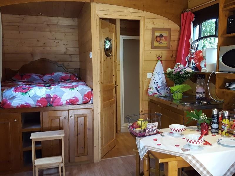 Le chariot est adapté pour les PMR (personne à mobilité réduite). Une petite cuisine fonctionnelle, une salle d'eau avec douche, lavabo, et toilette (2 petites et 2 grandes serviettes fournies) un lit double (lit fait à votre arrivée). Une ambiance chaleureuse avec un intérieur en bois et une toile extérieure décorative pour vous plonger dans l'univers des pionniers.