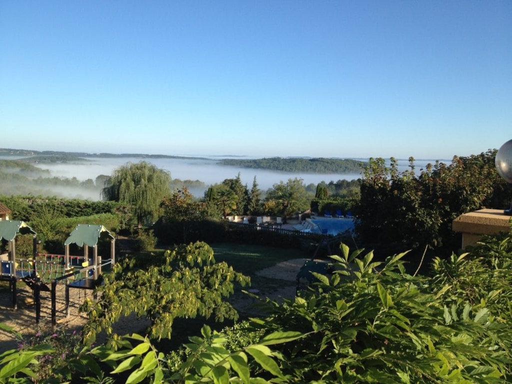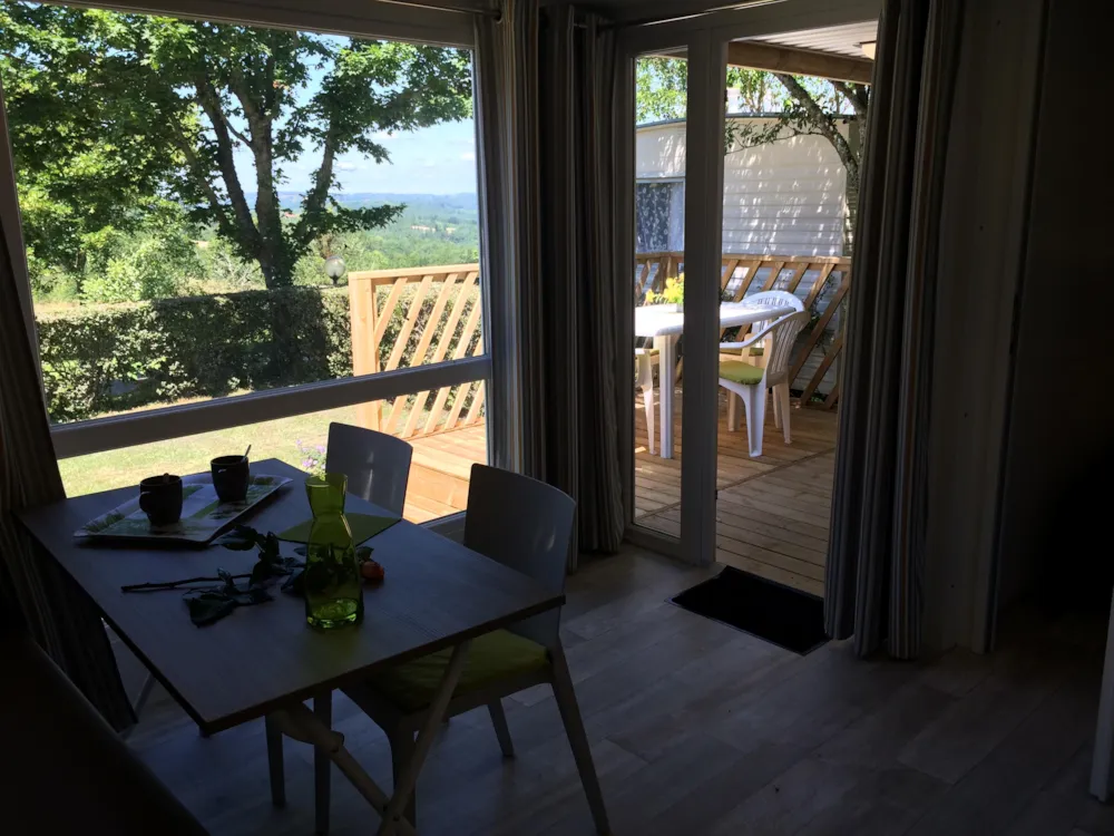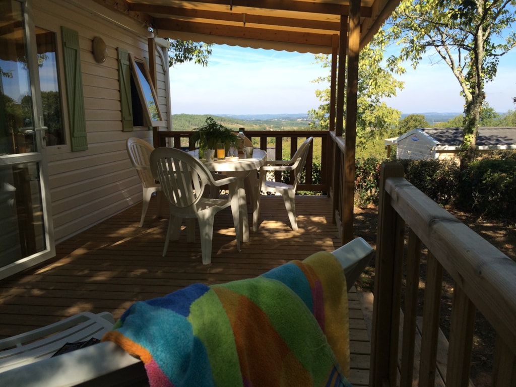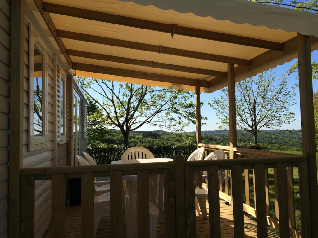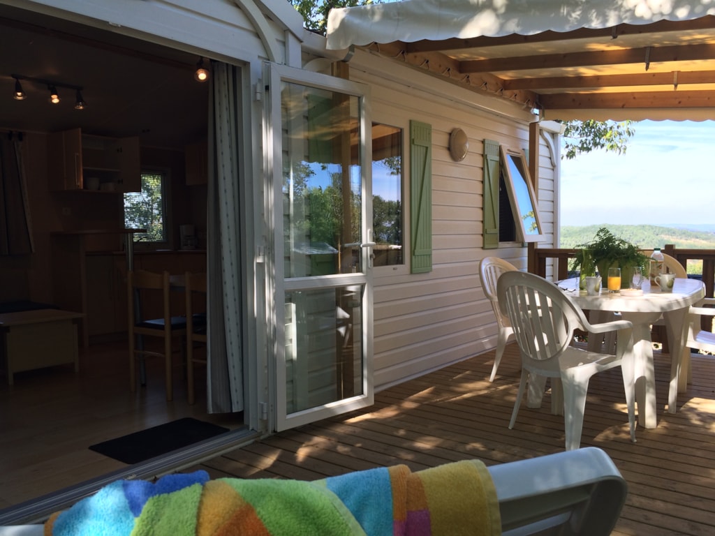 Mobil-home 2 ch et terrasse en largeur 3m , bénéficiant d'une vue imprenable sur la vallée .