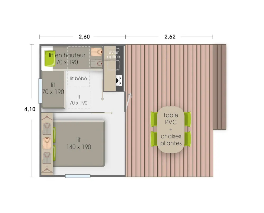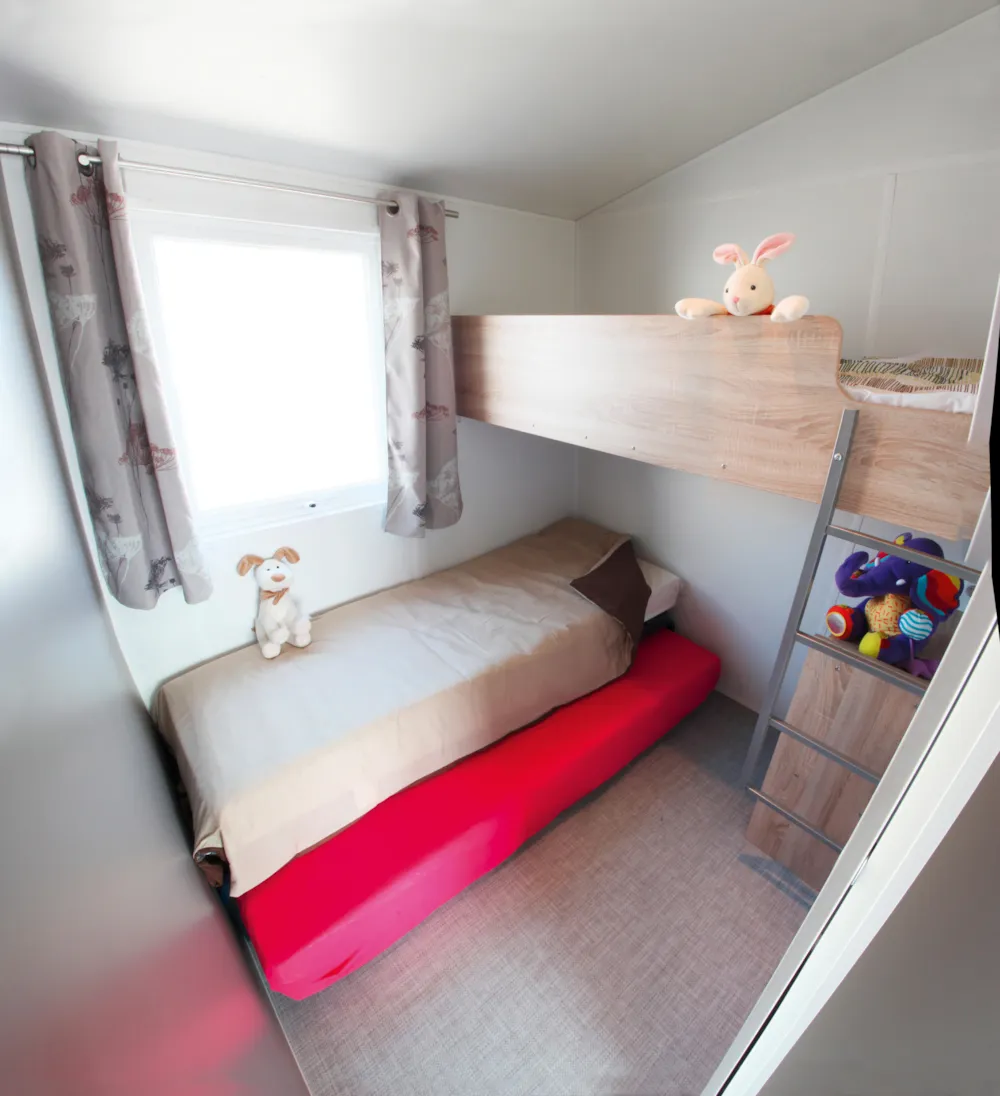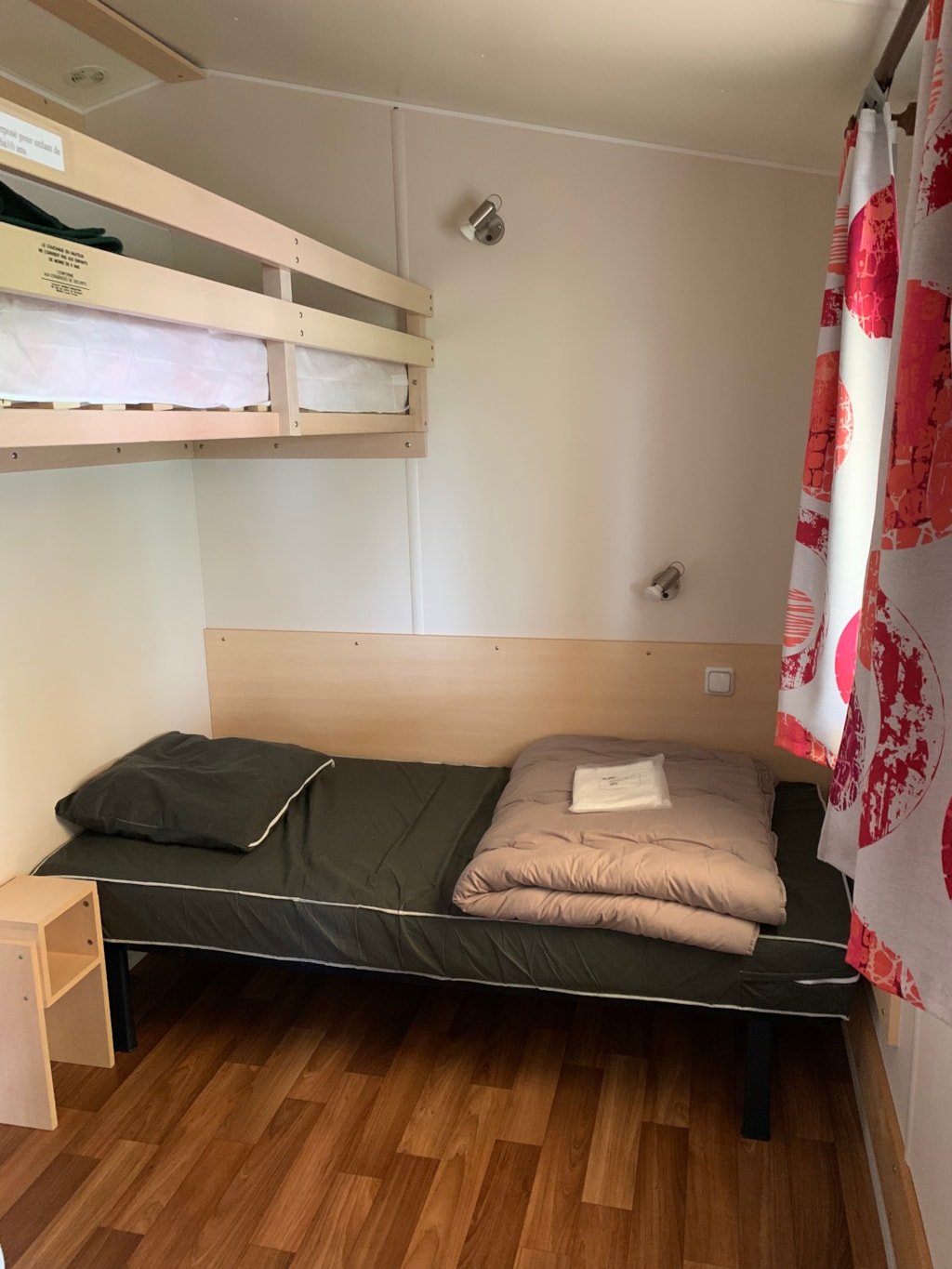 Le Mobil home ophéa dispose de 2 chambres , la 1 ère avec un lit de 140x190 , la 2ème chambre 2 lits supperposés 70x190 idéal pour les enfants, une cuisine avec frigo toble top, gazinière, micro onde,TV cafetière, la vaisselle pour 4 personnes , 1 salle de bain avec lavabo, douche et toilette et d'une terrasse couverte avec le salon de jardin.
