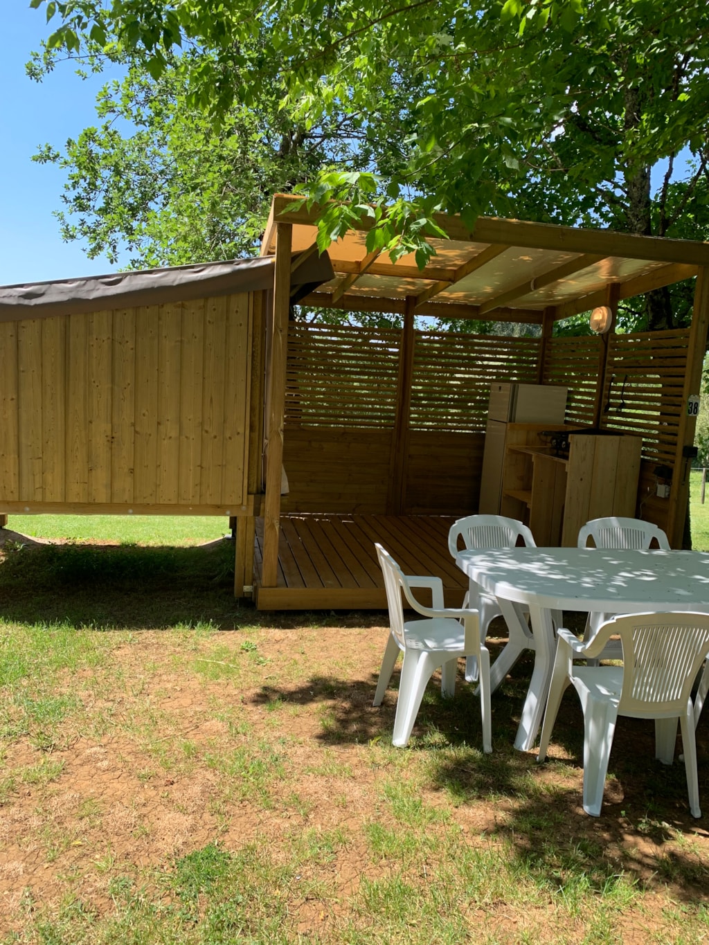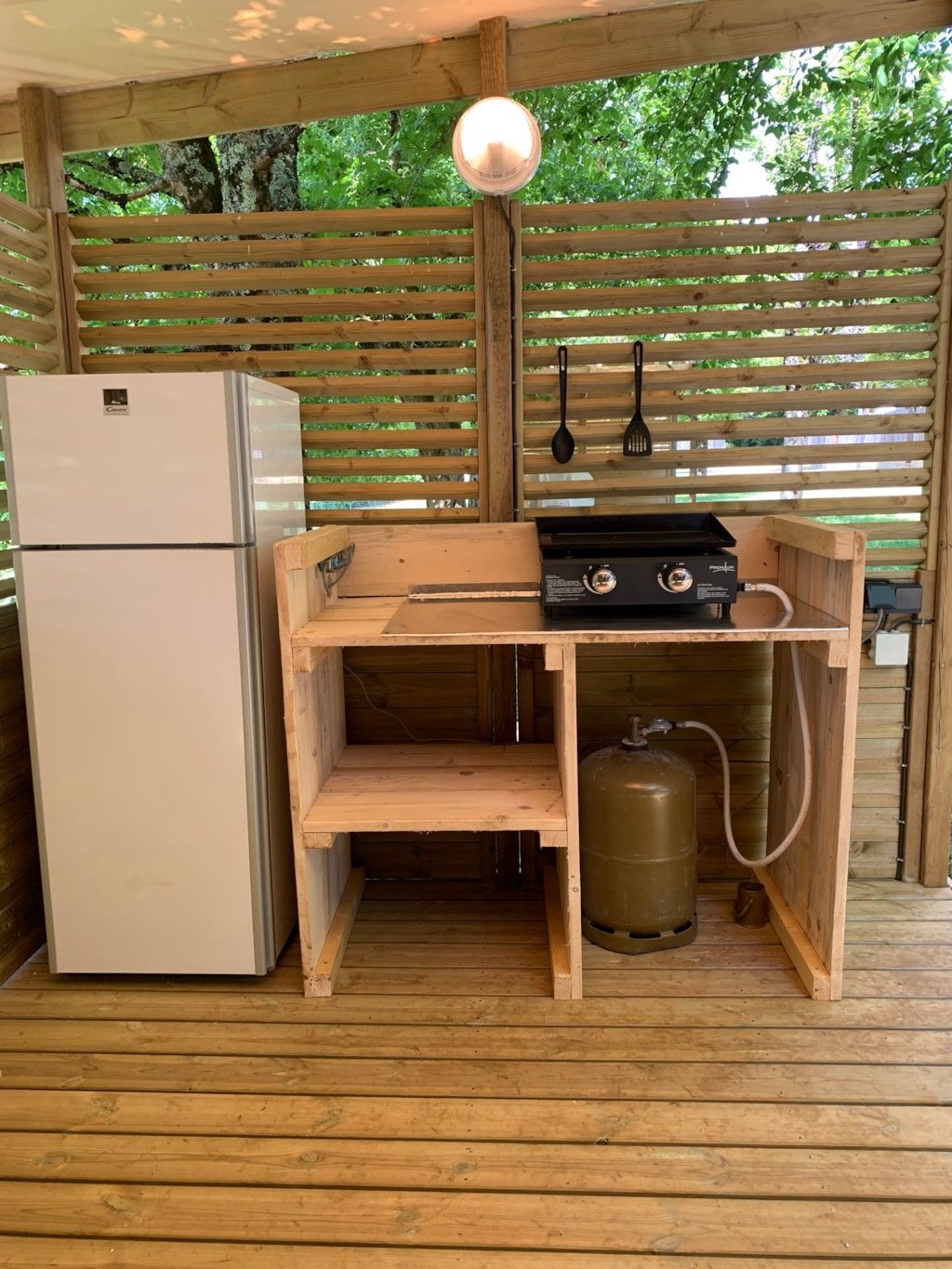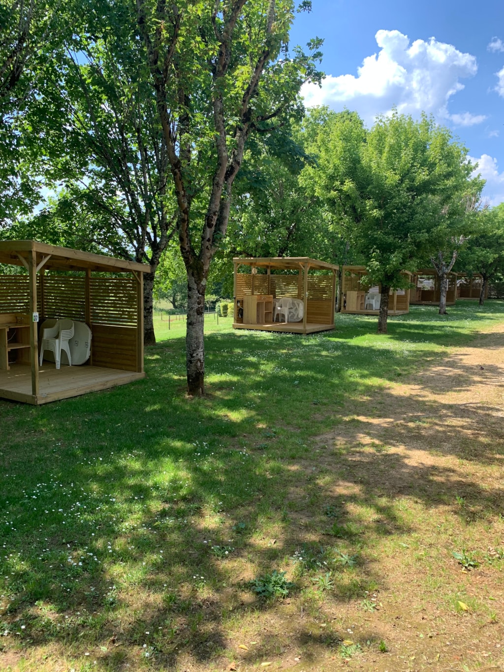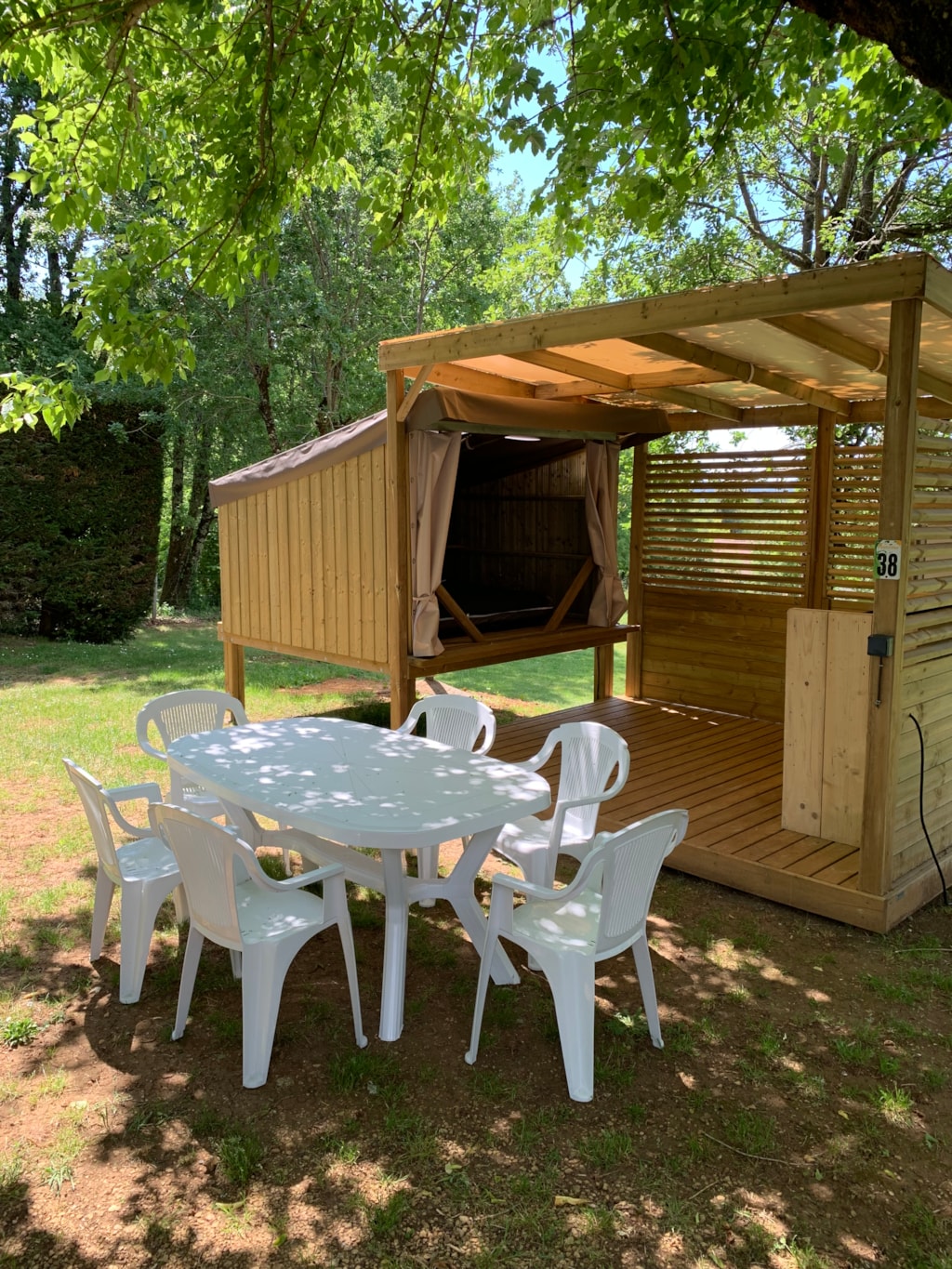 Elle se trouve sur un emplacement confort 6 personnes avec électricité une terrasse couverte,une plancha, un frigo,table, chaises . Idéale pour des marcheurs, cyclistes,motards,et en complément de couchages pour un van aménagé,tente,caravane .....