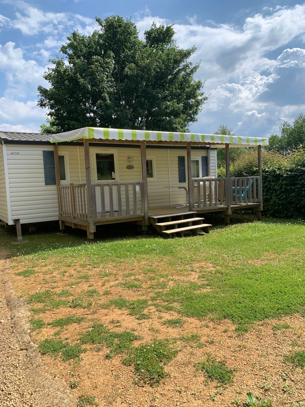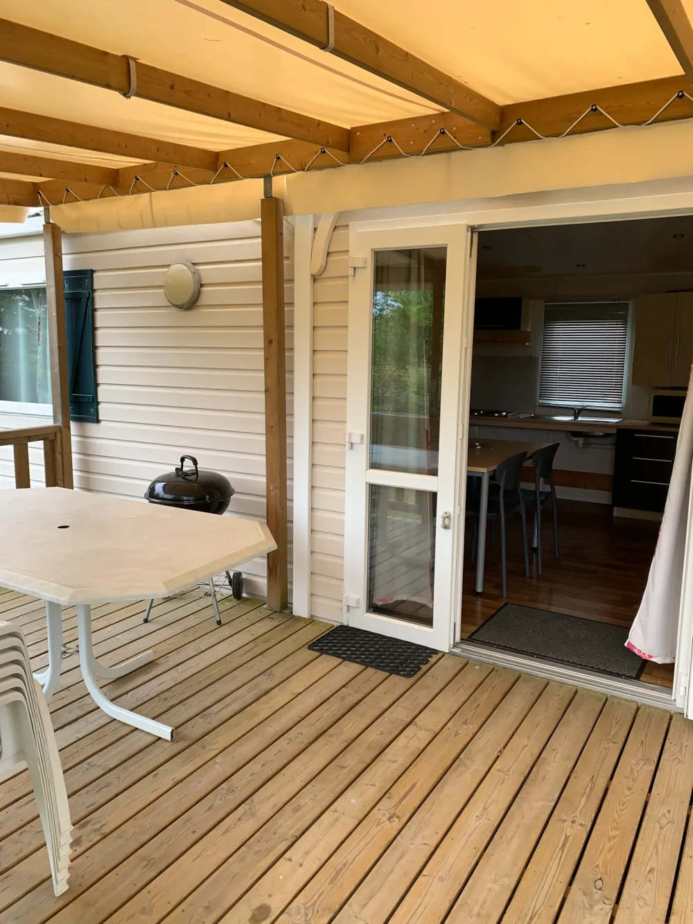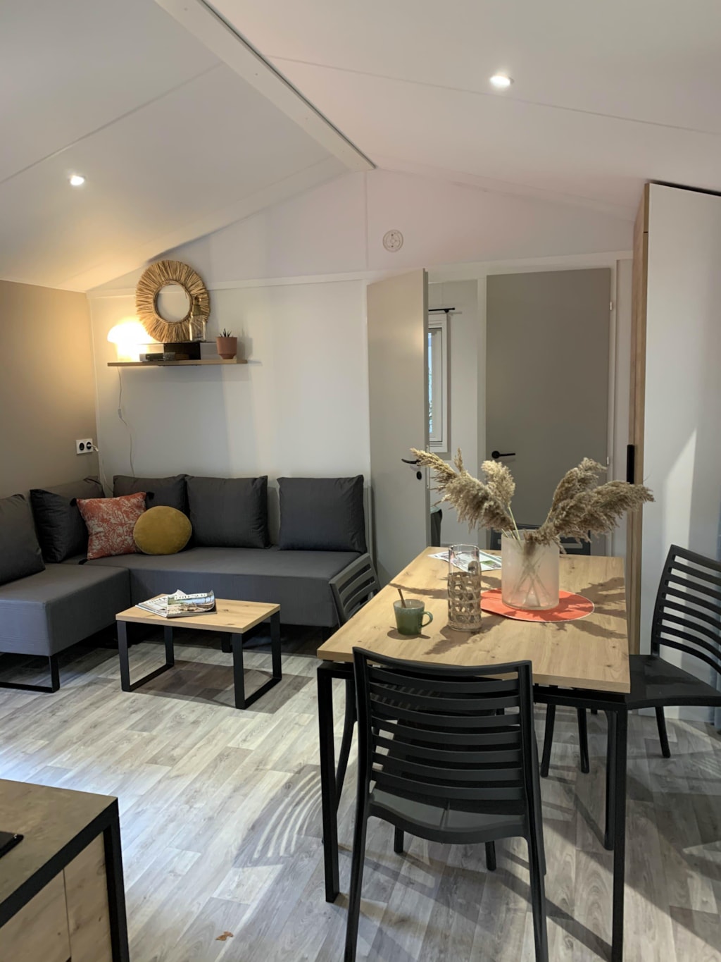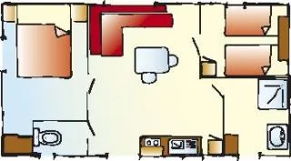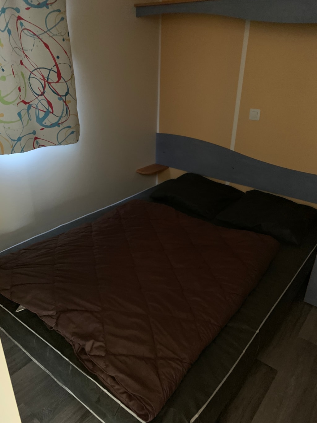 Le Mobil home Grand Confort dispose de 2 chambres , la 1 ère avec un lit de 160x190 , la 2ème chambre 2 lits 70x190 ,1 banquette lit pour la 5 ème personnes. Une cuisine avec un grand frigo + freezer , gazinière, micro onde,TV, cafetière à filtres, la vaisselle pour 5 personnes , 1 salle de bain avec lavabo, douche . Un toilette séparré et une terrasse couverte avec le salon de jardin.