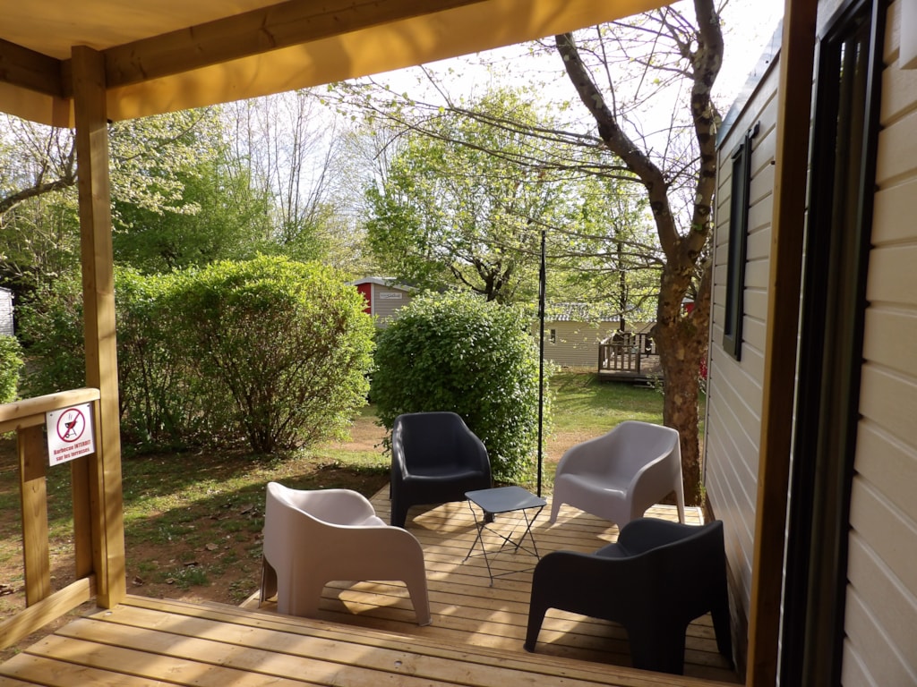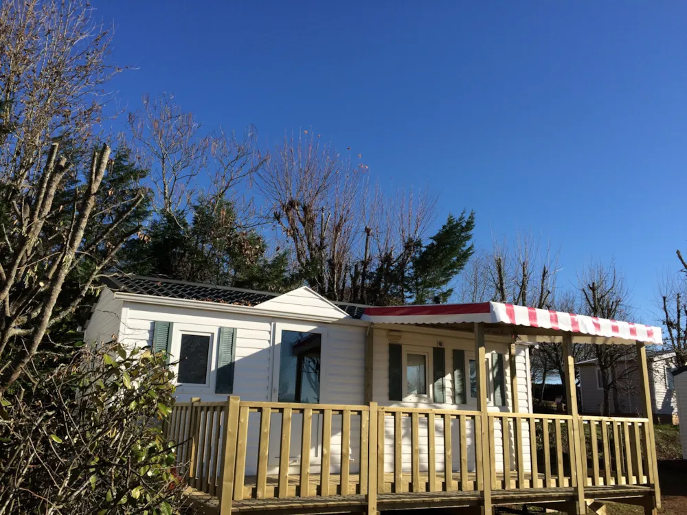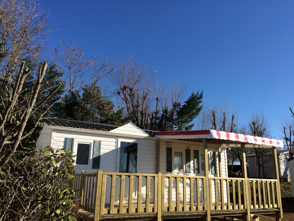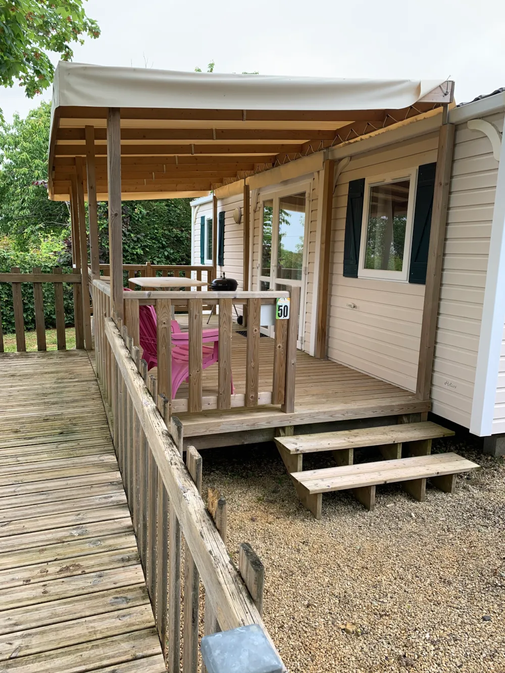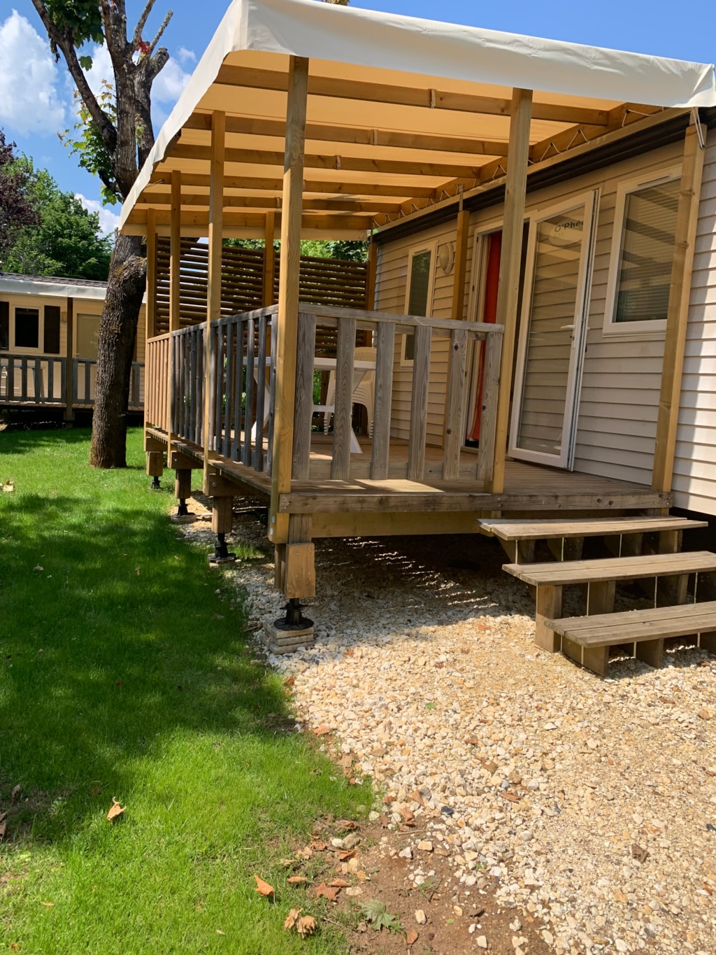 Le Mobil home Grand Confort dispose de 2 chambres , la 1 ère avec un lit de 160x190 , la 2ème chambre 2 lits 70x190 ,1 banquette lit pour la 5 ème personnes. Une cuisine avec un grand frigo + freezer , gazinière, micro onde,TV, cafetière à filtres, la vaisselle pour 5 personnes , 1 salle de bain avec lavabo, douche . Un toilette séparré et une terrasse couverte avec le salon de jardin.