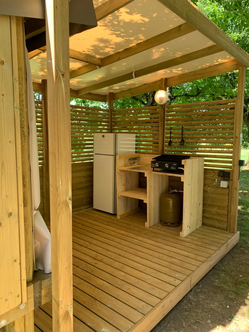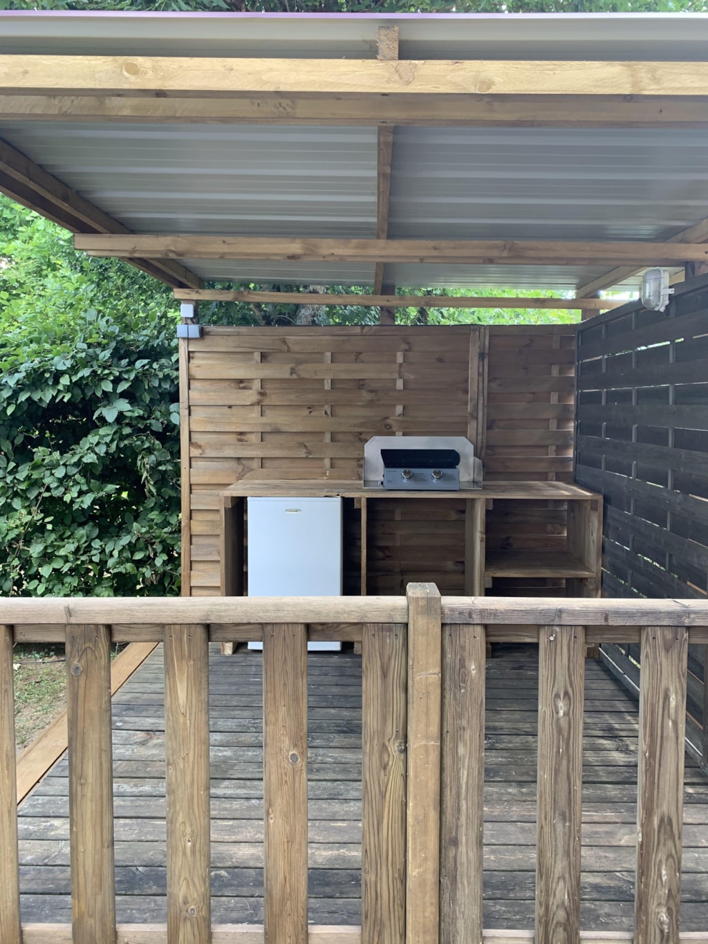 Strom Überdachte Holzterrasse mit Kühlschrank und Plancha