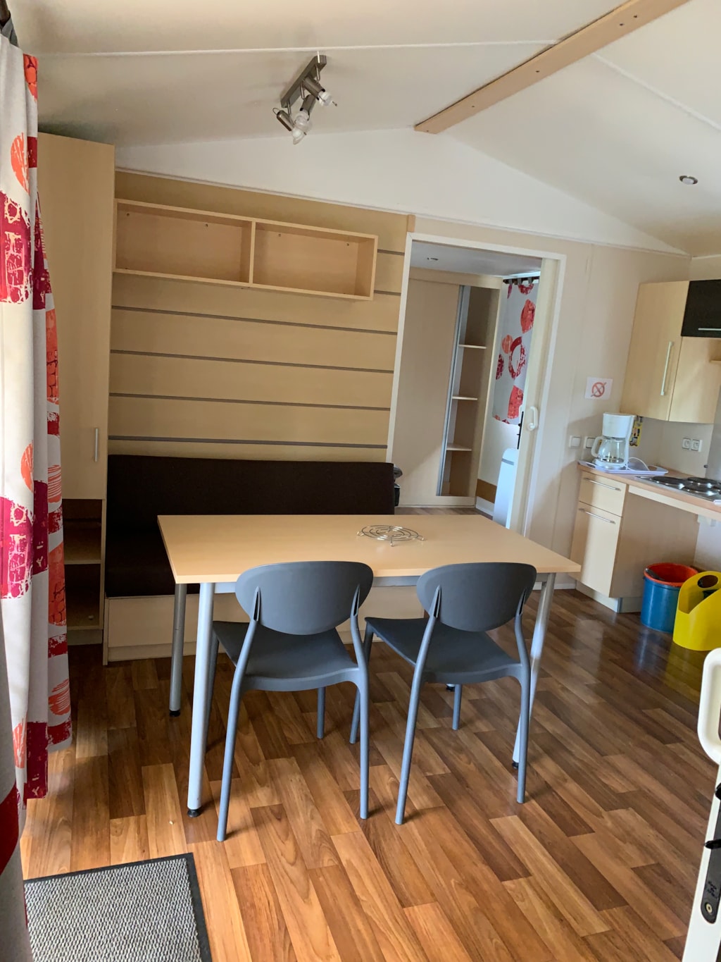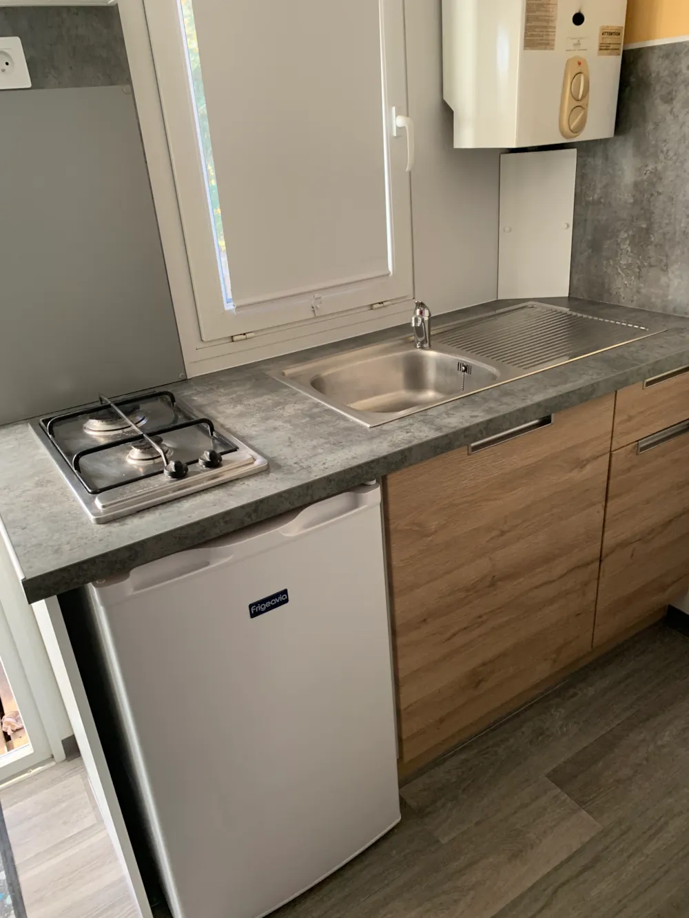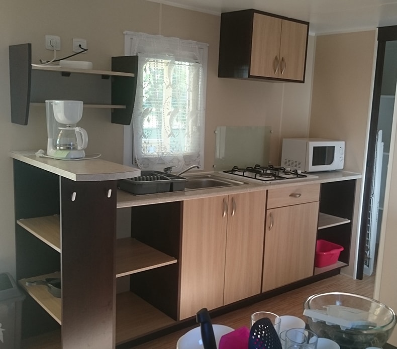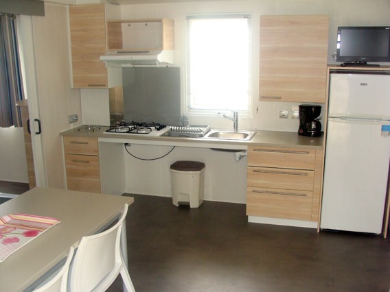 Mobil home tout confort. avec accès sur la terrasse, 2 chambres avec 1 lit de 140 et 2 lits de 80. cuisine avec évier,1 frigo, 1plaque de cuisson, micro onde ,une douche avec lavabo, 1 wc.