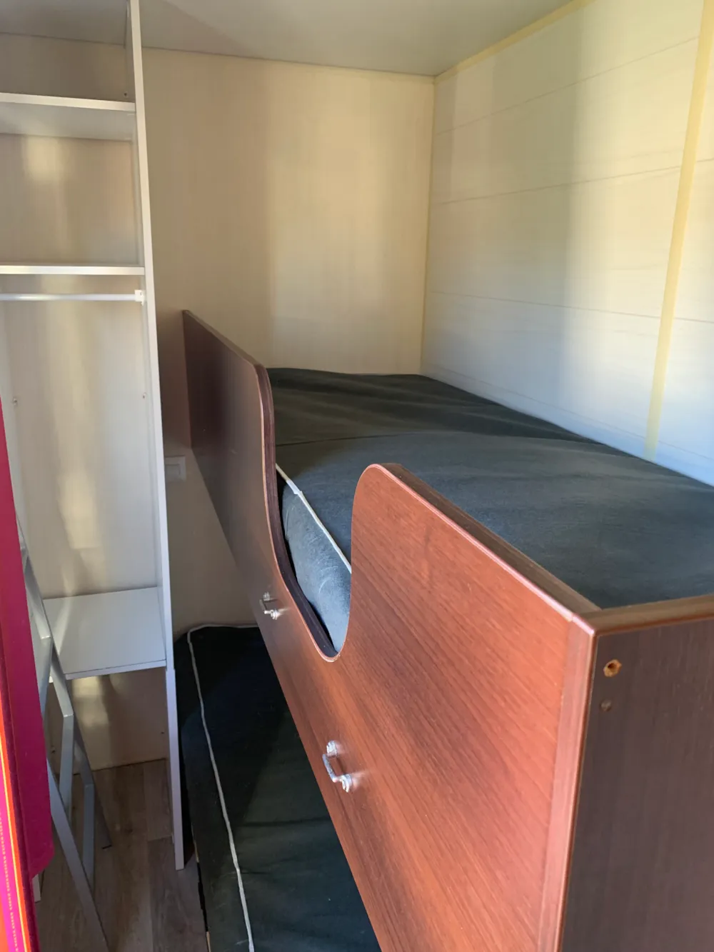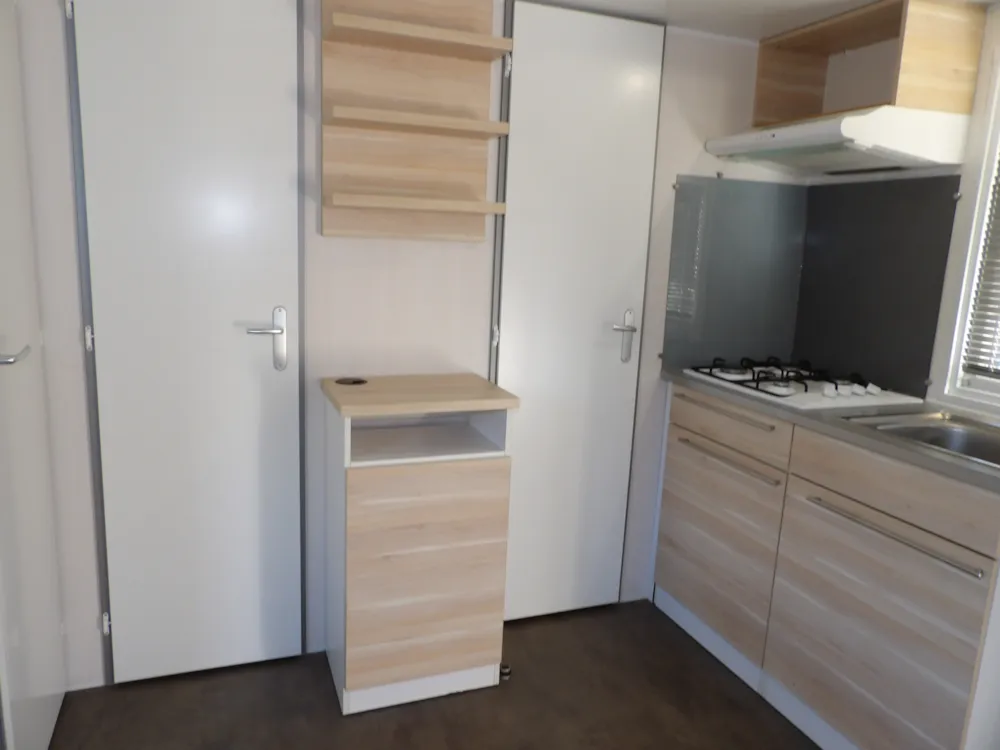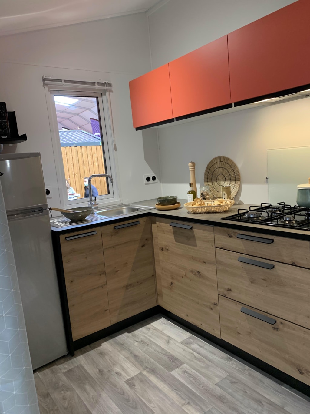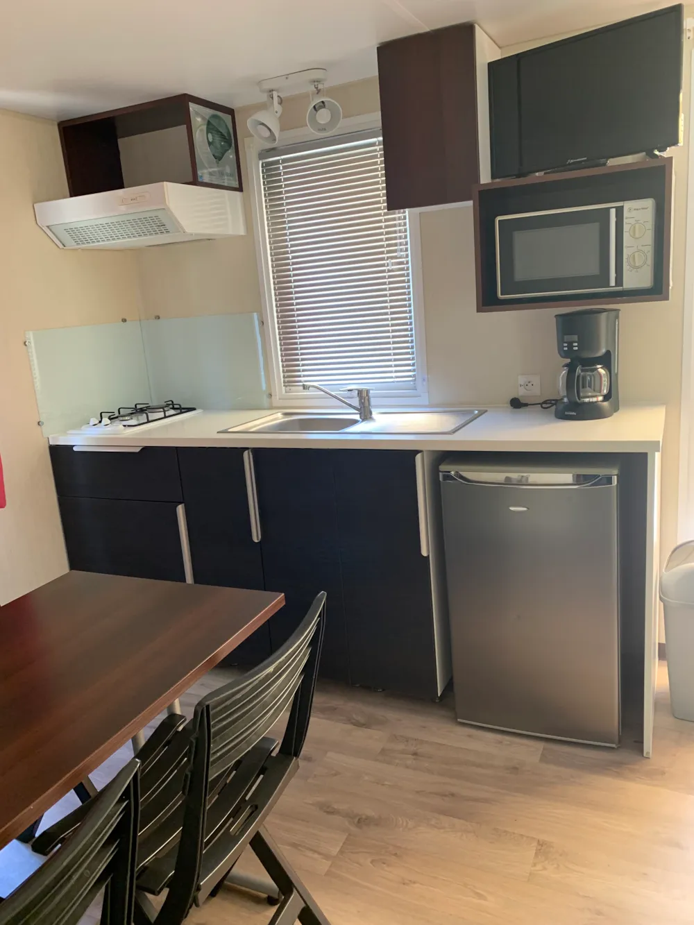 Mobil home tout confort. avec accès sur la terrasse, 2 chambres avec 1 lit de 140 et 2 lits de 80. cuisine avec évier,1 frigo, 1plaque de cuisson, micro onde ,une douche avec lavabo, 1 wc.