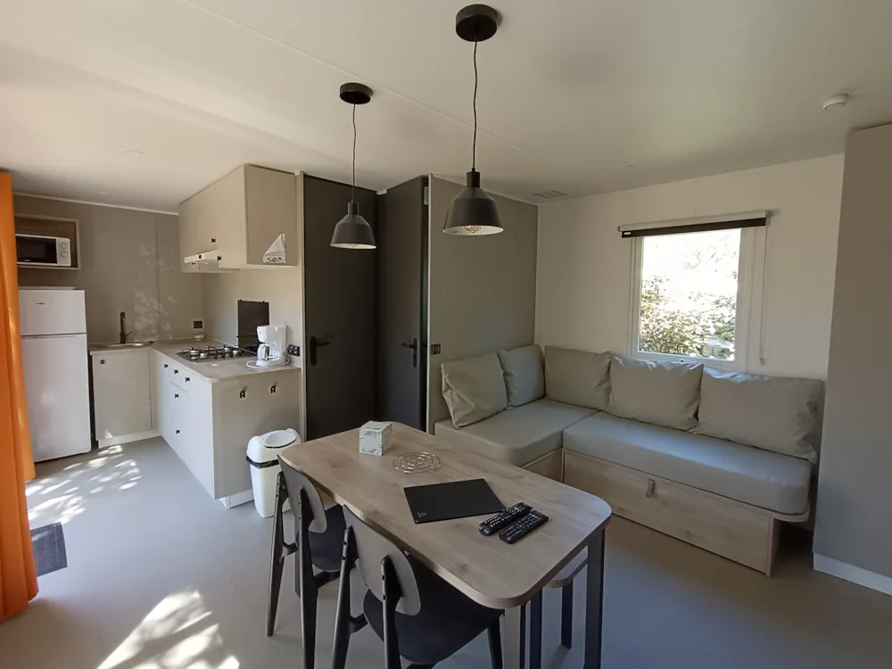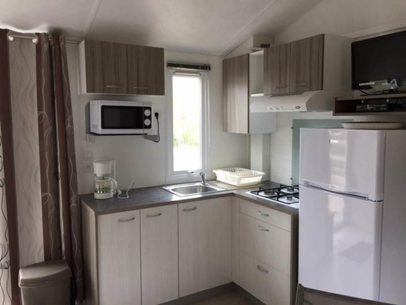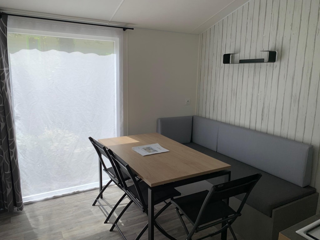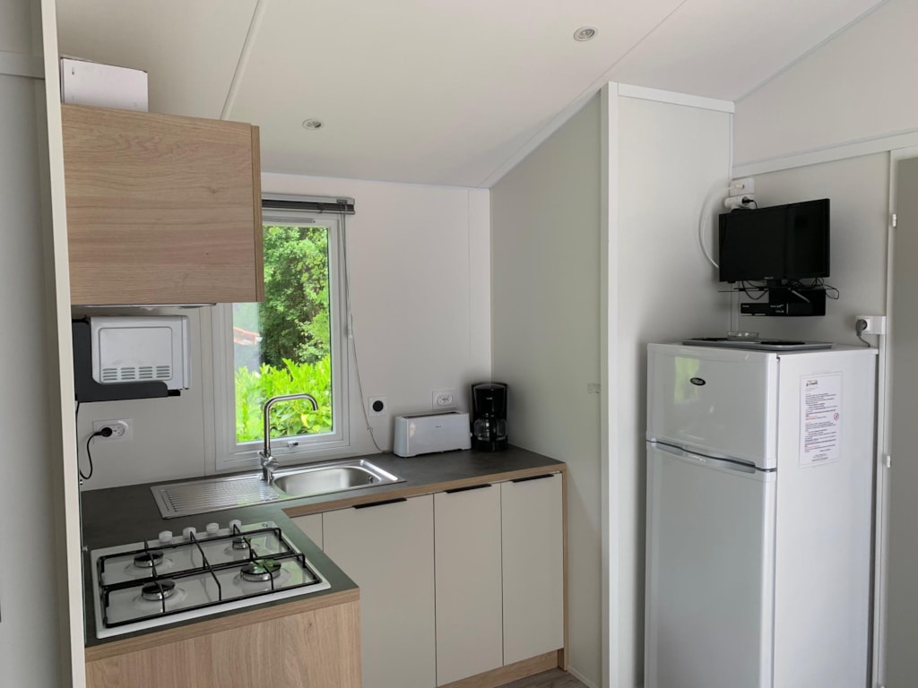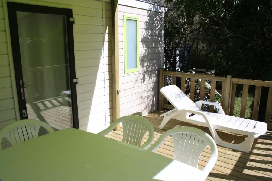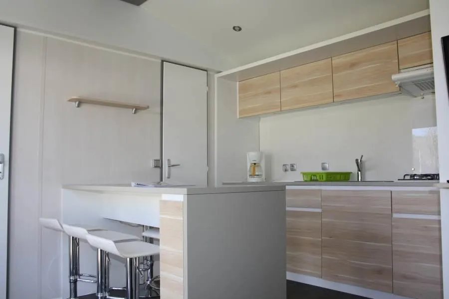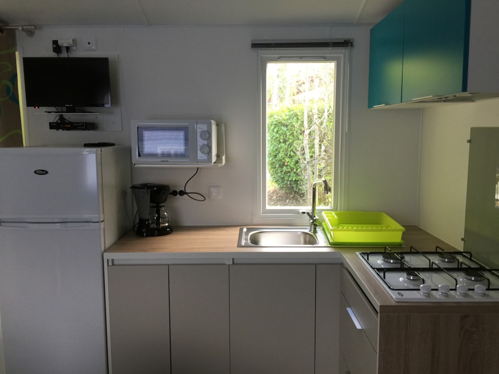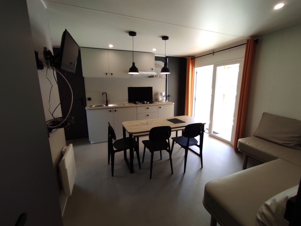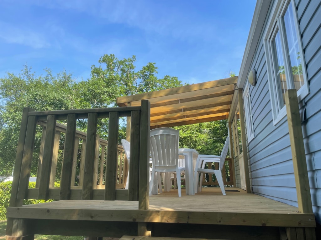 Grand Mobil'home O'hara avec grande terrasse et TV incluse. Îlots centrale et coin salon. 3 chambres; salle de bain équipé d'un sèche cheveux.