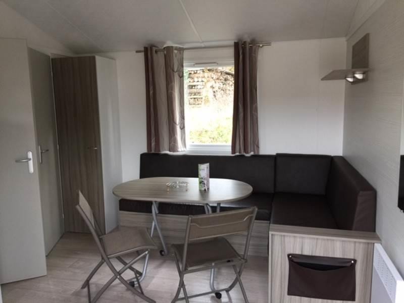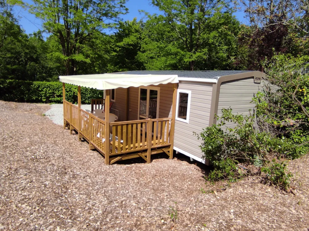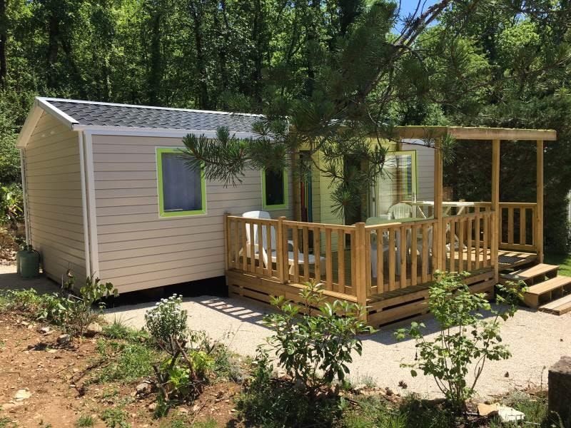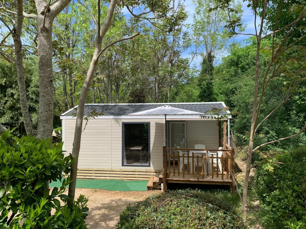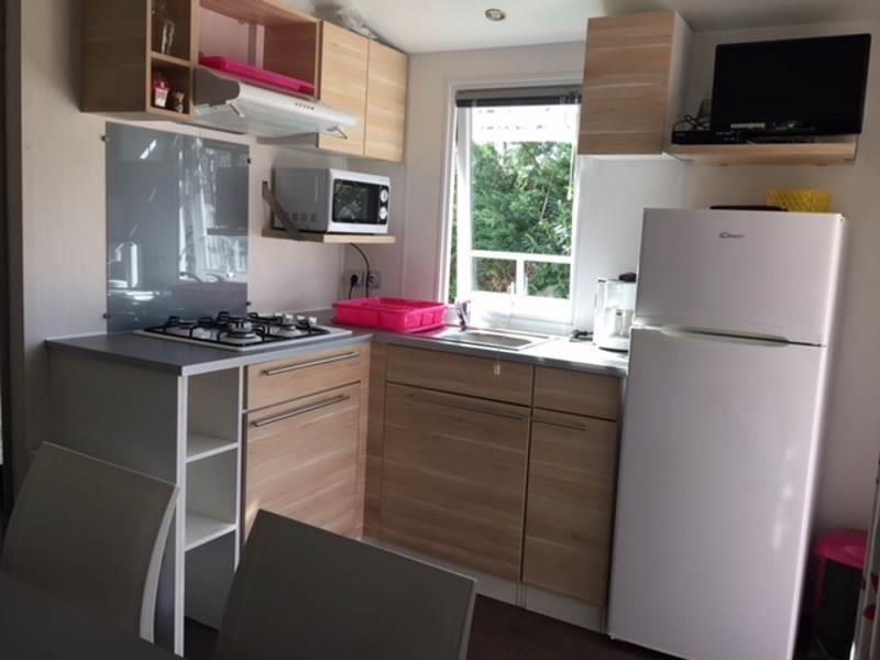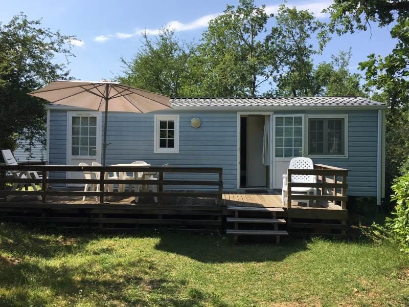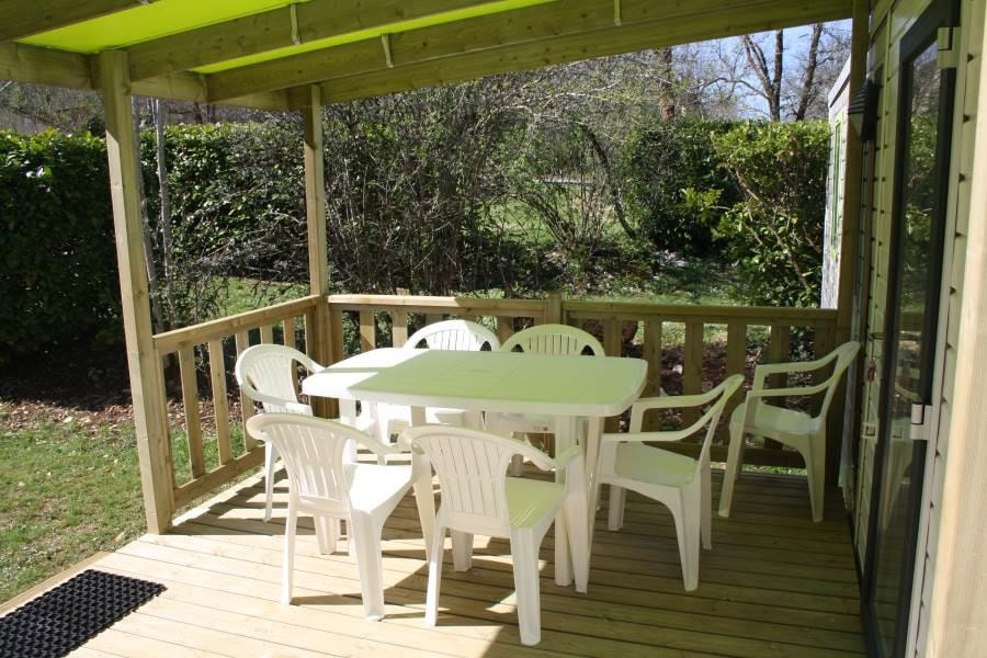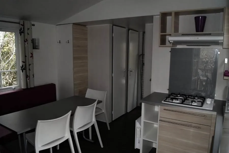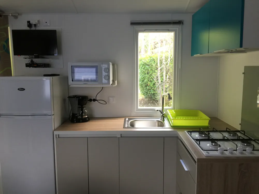 Grand Mobil'home O'hara avec grande terrasse et TV incluse. Îlots centrale et coin salon. 3 chambres; salle de bain équipé d'un sèche cheveux.