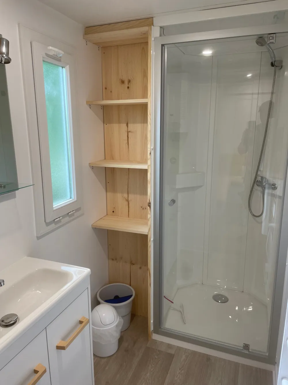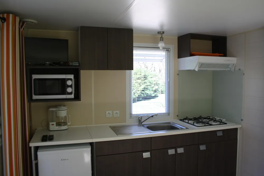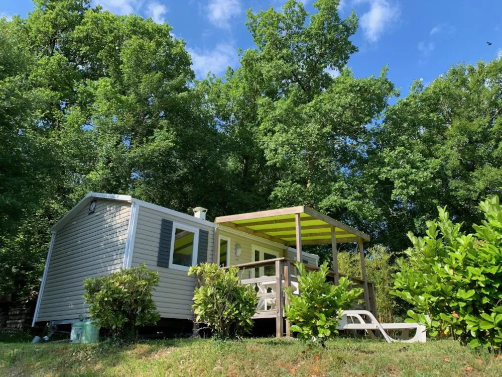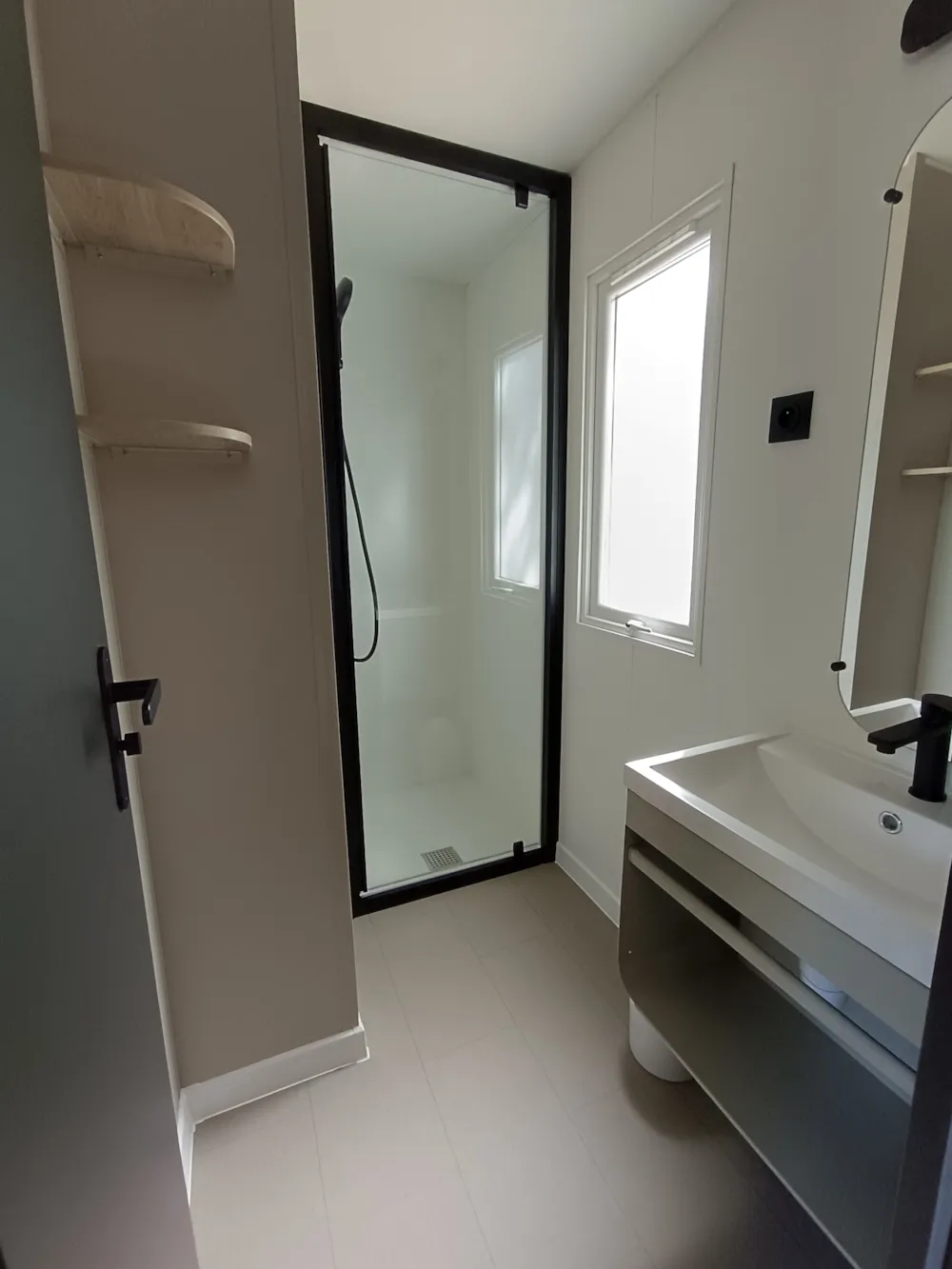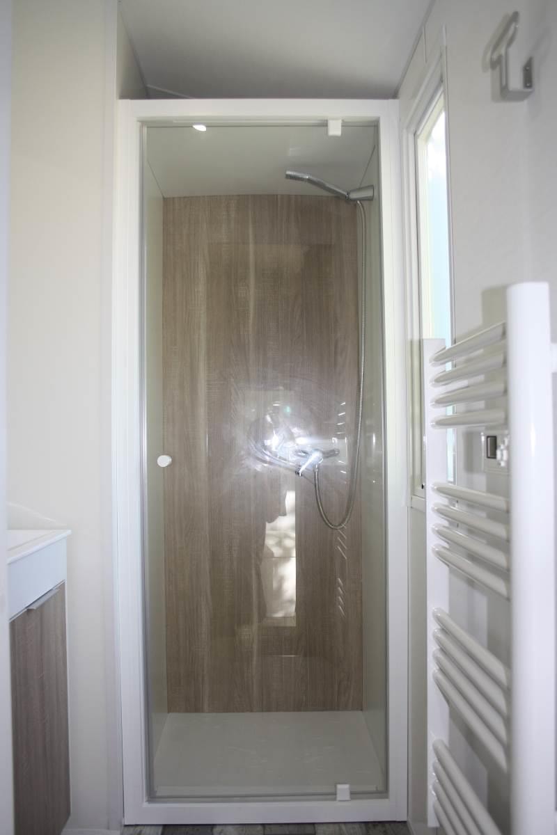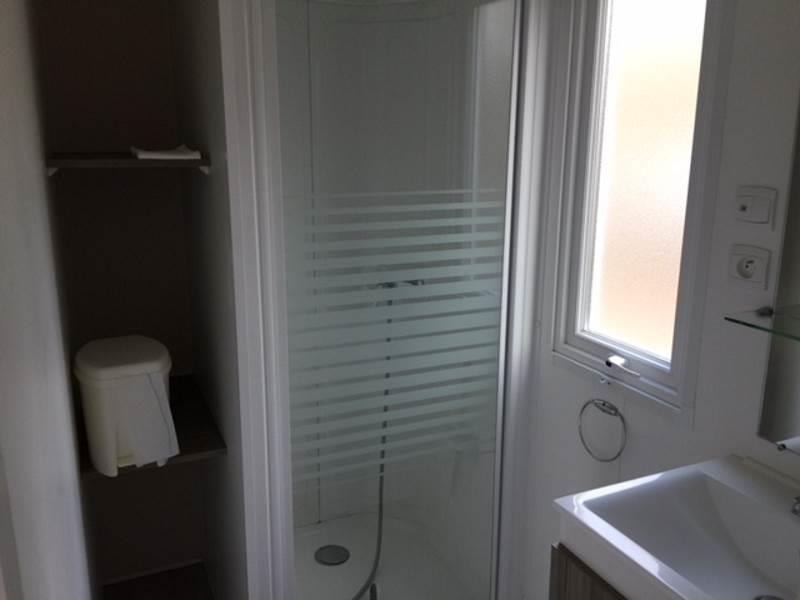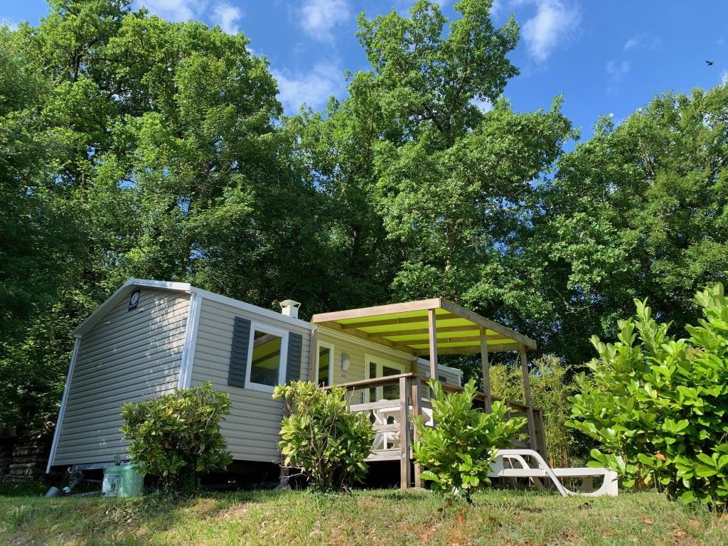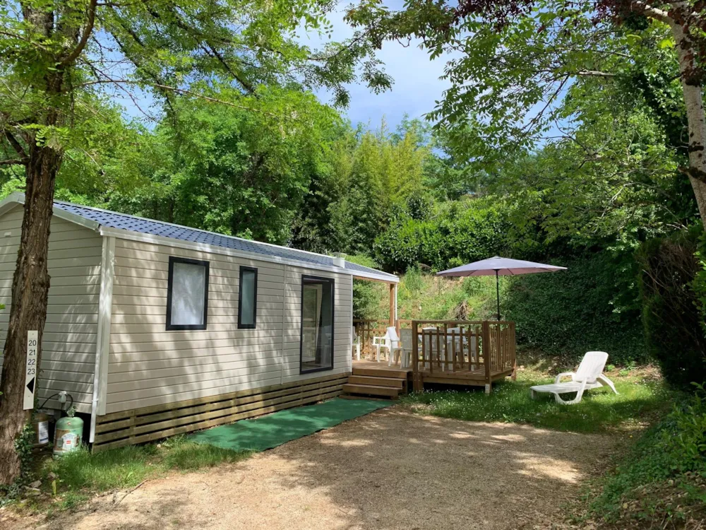 Grand Mobil'home O'hara avec grande terrasse et TV incluse. Îlots centrale et coin salon. 3 chambres; salle de bain équipé d'un sèche cheveux.