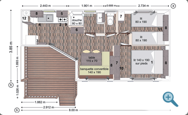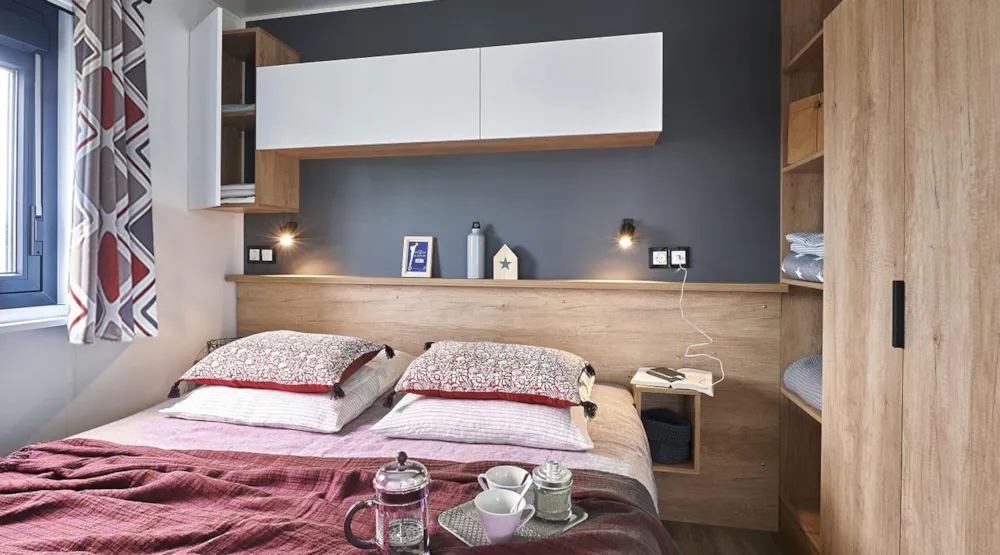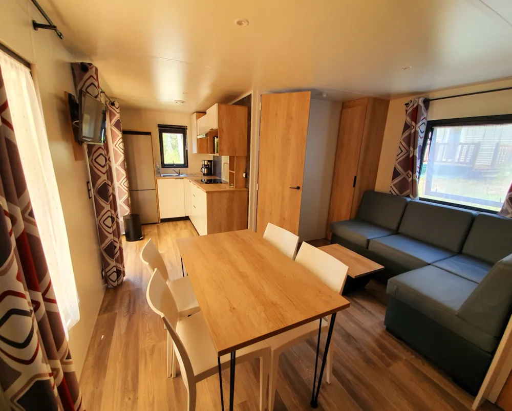 With the "Cotton lodge nature" Safari tent, you'll rediscover the authentic spirit of camping and the pleasures of outdoor holidays in a canvas tent set on a wooden floor, a large living room, 2 bedrooms with real beds and a rattan sofa to enjoy the view of the lake, a kitchenette with fridge/freezer and gas stove,