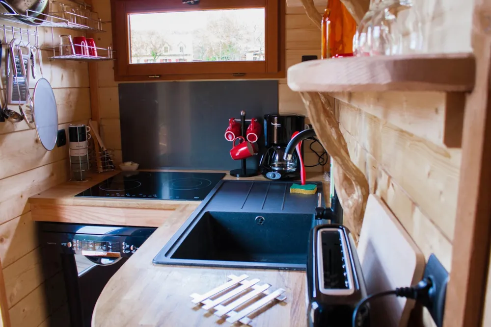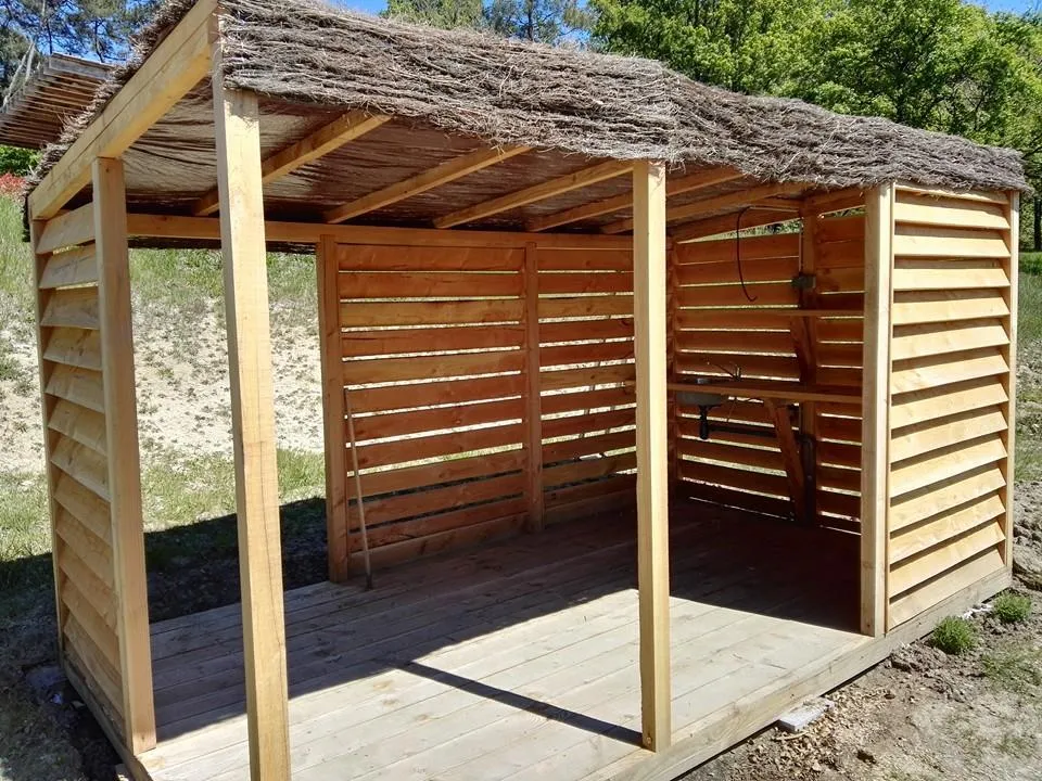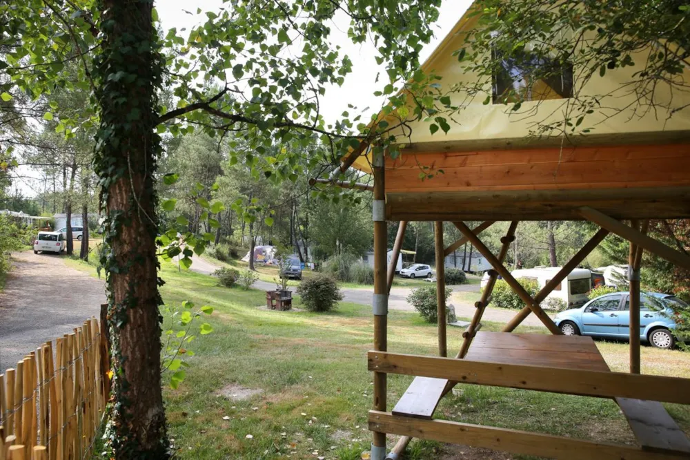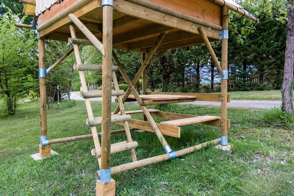 A small ladder leads to the perched bedroom with 2 single beds. And underneath, in the shade, a picnic table with two benches. You can set up a small tent next door for the children.