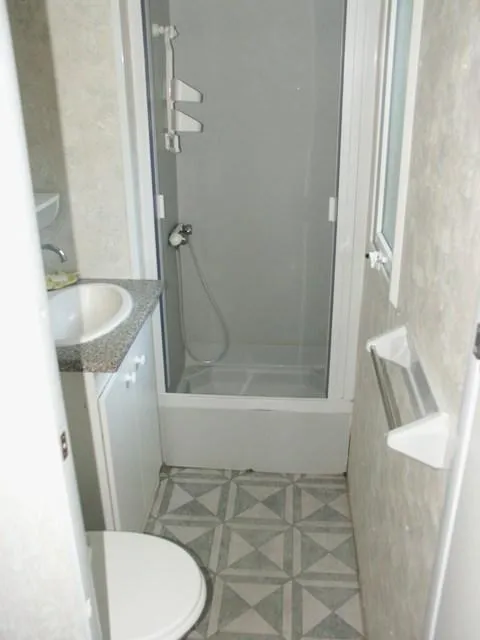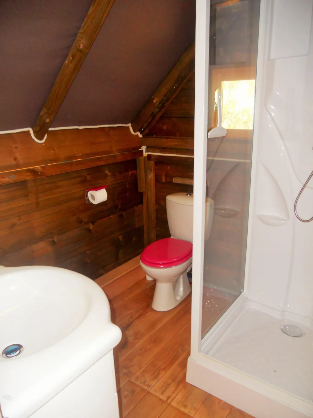 Douche, vaisselle, WC au sanitaire du camping (seau avec sciure mis à disposition, façon toilettes sèches, pour parer aux situations d'urgence)