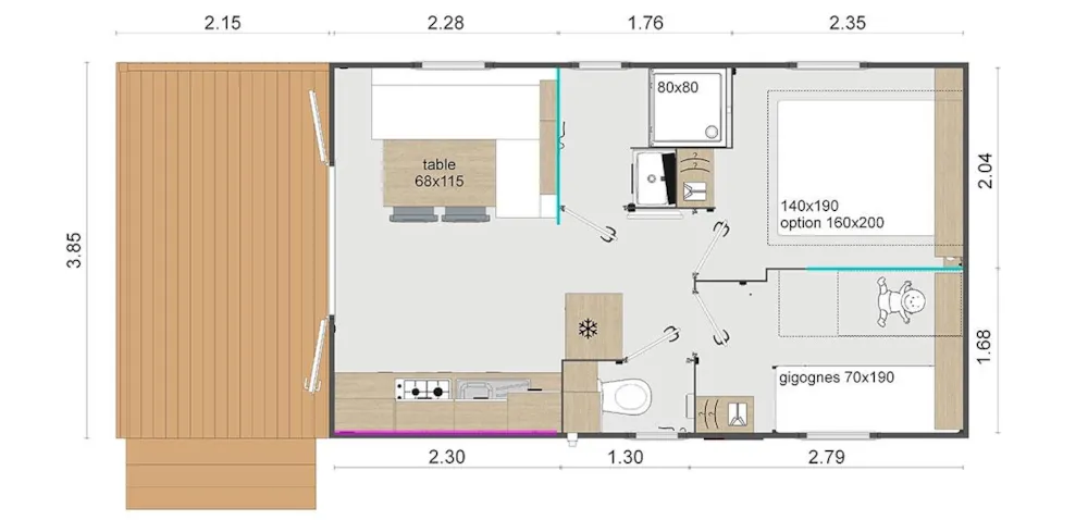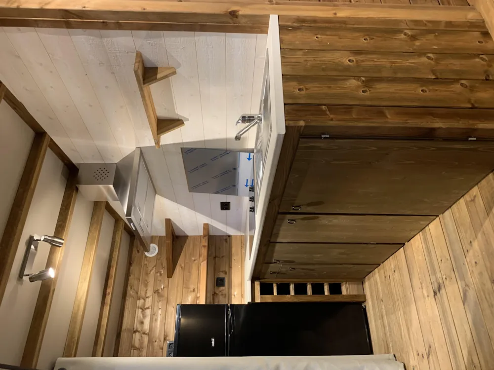 A l'intérieur (12 m2), 2 petites pièces : une chambre avec un lit 2 pers, et un espace à vivre avec une table, deux bancs, un meuble de rangement