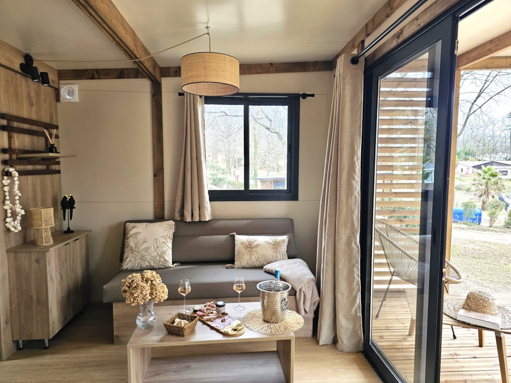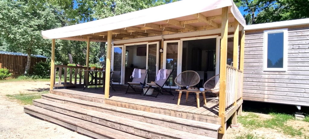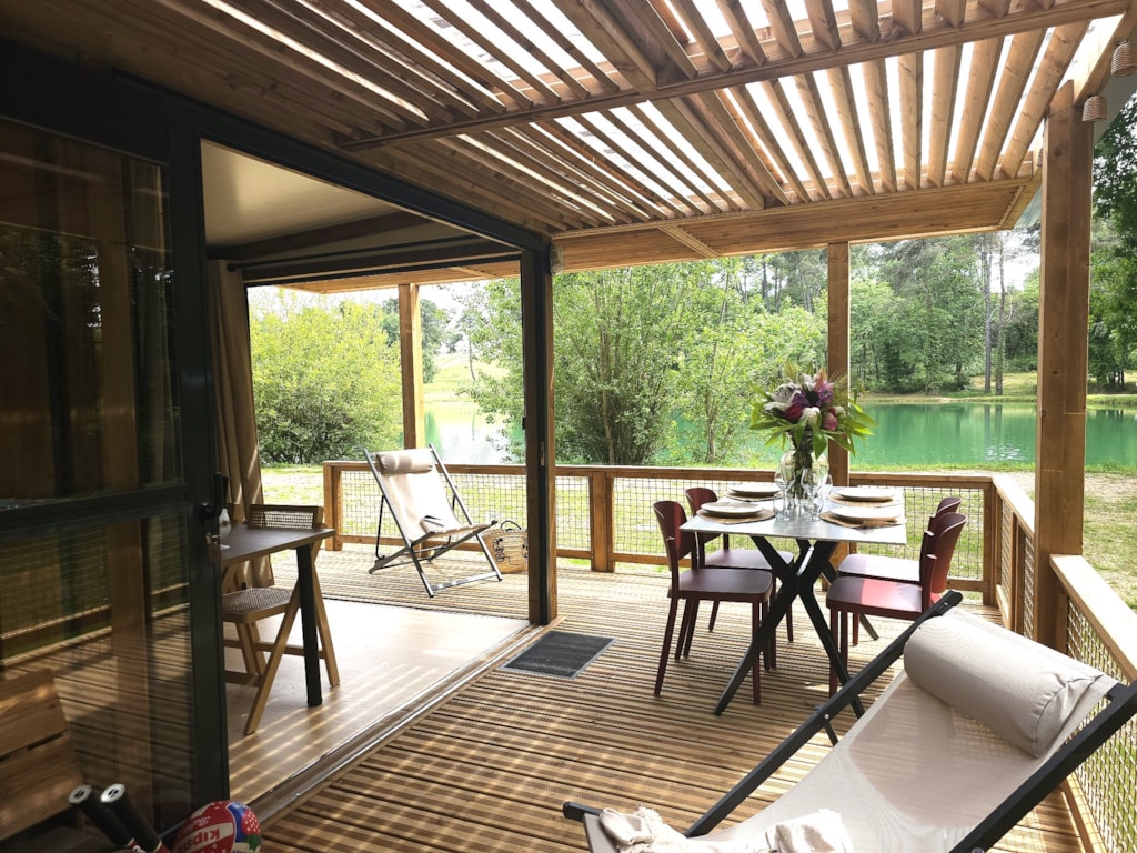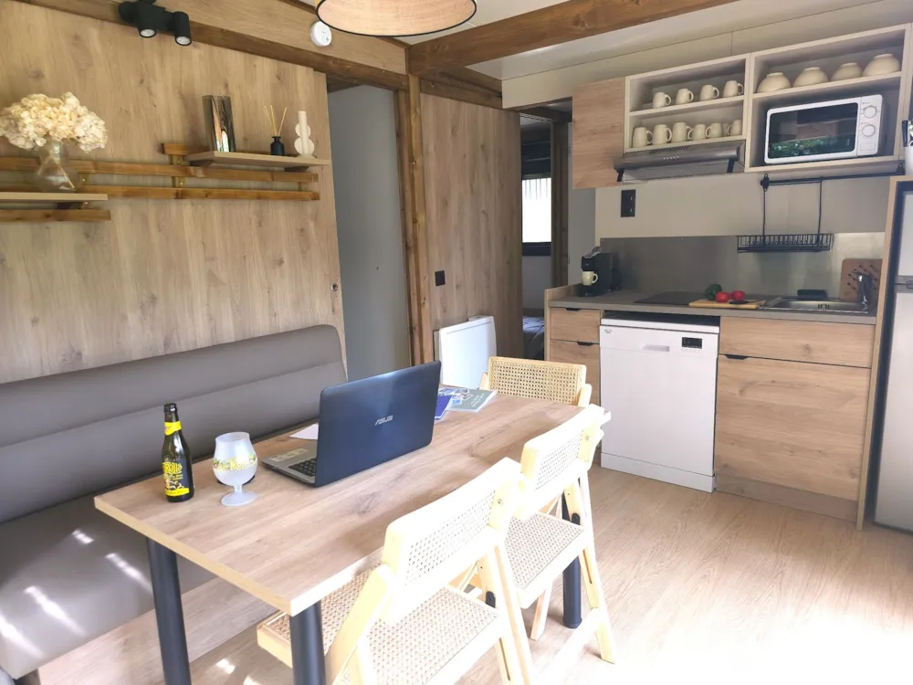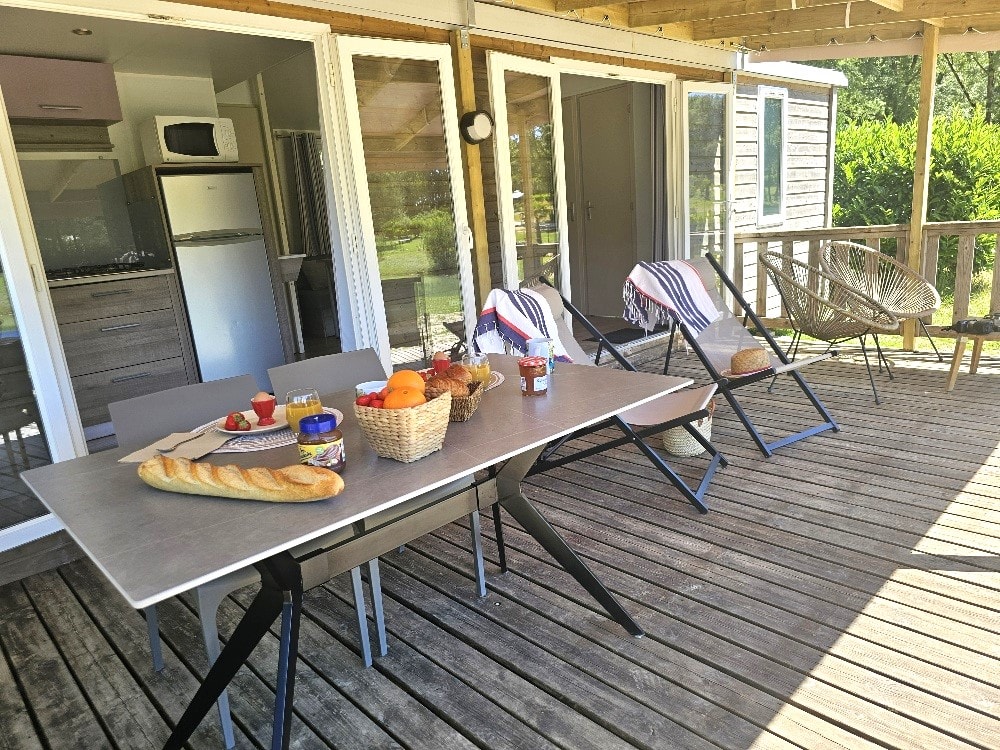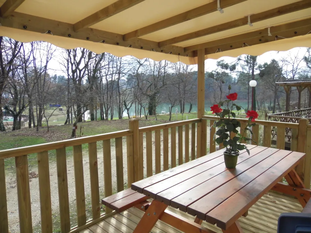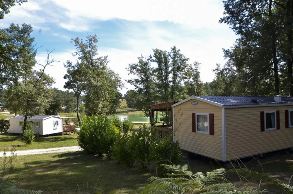 Mit Blick auf das Wasser und umgeben von Grün – dieses Mobilheim vereint Raum, Komfort und Ruhe im Herzen der Natur.