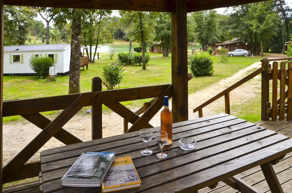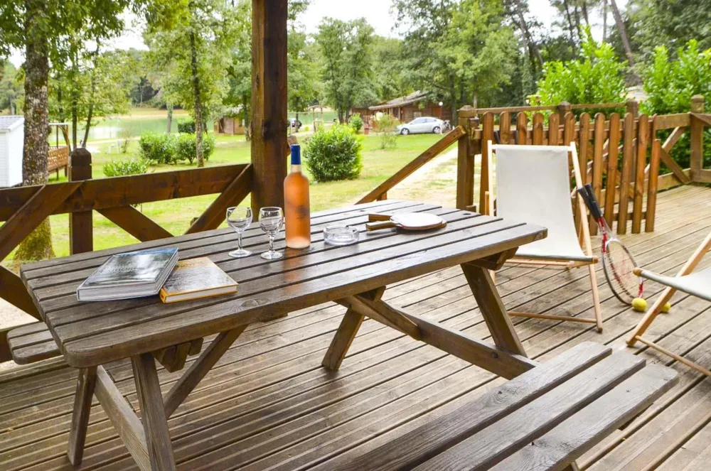 Draußen lädt eine überdachte Holzterrasse dazu ein, Ihre Mahlzeiten zu genießen oder einfach zu entspannen, während Sie den Blick auf den Wald und das Zwitschern der Vögel genießen.